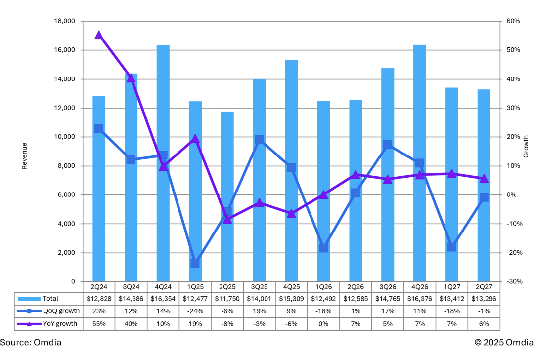 2025年第三季度和第四季度,AMOLED营收预计将分别实现19%和9%的环比增长。这一营收增长主要由低温多晶氧化物(LTPO)背板柔性AMOLED智能手机显示屏,以及低温多晶硅(LTPS)背板移动PC显示屏的出货量增长所推动。2025年,AMOLED出货量预计将在第三季度环比增长10%,第四季度环比增长7%。