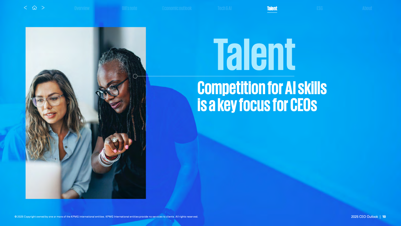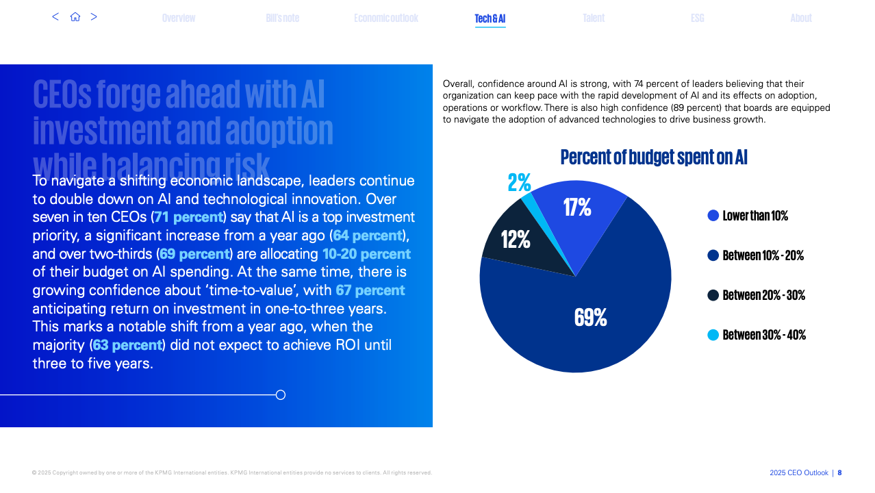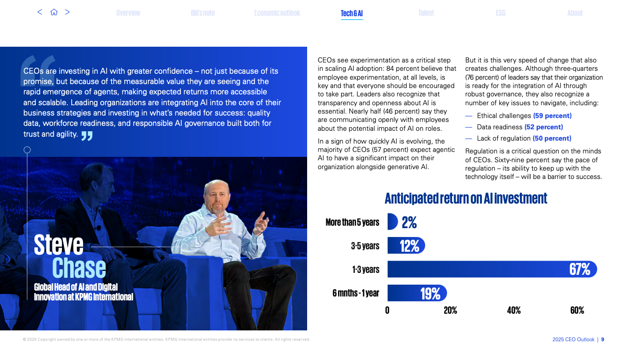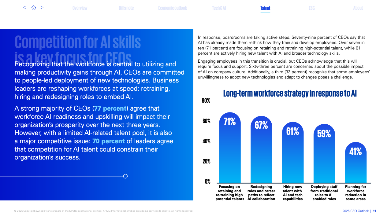 AI已成为战略核心。71%的CEO将AI列为头号投资方向,较去年上升7个百分点;67%的领导者预期在1至3年内实现投资回报,时间较2024年提前两年。74%的CEO认为其企业能够跟上AI发展的步伐,89%的董事会被认为有能力应对AI带来的治理与监管挑战。然而,59%指出AI伦理仍是主要难题,52%担忧数据准备不足,50%认为监管滞后是关键瓶颈。