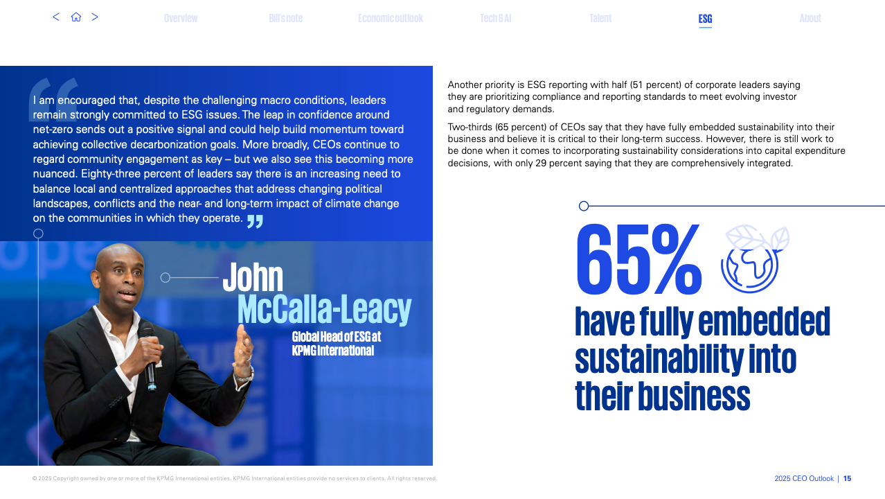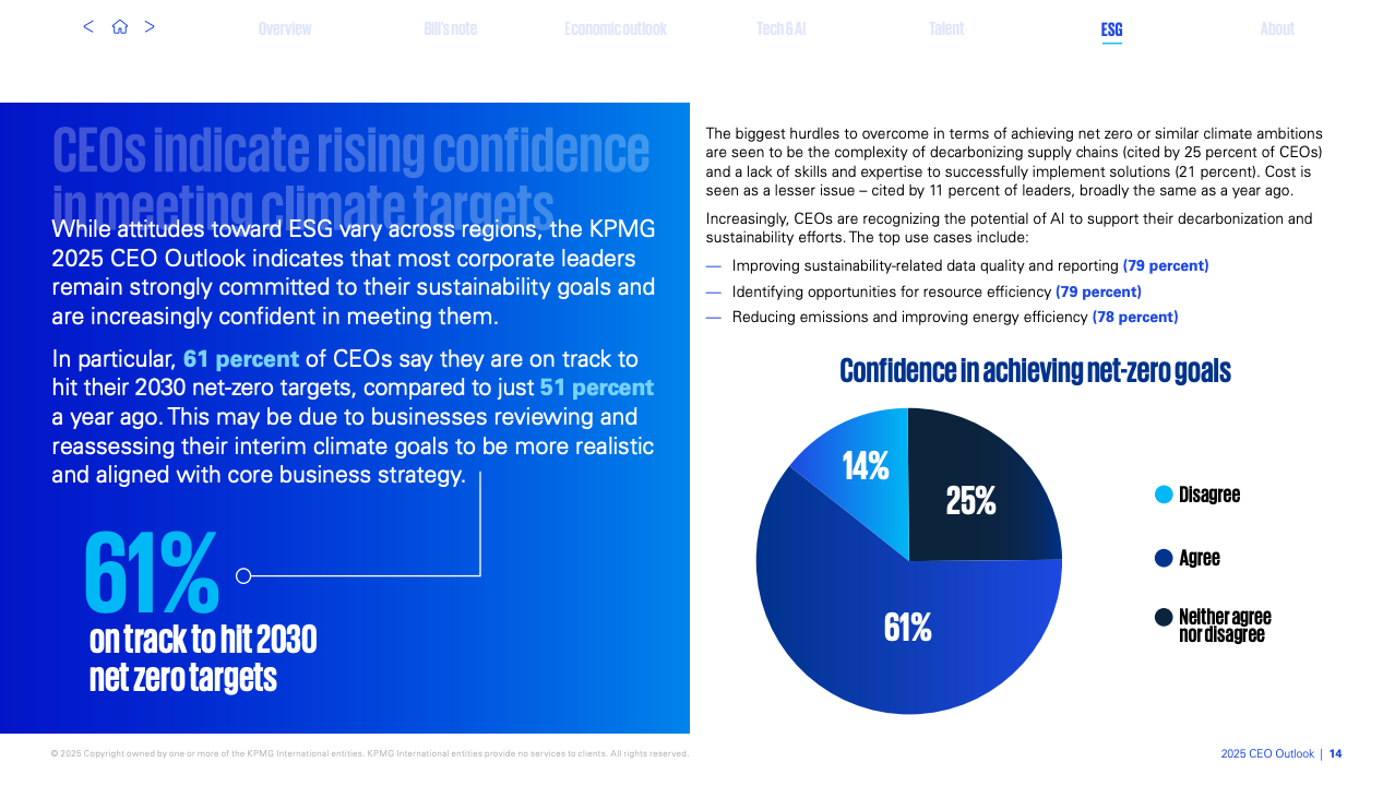 ESG信心显著回升。61%的CEO表示企业有望达成2030年净零目标,较去年提升10个百分点。AI在可持续发展中的应用迅速扩展,约79%的CEO利用AI提升可持续数据质量、资源效率与减排水平。65%的领导者已将可持续性完全嵌入战略之中,但仅29%将其全面纳入资本支出决策。