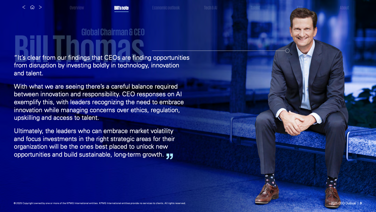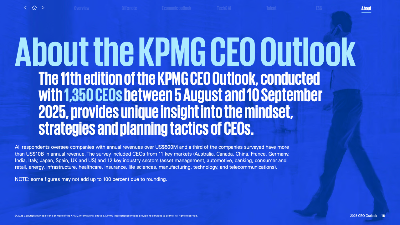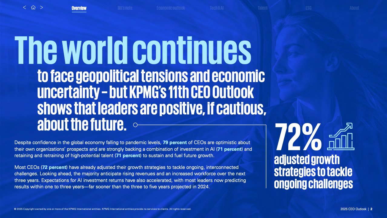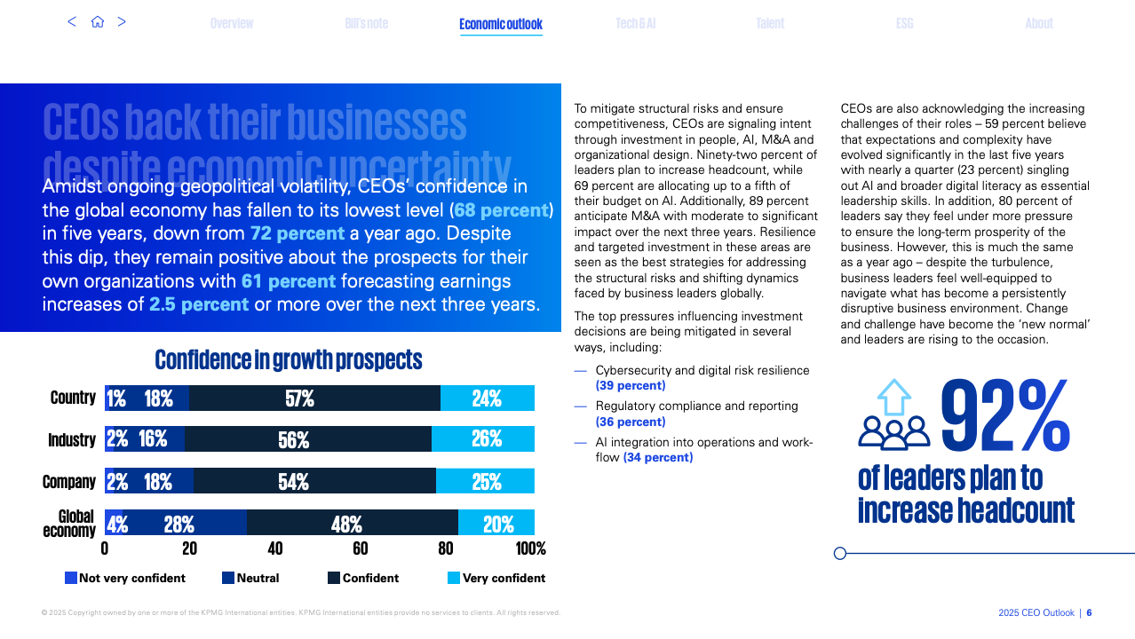 2025年毕马威《全球CEO前瞻报告》显示,面对持续的地缘政治紧张与经济不确定性,全球企业领袖在谨慎中保持乐观。尽管全球经济信心降至五年低点,仅68%的CEO对整体经济持乐观态度,但79%的受访者对自身企业前景保持信心,61%预计未来三年营收将增长2.5%以上。92%的CEO计划增加员工数量,69%计划将预算的10%至20%投入人工智能(AI),显示出企业对技术与人才双驱动的强烈信念。