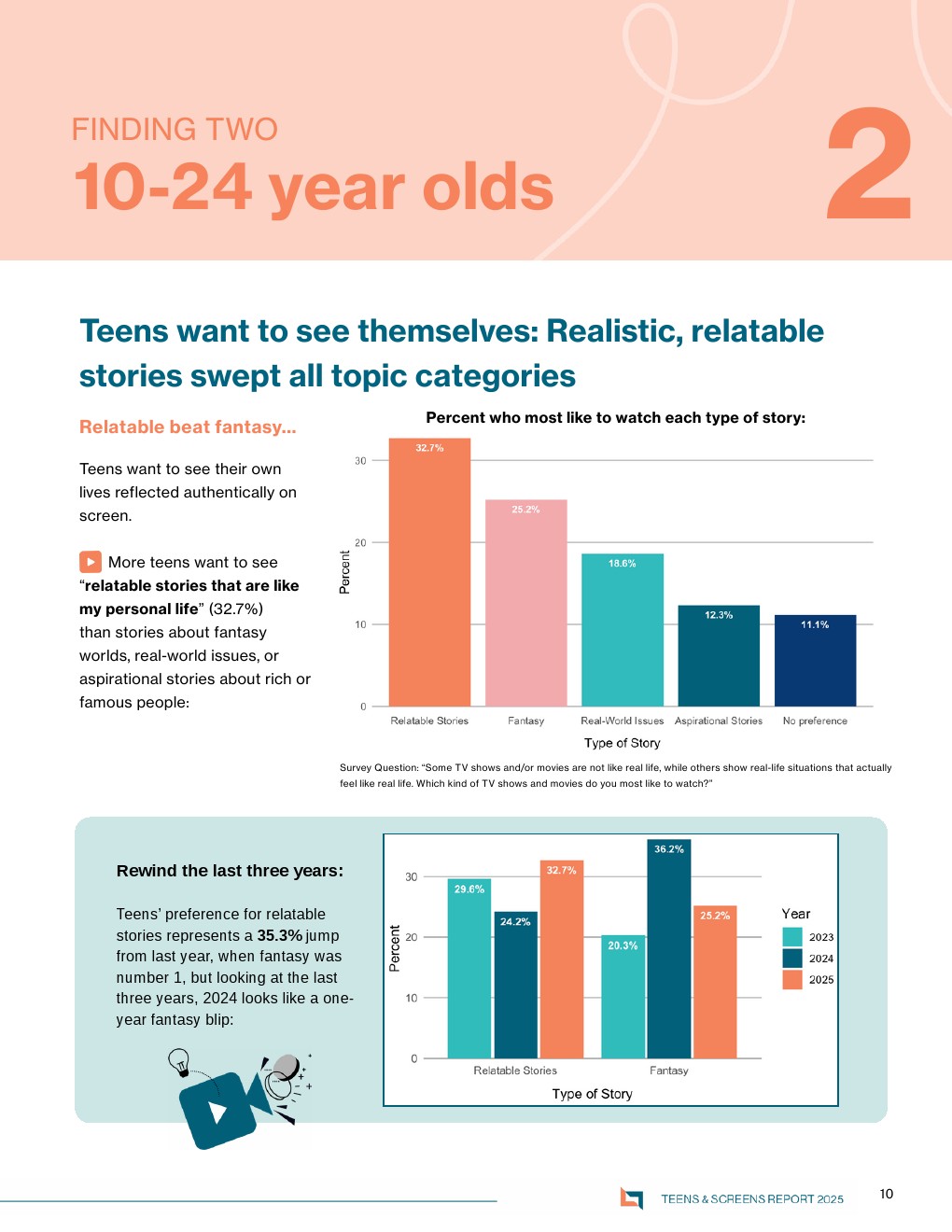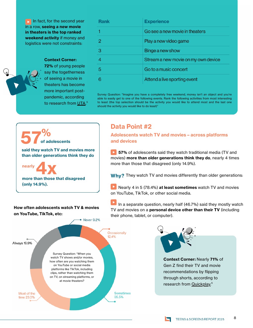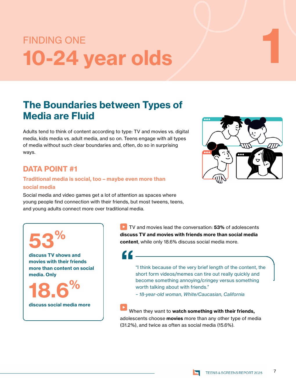 基于对1500名10至24岁美国青少年的调查,该报告揭示出一个关键转变:传统媒体在社交功能上的回归与强化。数据显示,53%的青少年更常与朋友讨论影视内容,仅18.6%更常讨论社交媒体内容;在共同观看选择上,31.2%优先选择电影,是社交媒体的两倍。这表明影视内容正在重新成为线下与深度社交的核心媒介,其“可持续讨论性”明显优于碎片化短视频内容 。