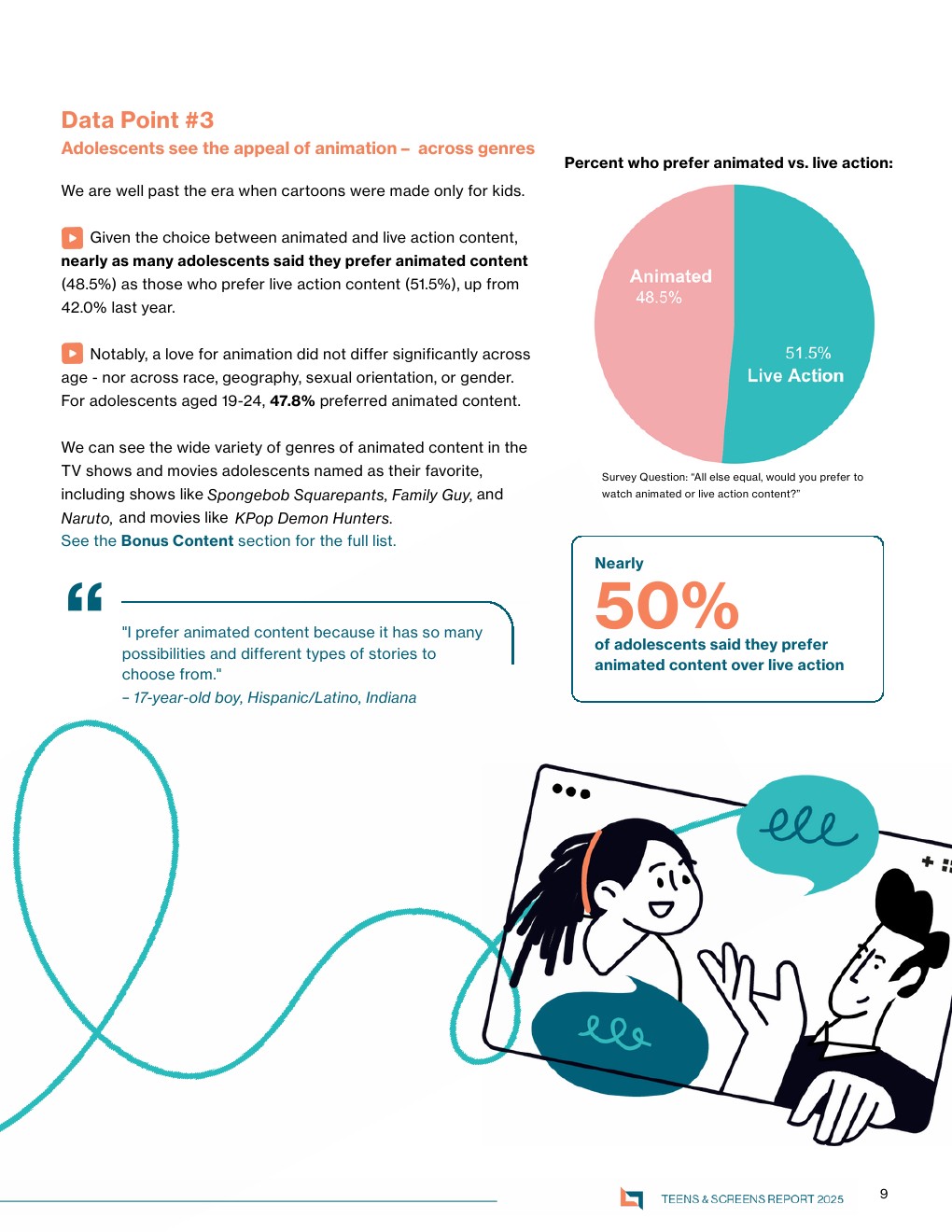 在媒介形态上,动画内容实现跨年龄渗透。48.5%的青少年偏好动画,与真人内容(51.5%)几乎持平,且该偏好在不同性别、年龄和族群中差异极小。这意味着动画已从儿童品类转向普适表达工具,其叙事自由度成为吸引力核心,具备更高的创意溢价空间 。