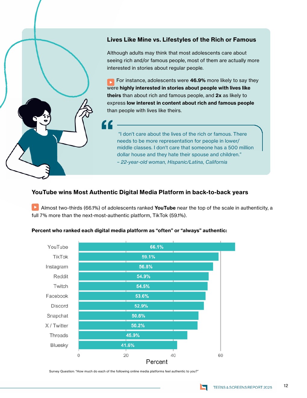 平台信任度亦呈现分化。66.1%的青少年认为YouTube“真实”,高于TikTok的59.1%,说明用户对“真实性”的判断更依赖内容深度与表达完整性,而非单纯互动性。这种认知将重塑平台竞争逻辑,从流量分发转向信任资产积累 。
