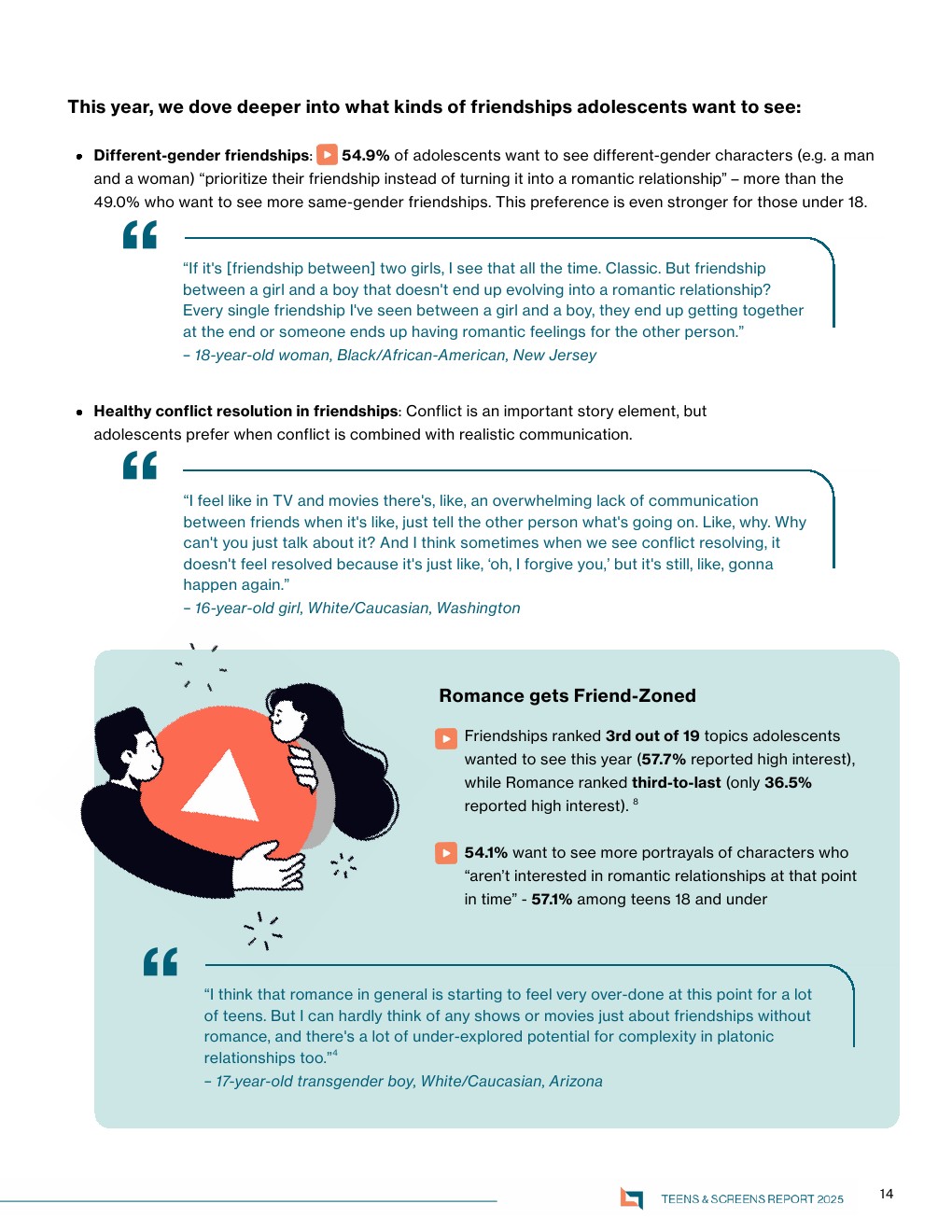 关系叙事方面,友情取代爱情成为核心驱动力。59.7%的14至24岁群体希望看到以友情为核心的内容,54.9%希望异性角色保持纯友谊关系,60.9%期待“以友情为基础”的恋爱叙事。同时,仅36.5%对爱情题材表现出高兴趣,爱情相关套路(如三角恋)成为最被反感元素。这显示出情感叙事从“浪漫中心”向“关系多元化”转型 。