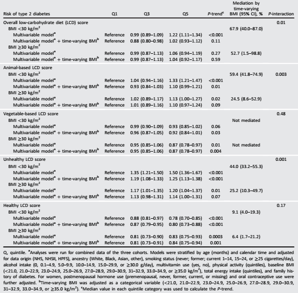 具体而言,总体、动物性和不健康低碳饮食与糖尿病风险的正向关联,在基线BMI<30的非肥胖参与者中更为强烈。进一步分析揭示,体重变化是连接这些不健康低碳模式与糖尿病风险的一个重要中介因素,尤其是在非肥胖人群中,体重变化解释了相当一部分(44%-68%)的风险增加。这意味着,不健康的低碳饮食可能通过引起不利的体重波动,从而推高糖尿病风险,而这一点在原本不胖的人群中表现得尤为明显!相比之下,健康的植物性低碳模式则没有表现出这种依赖BMI的差异效应,其益处更为普适。