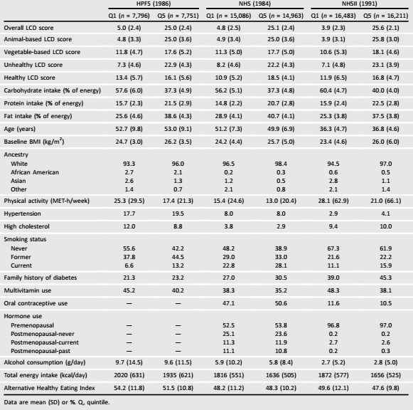 表:HPFS(1986-2018)、NHS(1984-2018)和NHSII(1991-2019年)队列研究参与者的年龄标准化特征