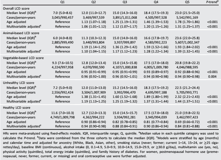 表:HPFS(1986–2018)、NHS(1984–2018)及NHSII(1991–2019)队列中,LCD评分(五分位数)与2型糖尿病风险的合并比值比(95%置信区间)