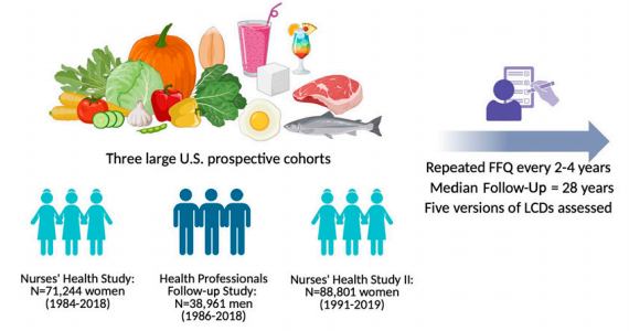 这项研究汇集了美国三大著名健康队列,分别是护士健康研究(NHS):71244名女性,始于1984年;护士健康研究II(NHSII):88801名女性,始于1991年;以及健康专业人员随访研究(HPFS):38961名男性,始于1986年。共计近20万人,追踪时间中位数长达28年,可谓是个“超长待机”的研究!