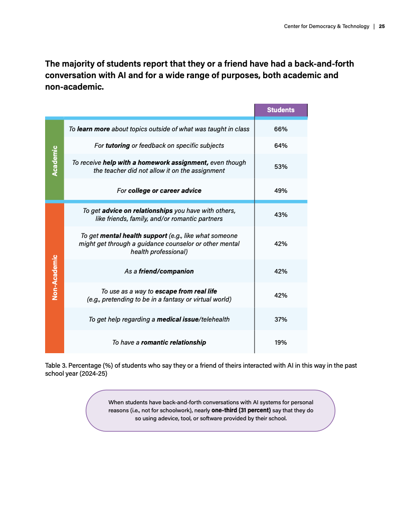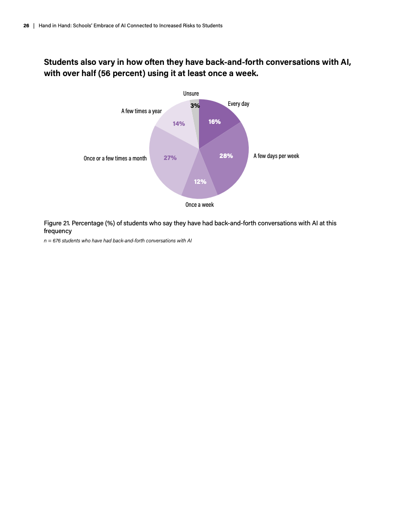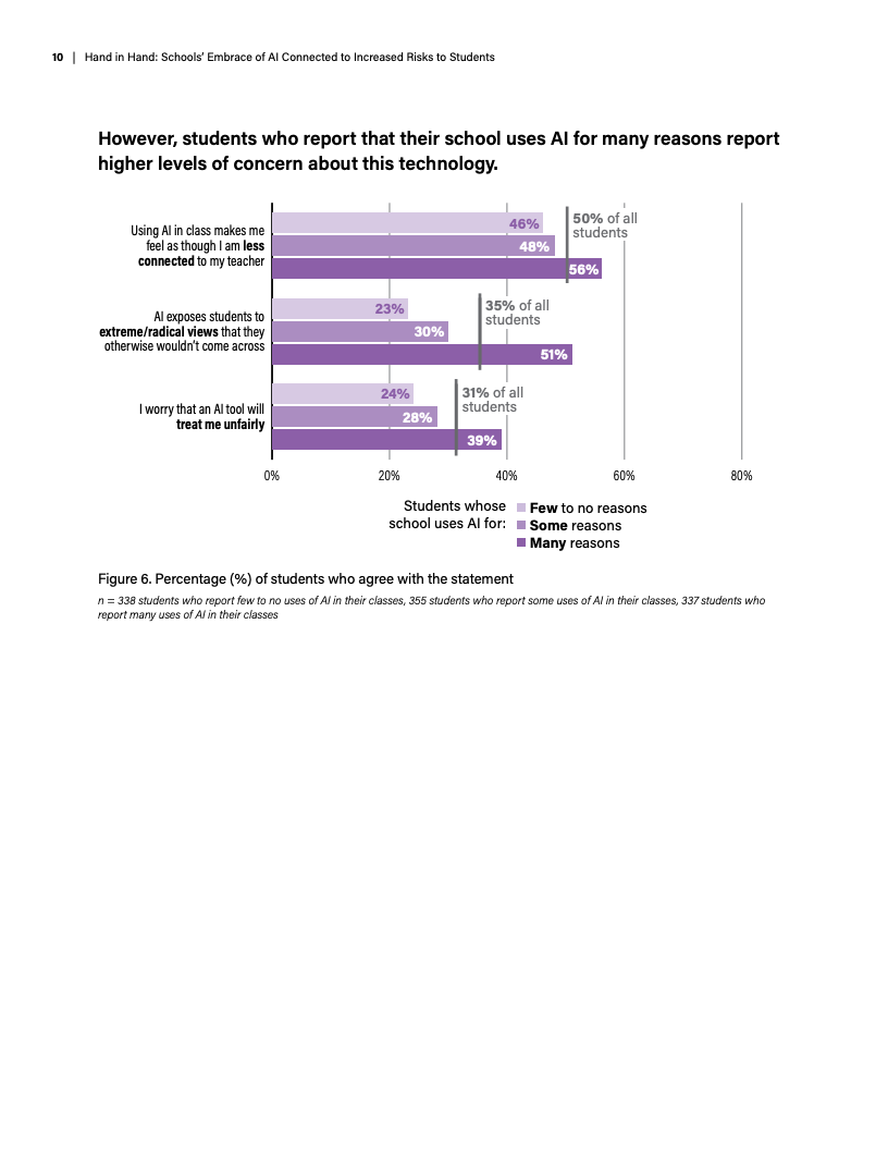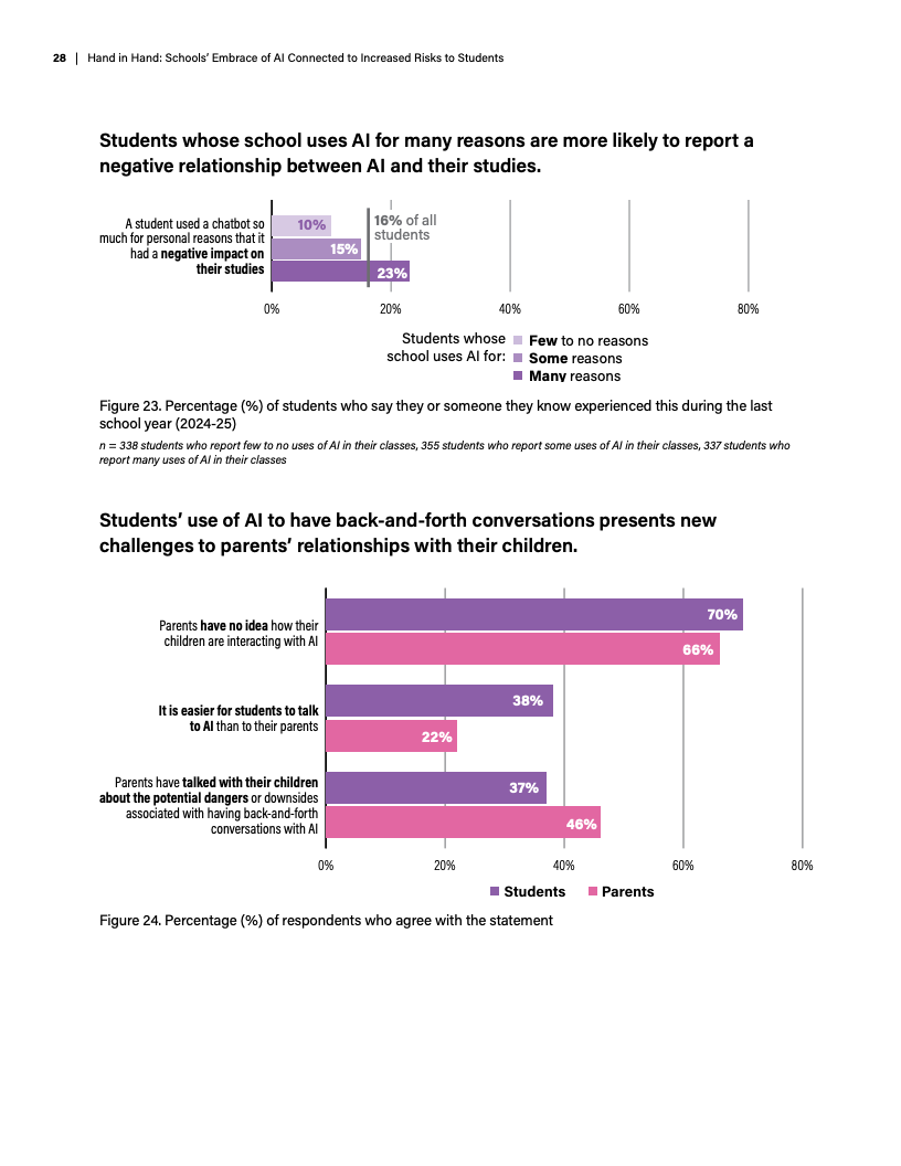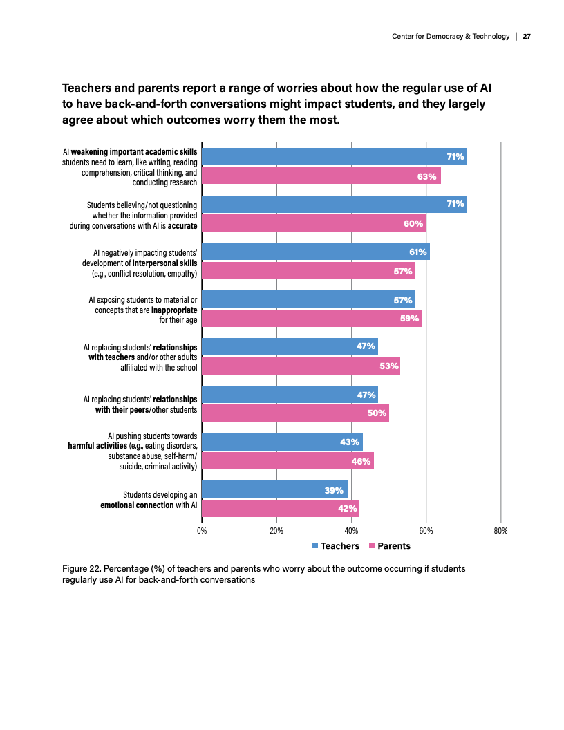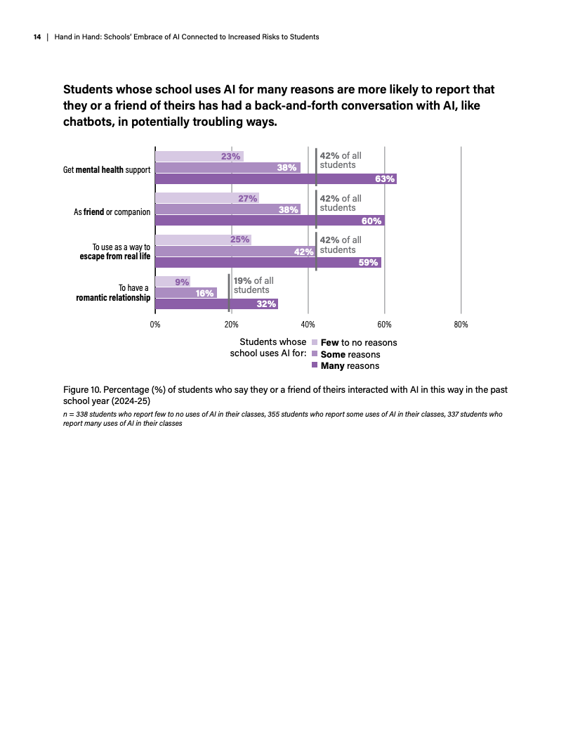 值得注意的是,AI的社会化风险正快速下沉至青少年层面。56%的学生每周至少与AI聊天一次,19%甚至尝试建立“浪漫关系”或将AI视为“逃避现实的伙伴”。这些互动多数发生在校方提供的设备或系统中,凸显出AI与学生心理健康之间的潜在冲突。教师与家长普遍忧虑AI导致学生情感依赖、社交退化或暴露于不适当内容,其中71%的教师警示“学生正在与AI建立情感联系”。