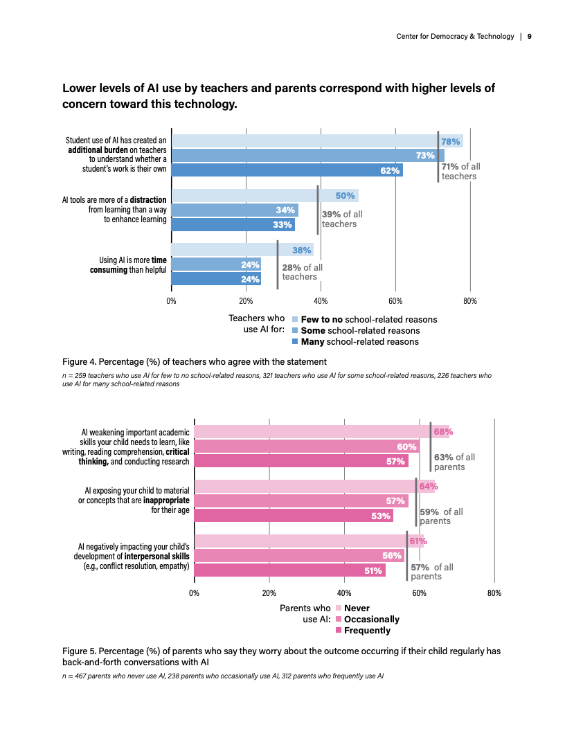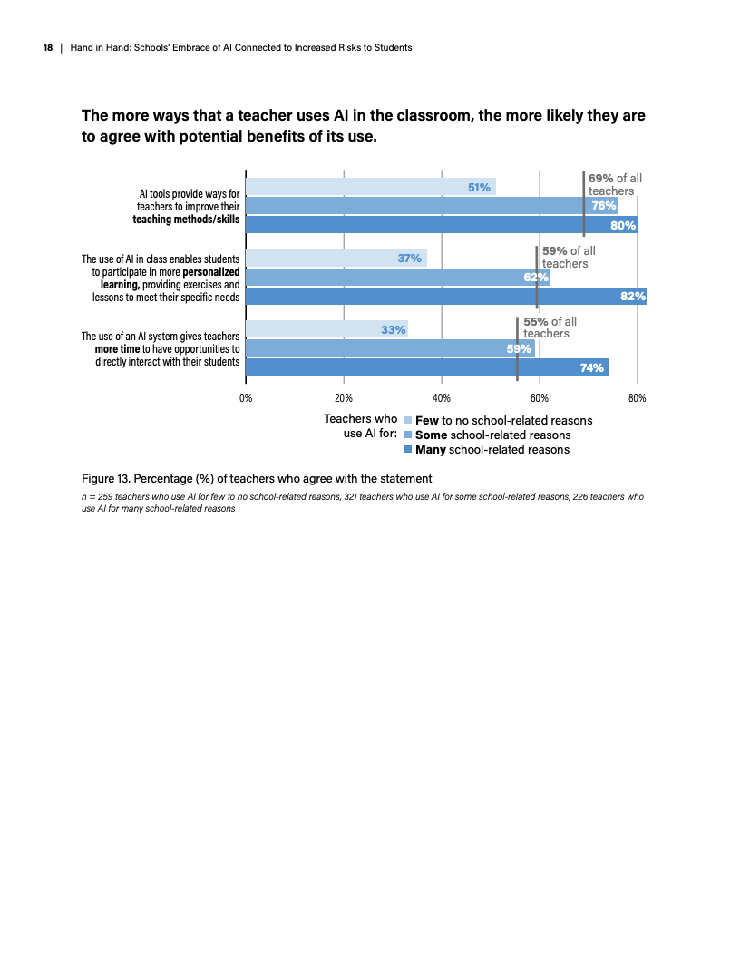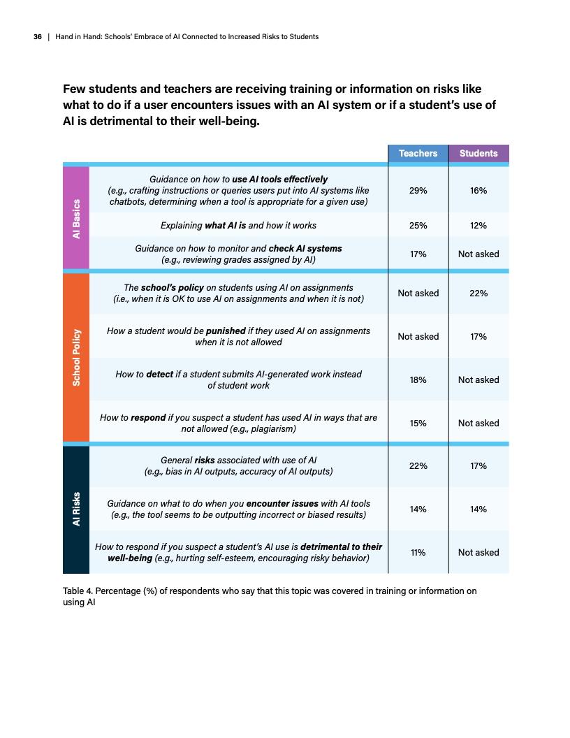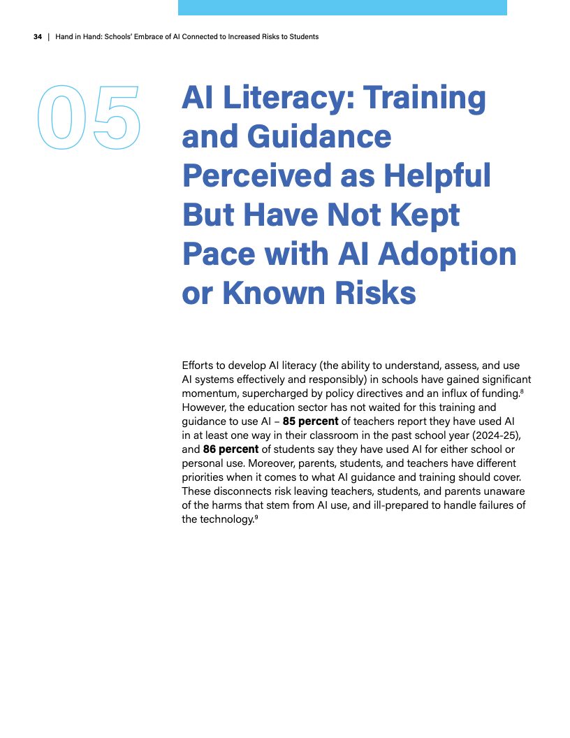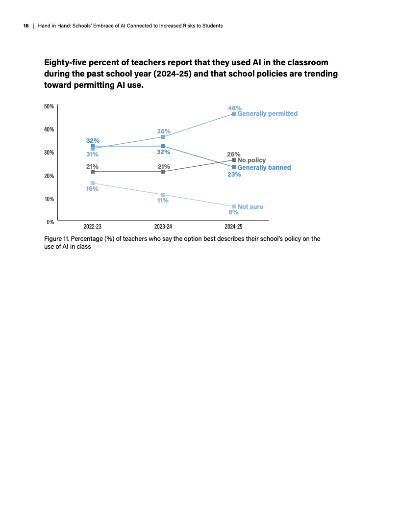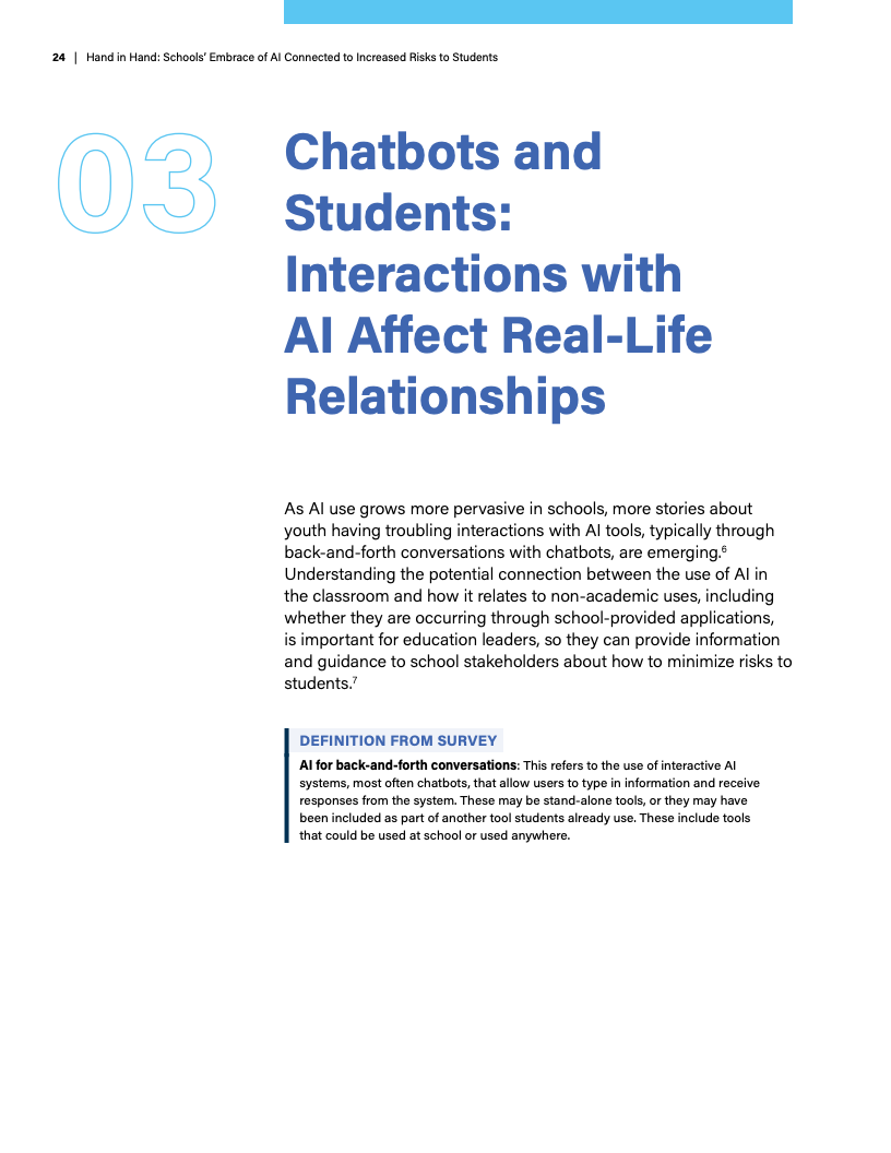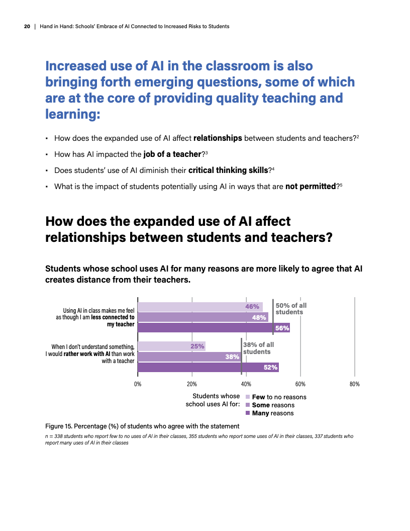 值得注意的是,AI的社会化风险正快速下沉至青少年层面。56%的学生每周至少与AI聊天一次,19%甚至尝试建立“浪漫关系”或将AI视为“逃避现实的伙伴”。这些互动多数发生在校方提供的设备或系统中,凸显出AI与学生心理健康之间的潜在冲突。教师与家长普遍忧虑AI导致学生情感依赖、社交退化或暴露于不适当内容,其中71%的教师警示“学生正在与AI建立情感联系”。