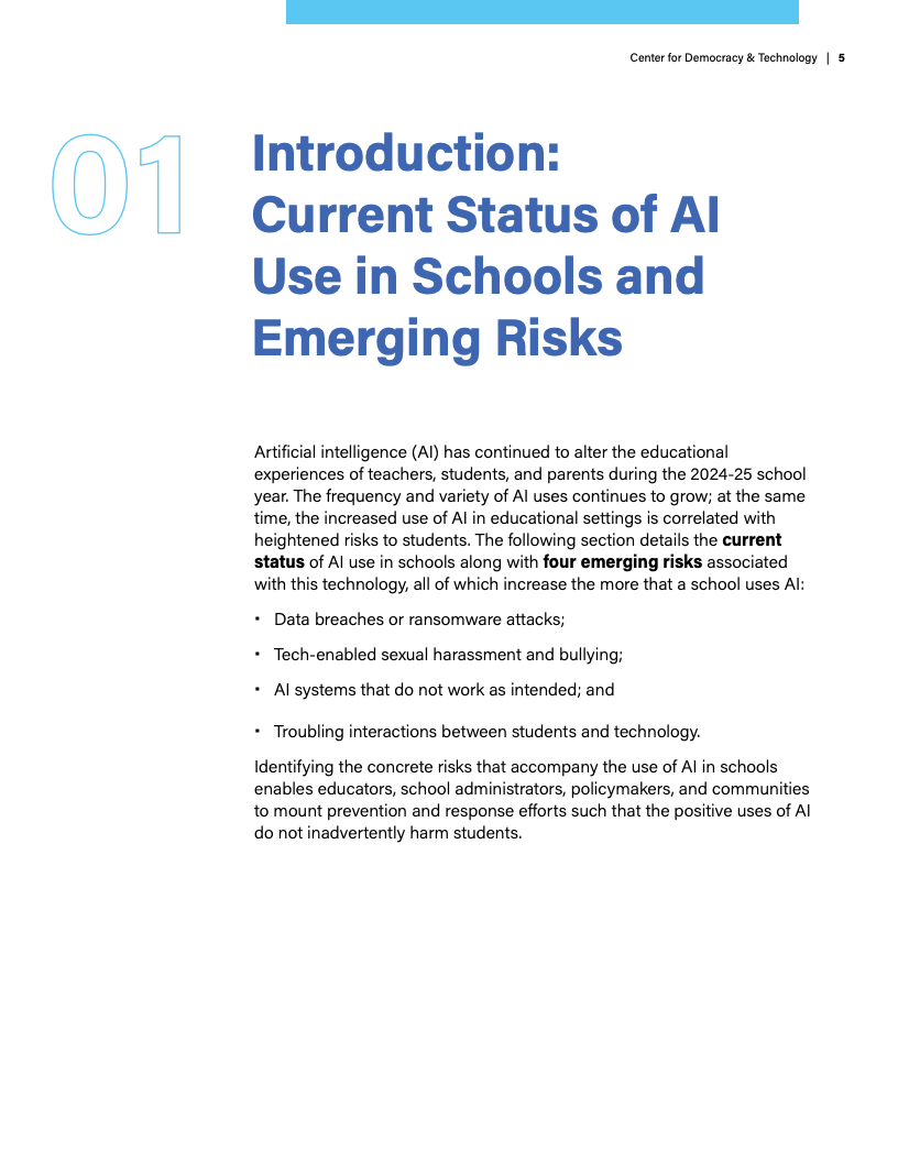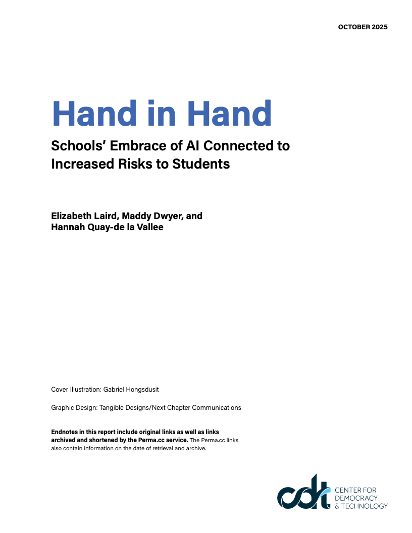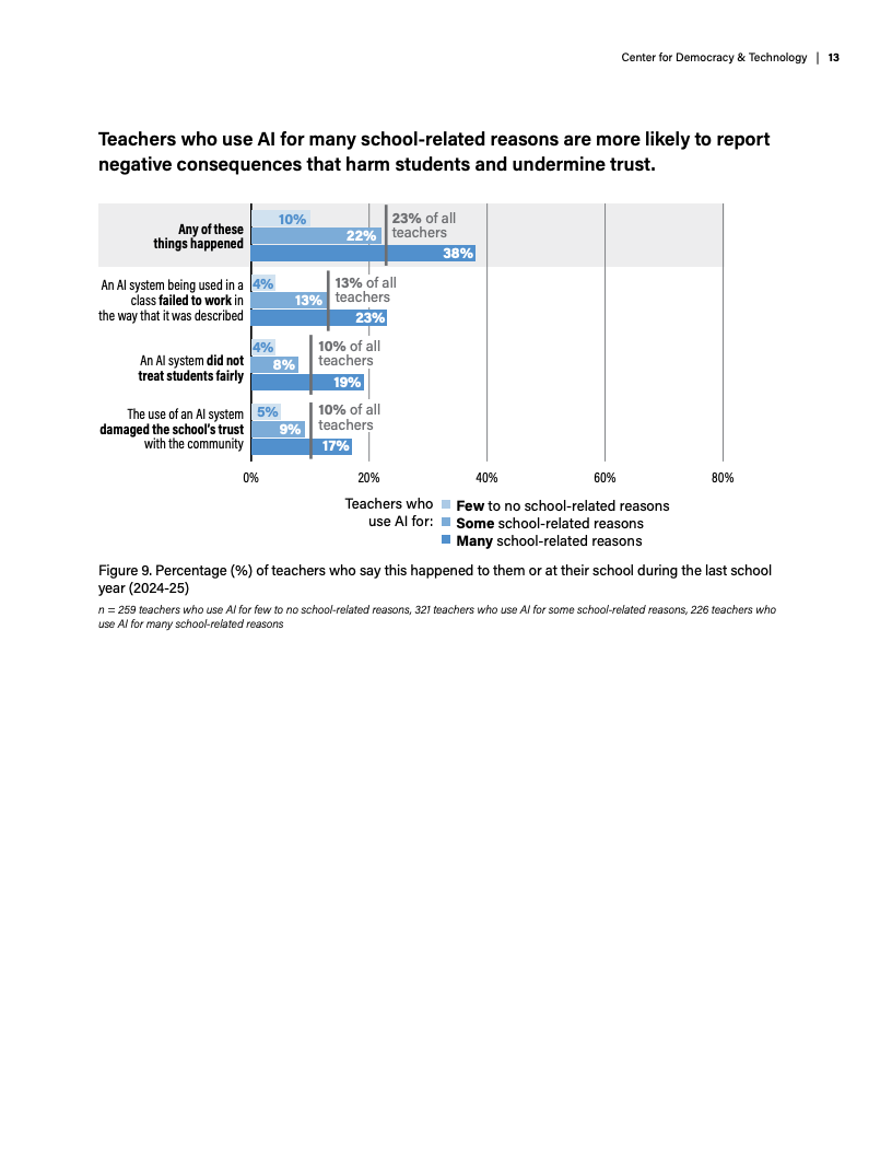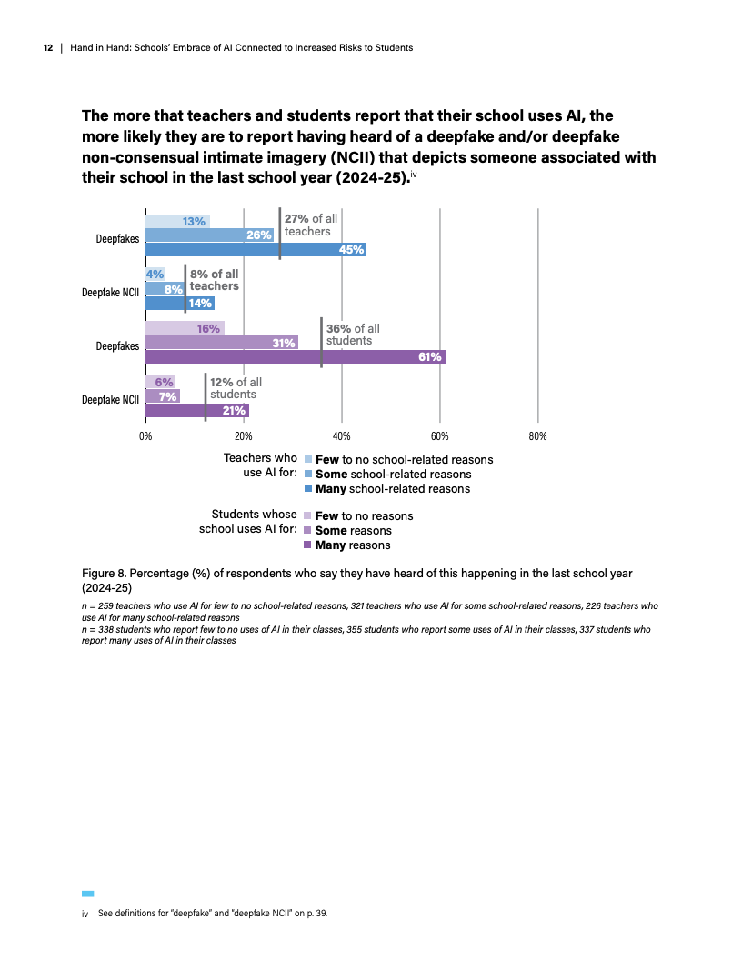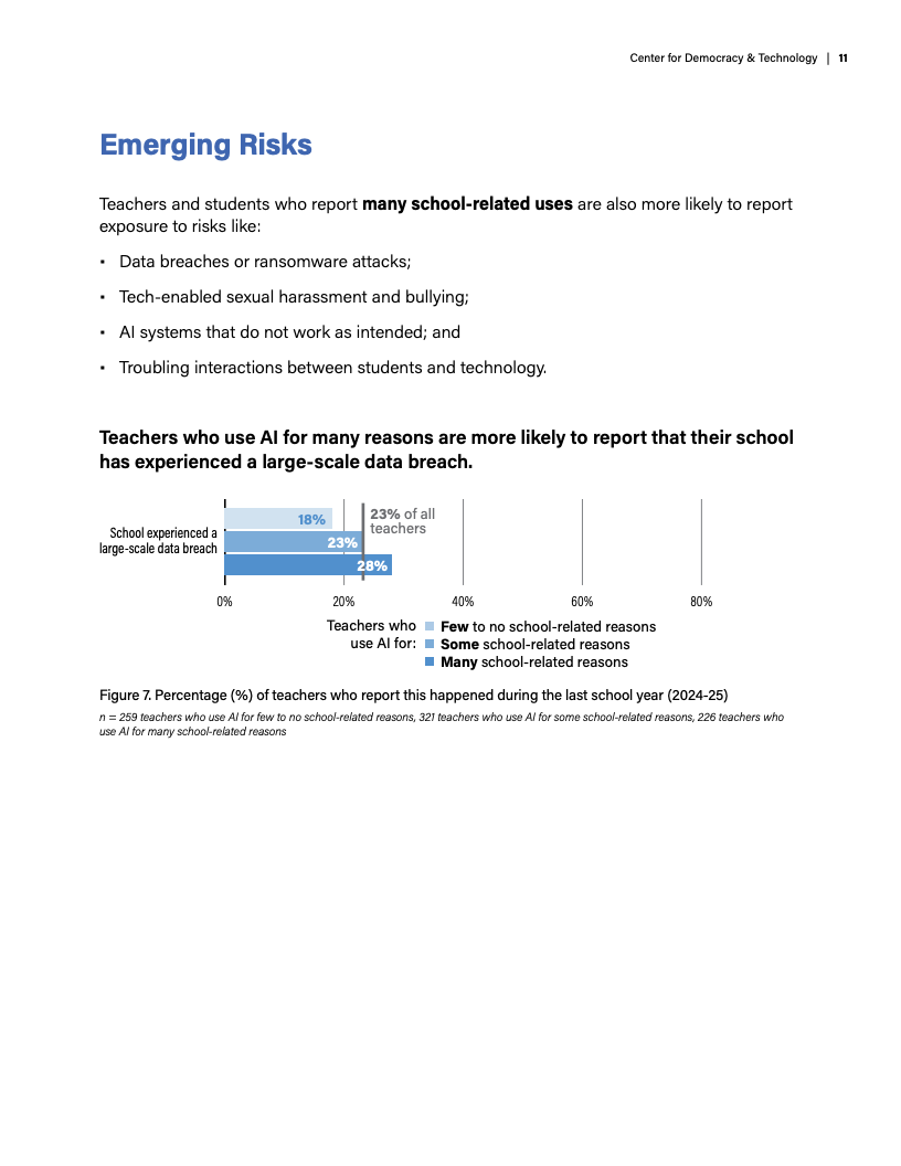 数据显示,28%的教师在AI使用较多的学校报告曾经历大规模数据泄露,而在AI使用较少的学校中,这一比例仅为18%。同时,约45%的教师与61%的学生表示听闻学校内出现过“深度伪造(Deepfake)”或“非自愿性影像(NCII)”事件,显示AI技术正在扩散既有校园欺凌与性别暴力的边界。此外,38%的教师承认AI系统曾未能如预期运行,导致对学生不公,甚至损害学校与社区之间的信任。