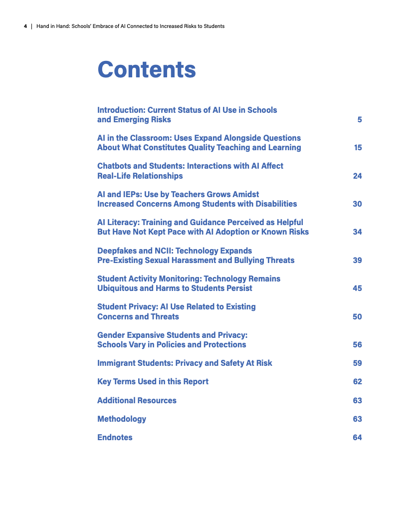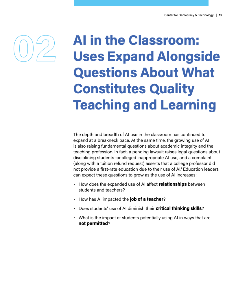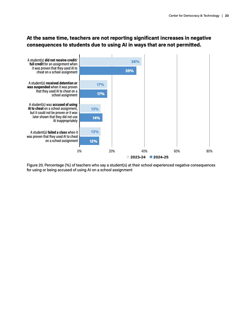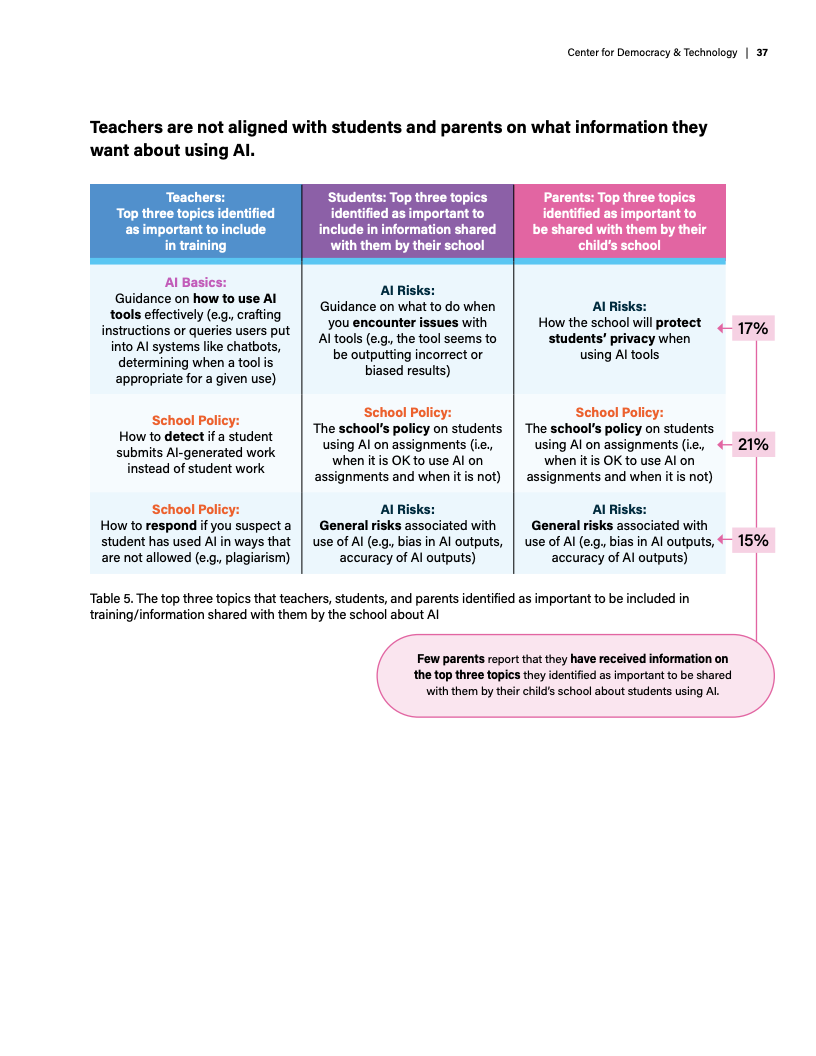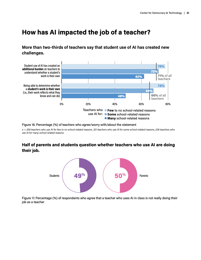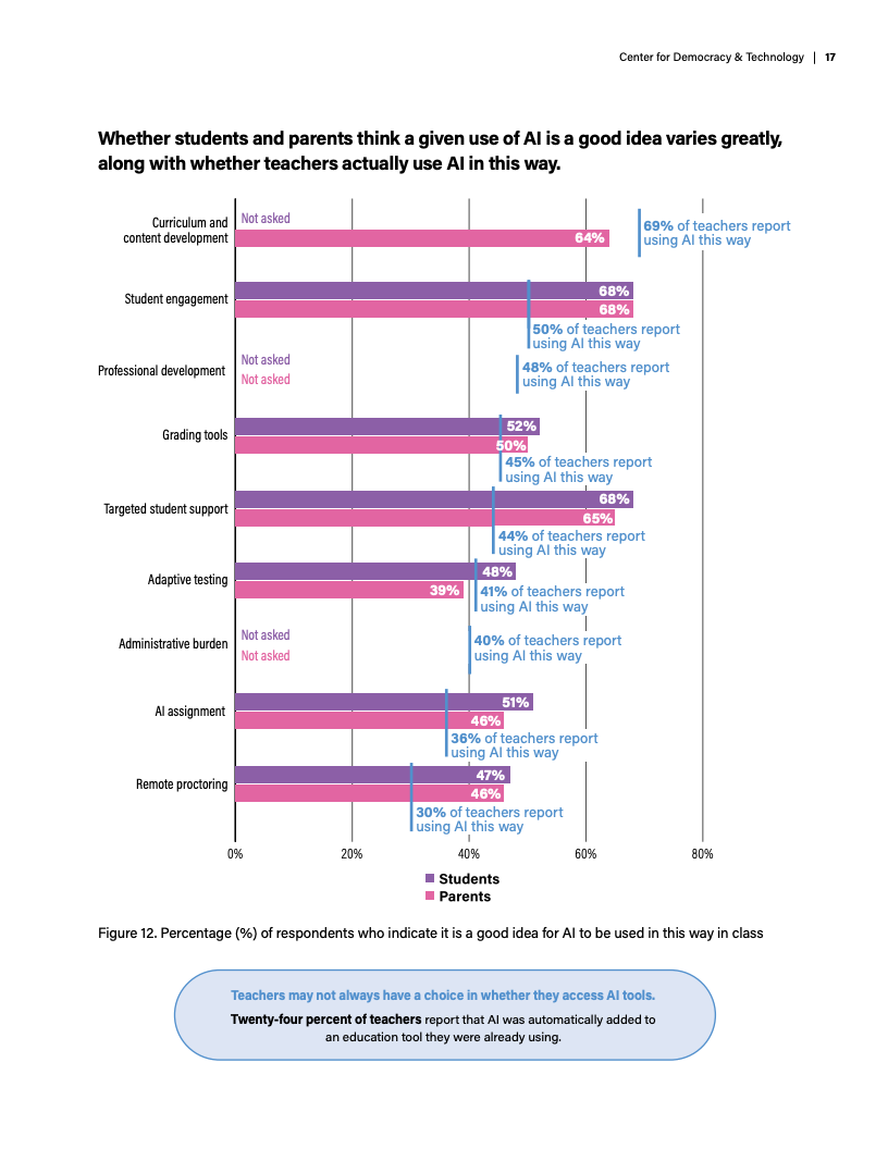 数据显示,28%的教师在AI使用较多的学校报告曾经历大规模数据泄露,而在AI使用较少的学校中,这一比例仅为18%。同时,约45%的教师与61%的学生表示听闻学校内出现过“深度伪造(Deepfake)”或“非自愿性影像(NCII)”事件,显示AI技术正在扩散既有校园欺凌与性别暴力的边界。此外,38%的教师承认AI系统曾未能如预期运行,导致对学生不公,甚至损害学校与社区之间的信任。