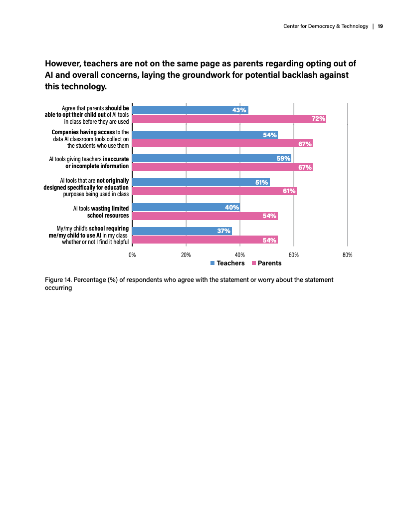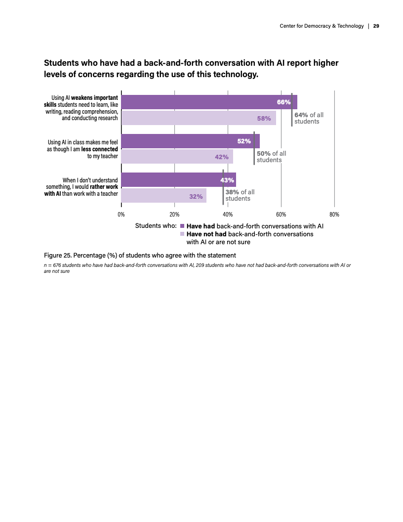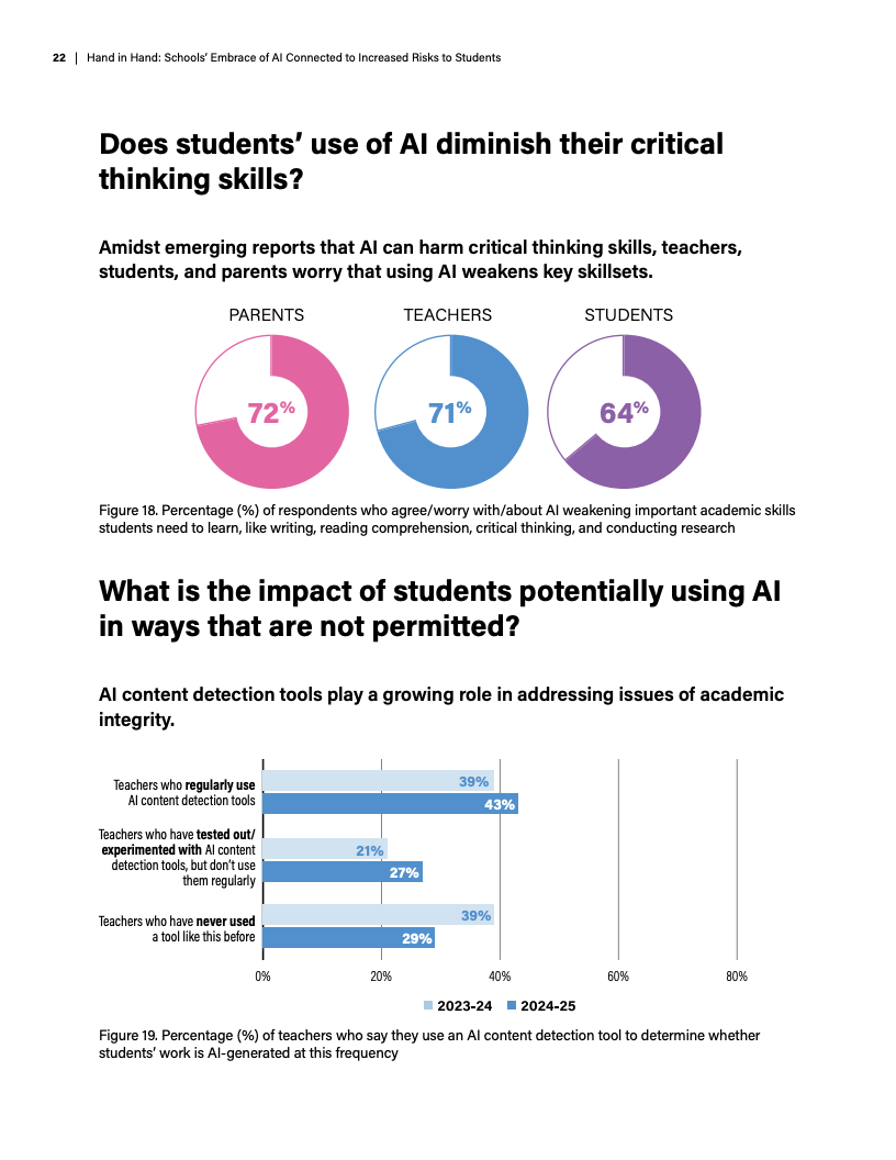 AI在课堂的应用虽带来教学效率的提升,但也引发教育本质的再思考。69%的教师认为AI提升了教学方法与个性化学习体验,但72%的家长主张应允许家长“选择退出”AI课堂工具。与此同时,49%的学生与50%的家长认为使用AI授课的教师“并未真正履行教学职责”,折射出教育者角色的模糊化。更令人担忧的是,64%的家长担心AI削弱孩子的写作、批判性思维等核心学术技能。