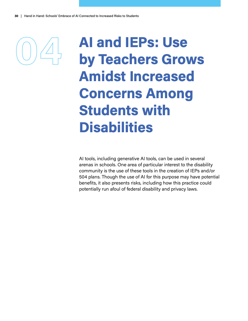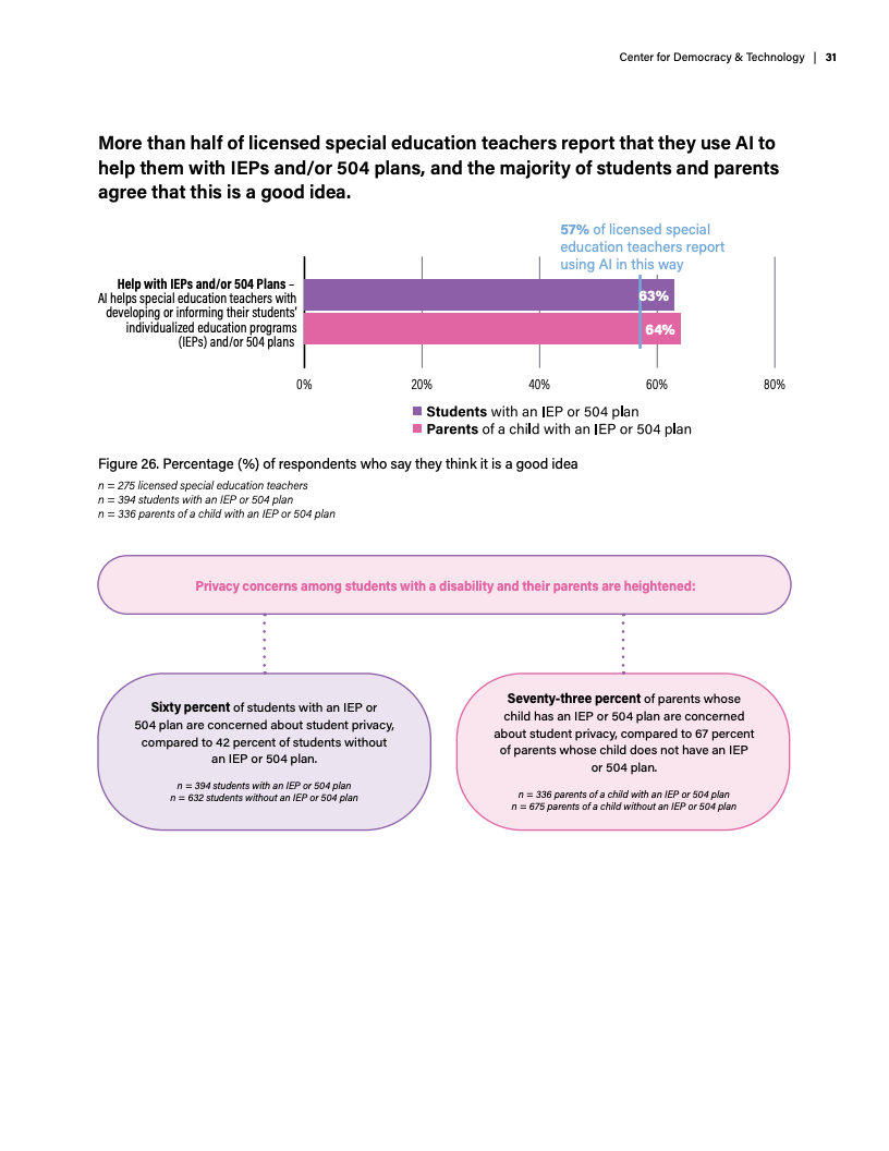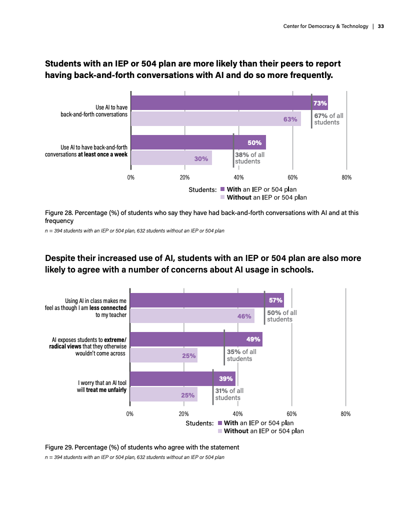 AI的使用还凸显出公平与隐私的双重分化。在家庭收入10万美元以上的家长中,81%报告自己及孩子使用过AI,而低收入家庭(5万美元以下)仅为58%。此外,有IEP或504教育辅助计划的特殊学生对隐私风险的担忧显著更高,达73%,且63%的人每周使用AI对话工具,远高于普通学生的38%。