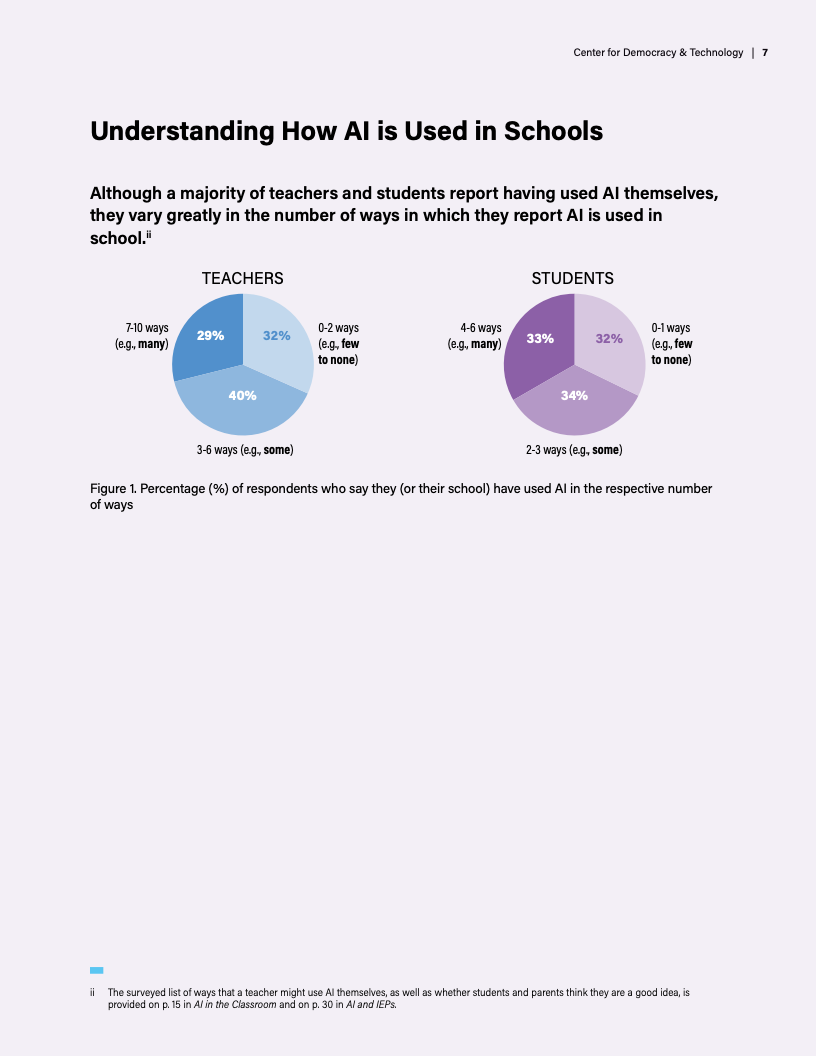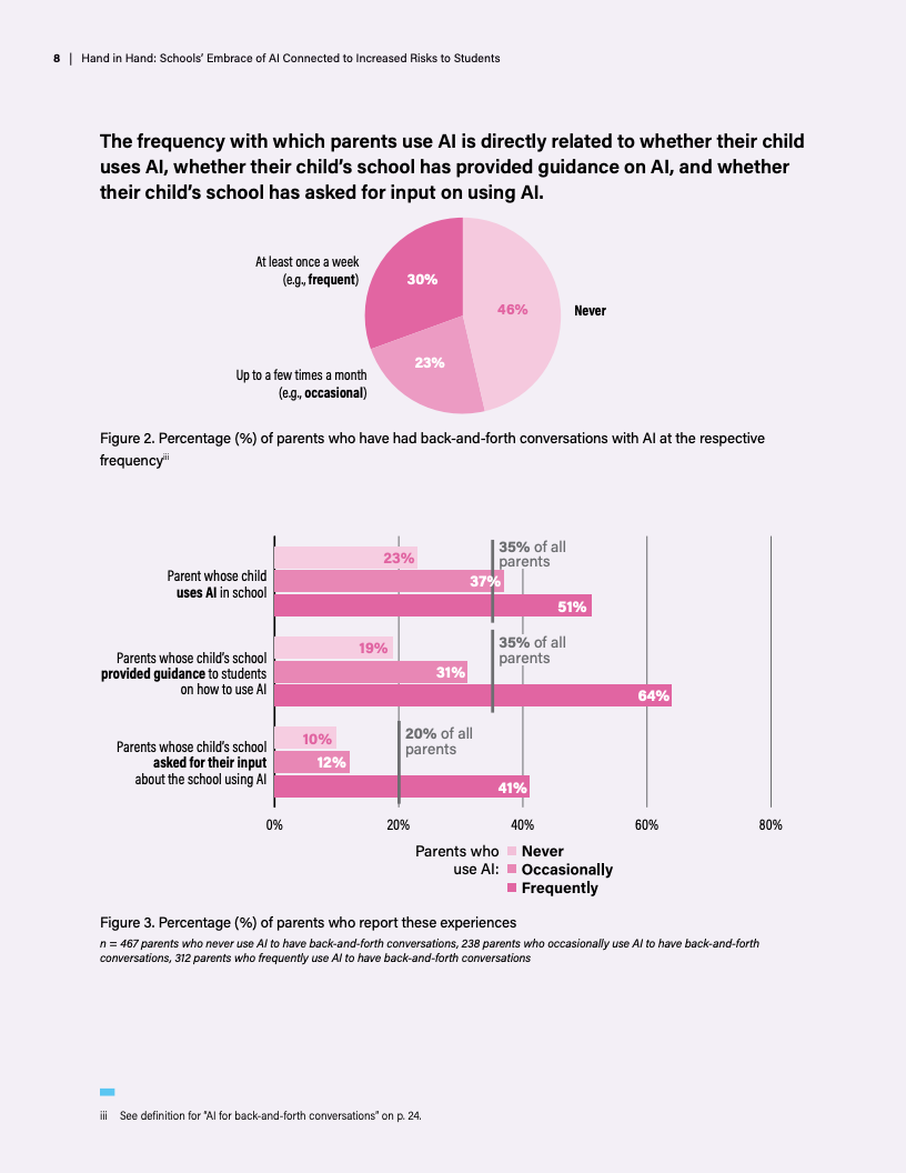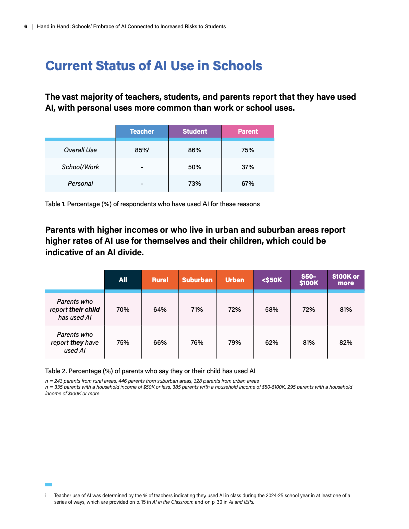 在2024至2025学年,美国中学教育的AI使用进入普及阶段。根据CDT最新调查,85%的教师、86%的学生以及75%的家长表示曾使用AI,其中学校或工作场景的使用率分别达到教师50%、学生73%、家长67%。然而,AI在教育领域的广泛渗透并非无代价。报告揭示,AI使用频率越高的学校,其数据泄露、性骚扰、偏见算法及师生关系问题的风险也越高。