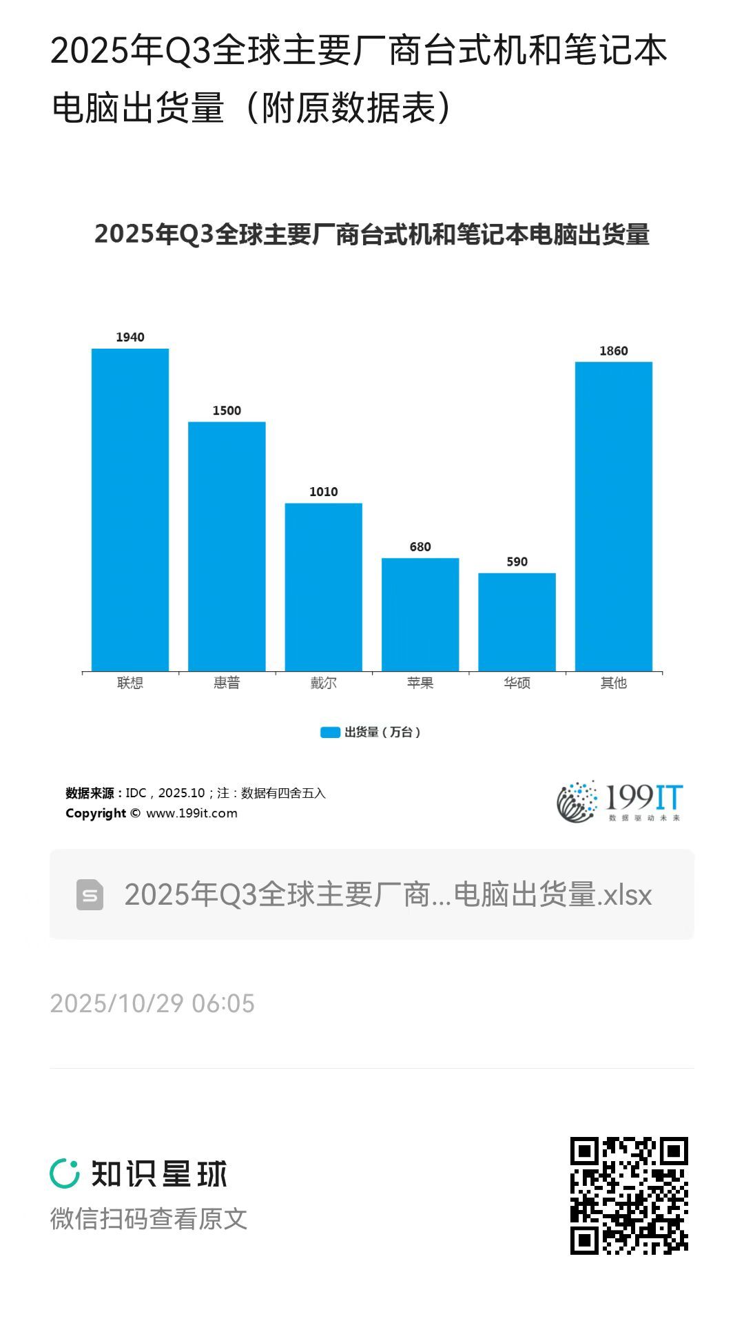 - 2025年Q3全球主要厂商台式机和笔记本电脑出货量同比(附原数据表)