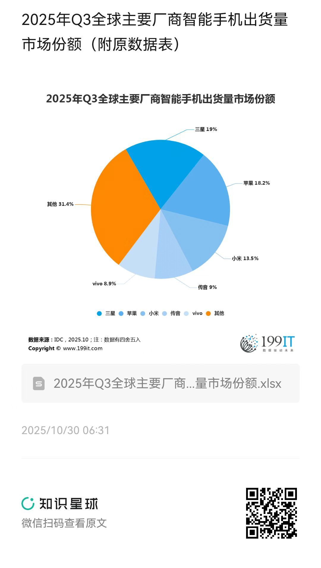 - 2025年Q3全球主要厂商智能手机出货量份额(附原数据表)