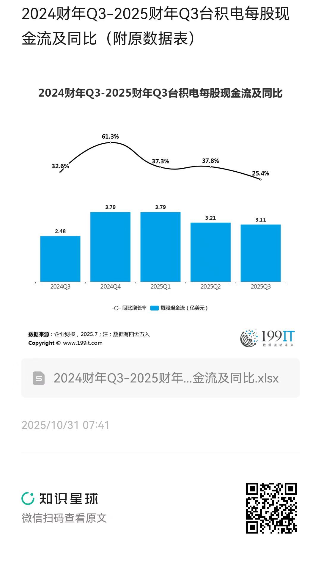 2024财年Q3-2025财年Q3台积电每股现金流及同比(附原数据表) ​​​