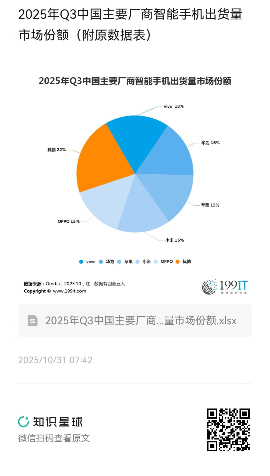 - 2025年Q3全球主要厂商智能手机出货量份额(附原数据表)