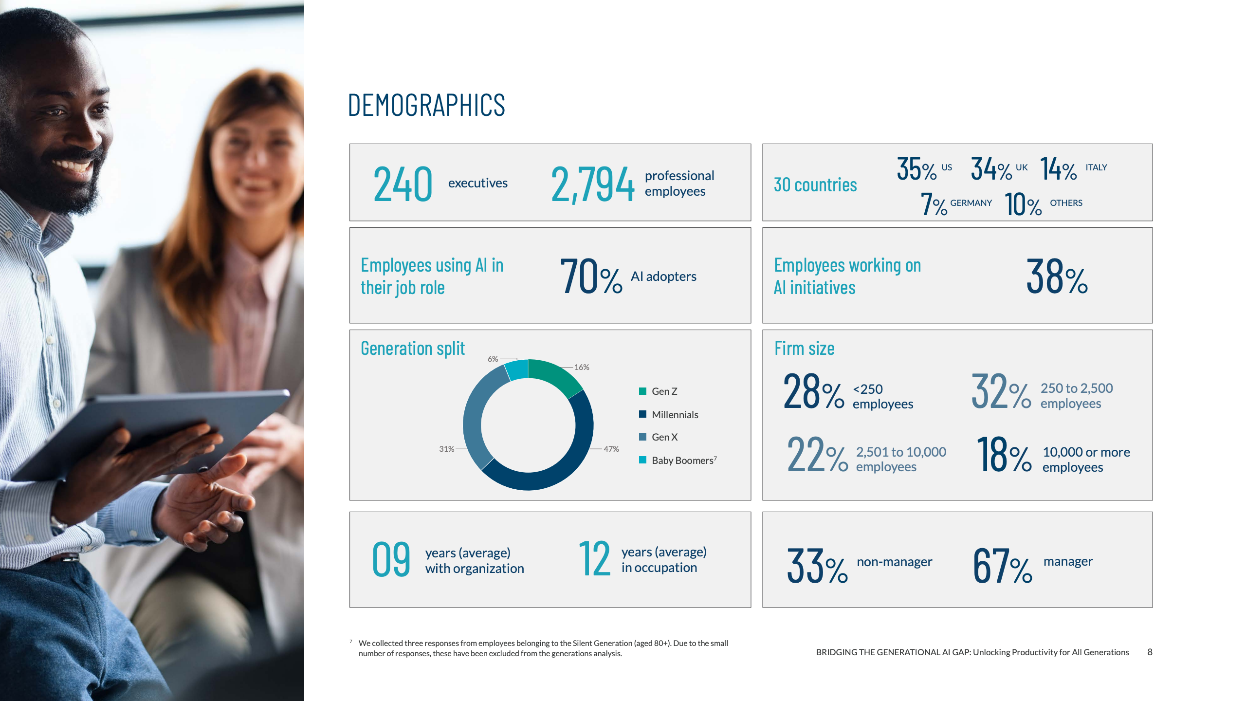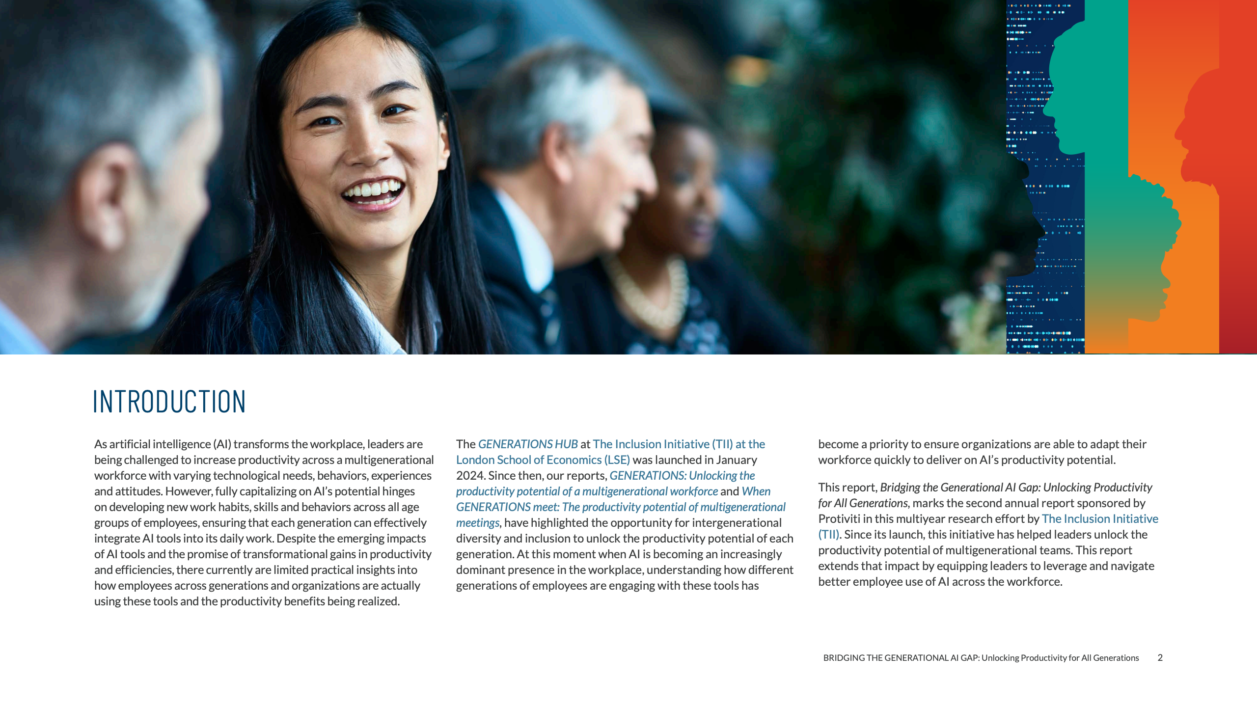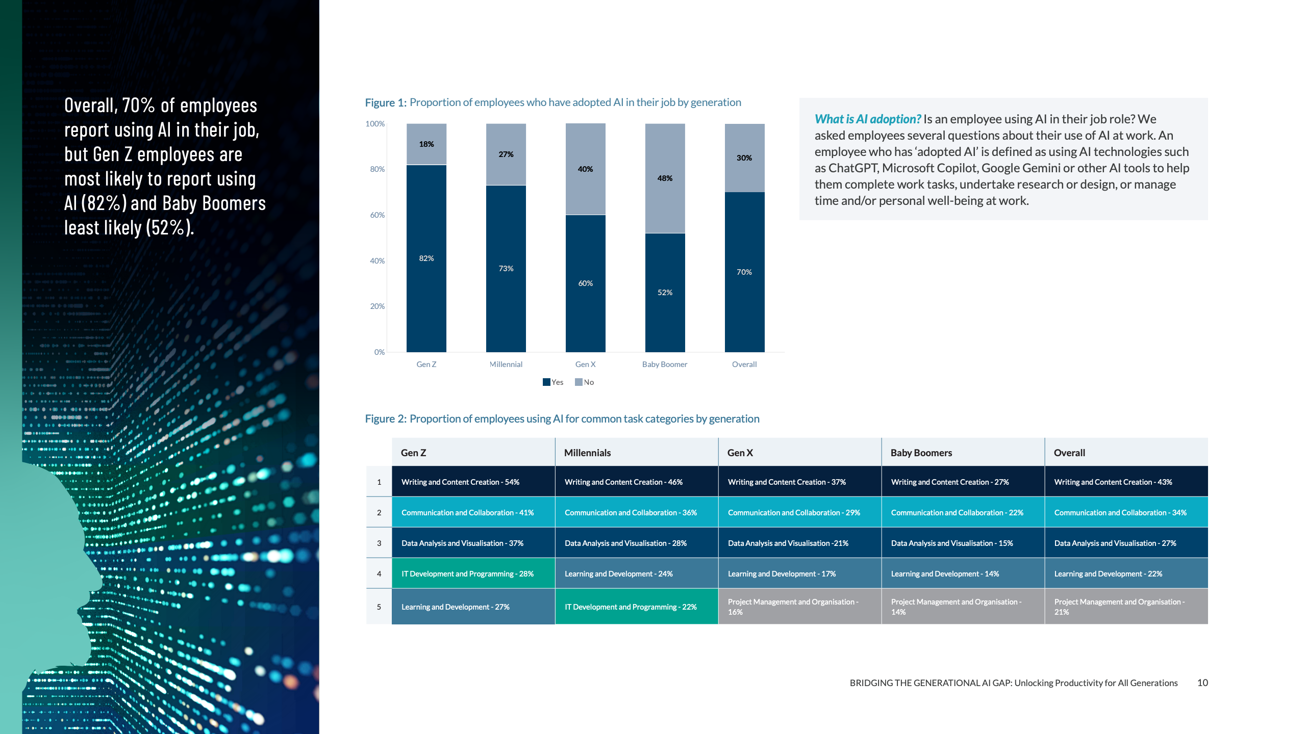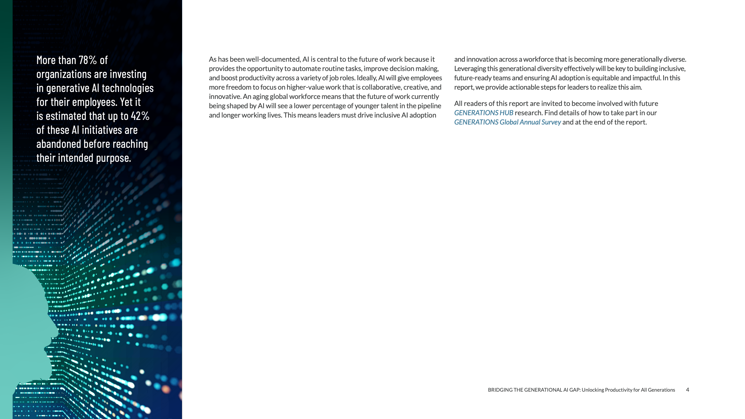 人工智慧正在重塑职场格局,企业领导者面临着如何在多代员工中提升生产力的挑战。调查显示,超过78%的组织正在为员工投资生成式AI技术,但高达42%的AI项目在实施前被放弃。这反映出AI采用的世代差异:Z世代员工中82%在使用AI,而婴儿潮一代仅为52%。此外,38%的员工参与AI项目开发,Z世代占比高达47%,而X世代和婴儿潮一代约为30%。这些差距不仅影响采用率,还制约整体生产力。