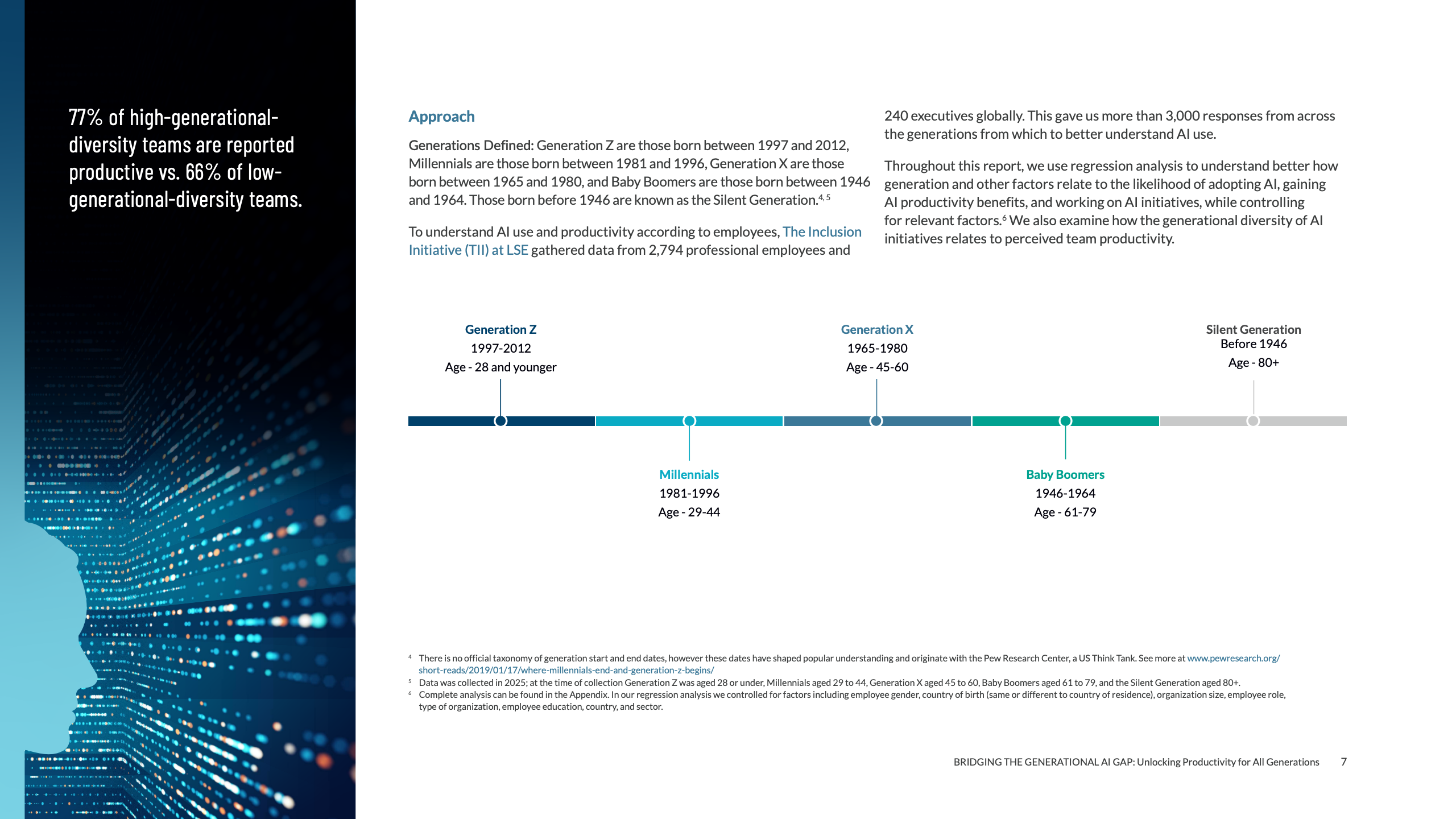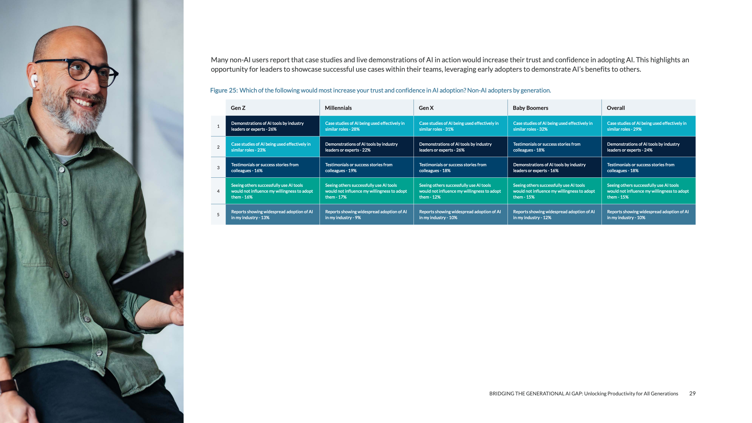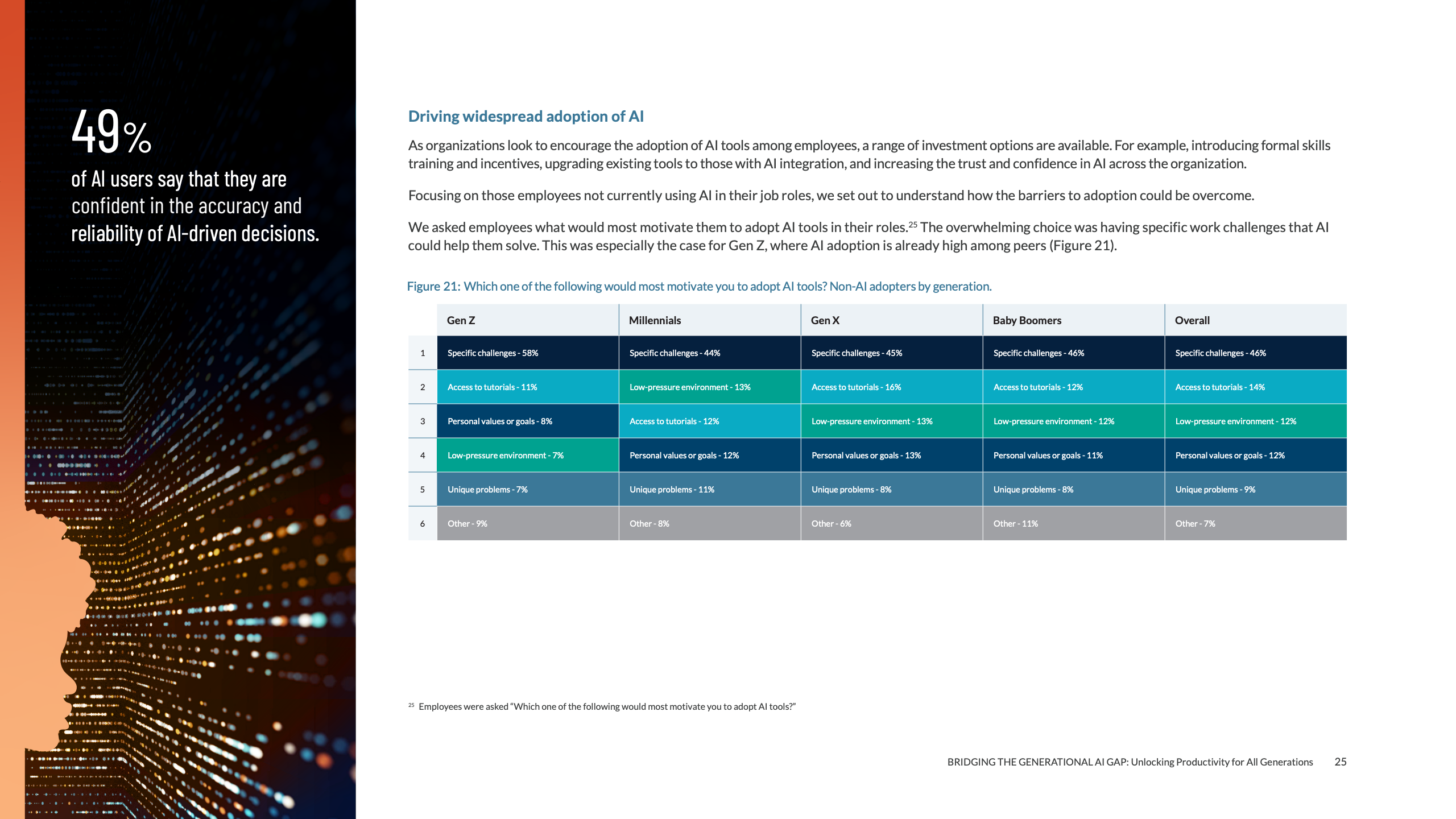 世代多样性在AI团队中尤为重要。高世代多样性团队的生产力达77%,而低多样性团队仅66%。员工在AI项目中投入约34%的时间,Z世代高达40%。参与AI项目的员工报告更高的组织归属感和承诺,尤其是千禧一代和X世代,达58%和51%。然而,信任仍是障碍:仅49%的AI使用者对AI决策有信心,非使用者仅20%。年轻一代略微更信任AI,但差距不大。
