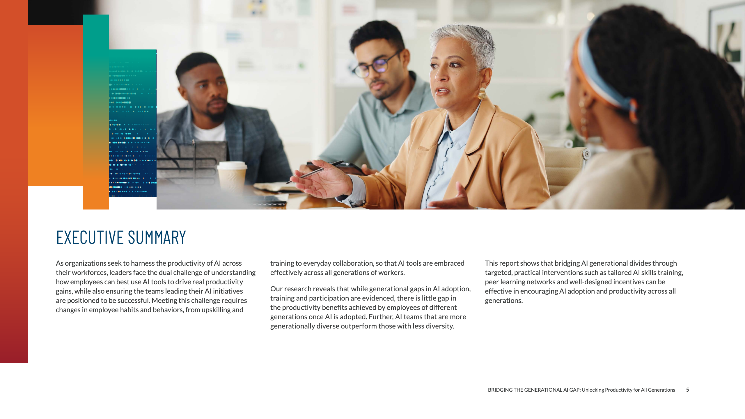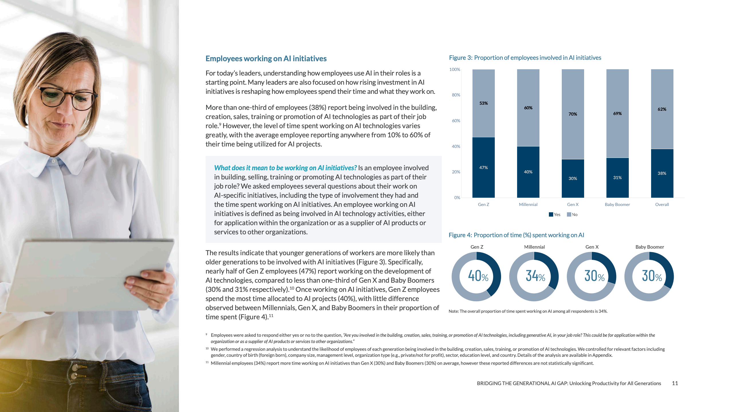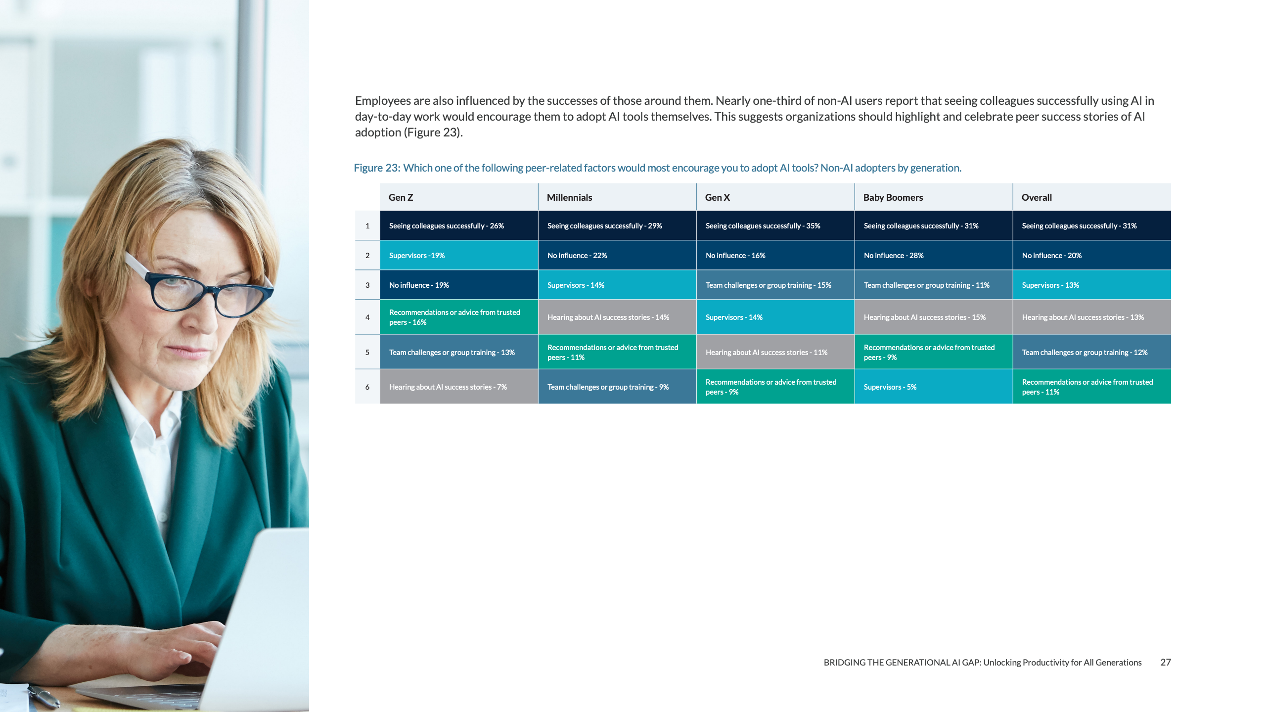 世代多样性在AI团队中尤为重要。高世代多样性团队的生产力达77%,而低多样性团队仅66%。员工在AI项目中投入约34%的时间,Z世代高达40%。参与AI项目的员工报告更高的组织归属感和承诺,尤其是千禧一代和X世代,达58%和51%。然而,信任仍是障碍:仅49%的AI使用者对AI决策有信心,非使用者仅20%。年轻一代略微更信任AI,但差距不大。