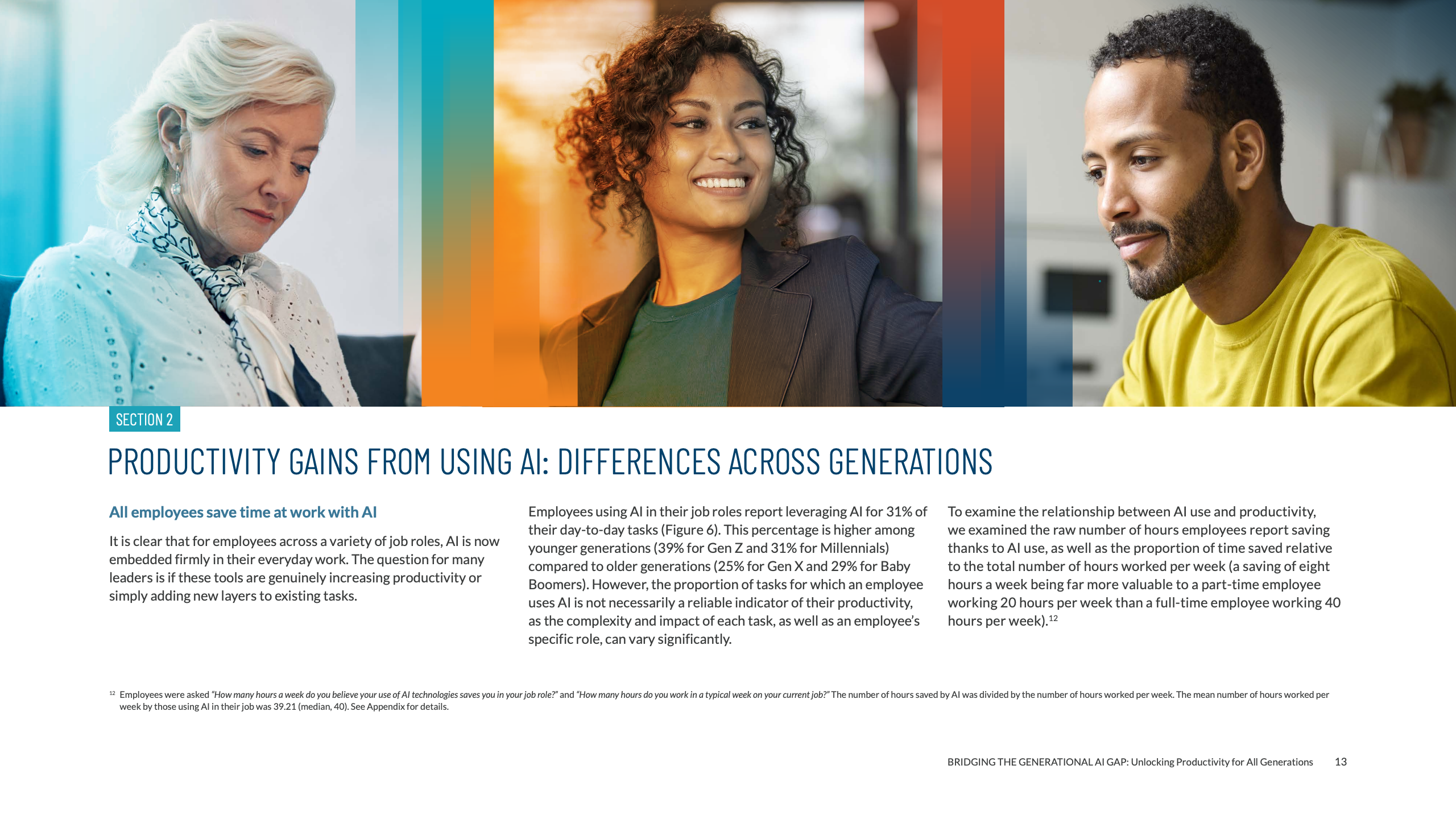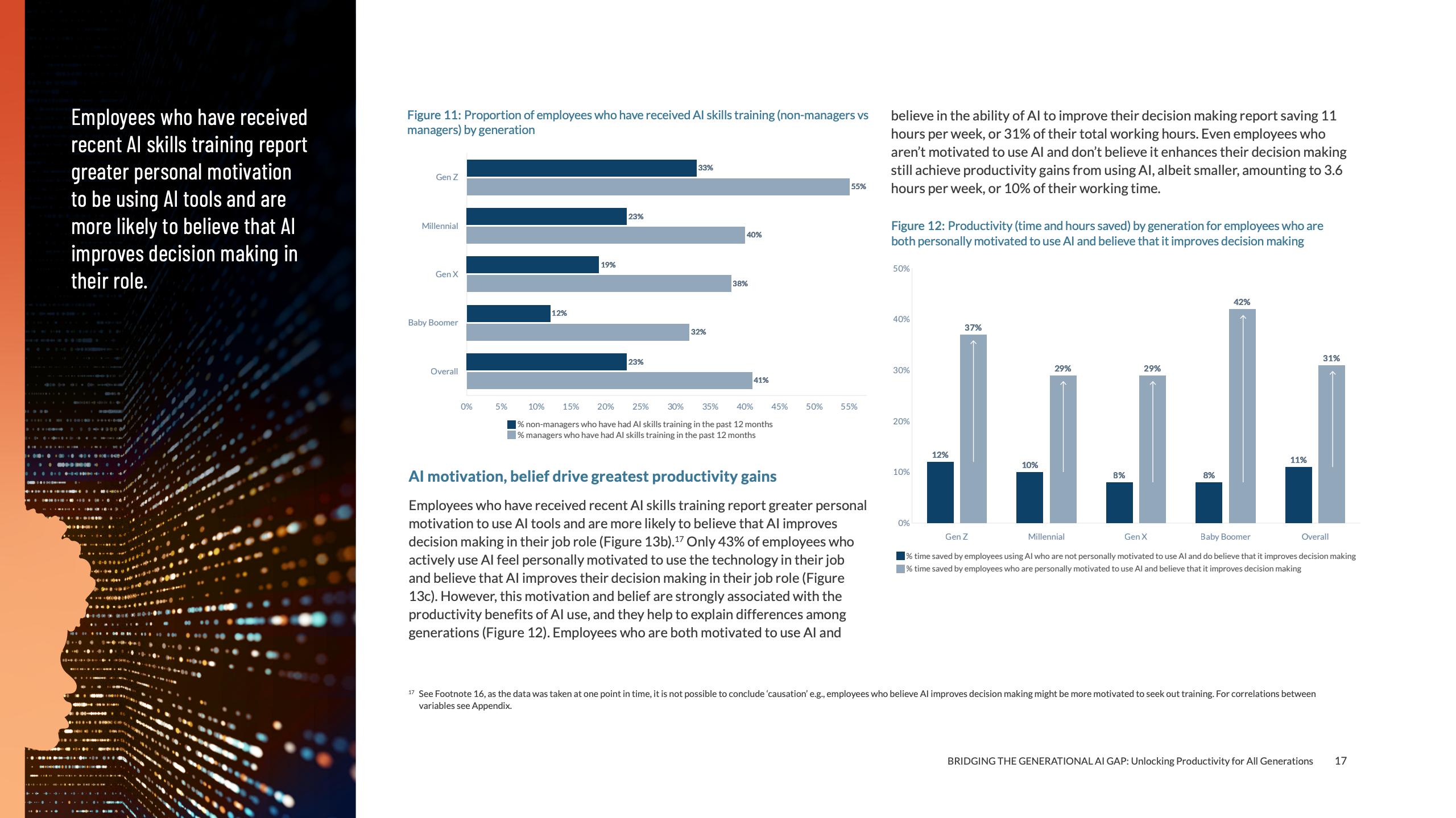 AI技能培训是弥合差距的关键。过去12个月内接受培训的员工中,93%在工作中使用AI,而未培训者仅57%。Z世代培训率达45%,婴儿潮一代仅25%。培训显著提升生产力:有培训者每周节省11小时,占工作时间的28%;无培训者仅节省5小时,占14%。整体而言,使用AI的员工平均每周节省7.5小时,相当于20%的时长,按薪资计算每年价值约1.8万美元。婴儿潮一代的节省价值更高,达2.4万美元,凸显针对老年员工的投资回报。