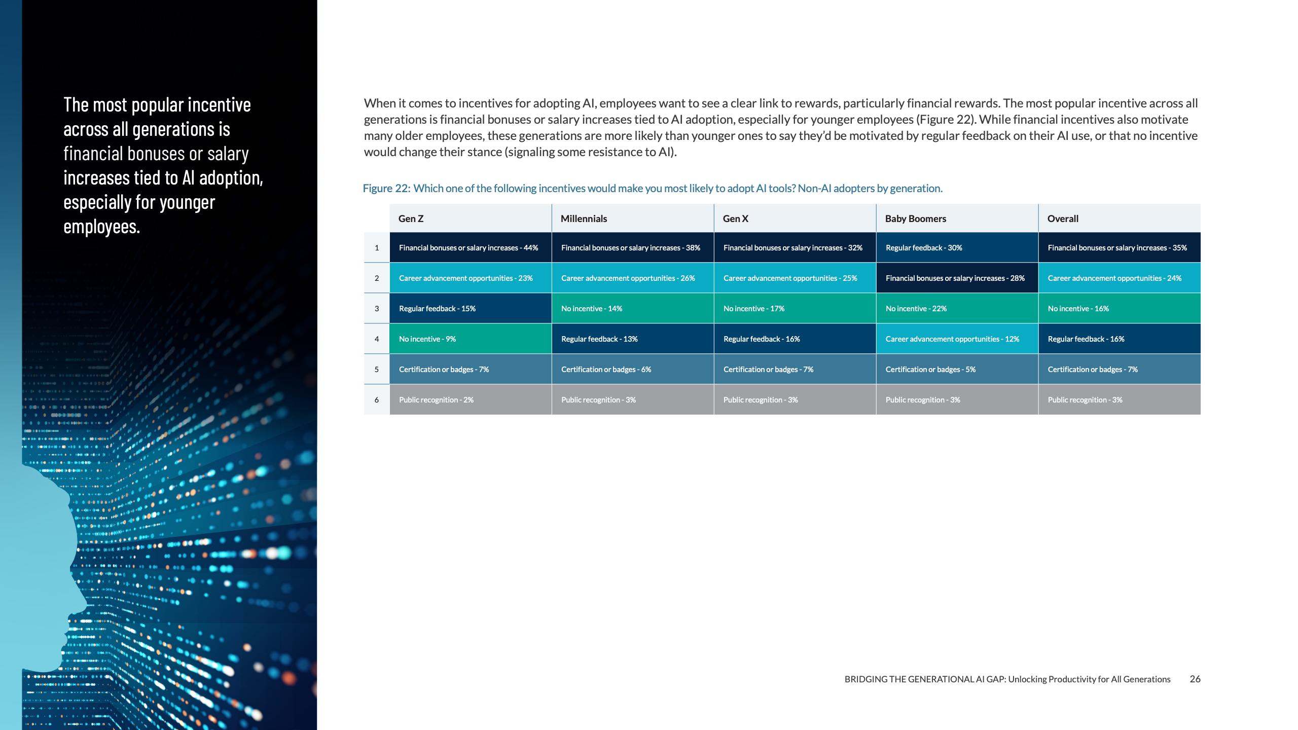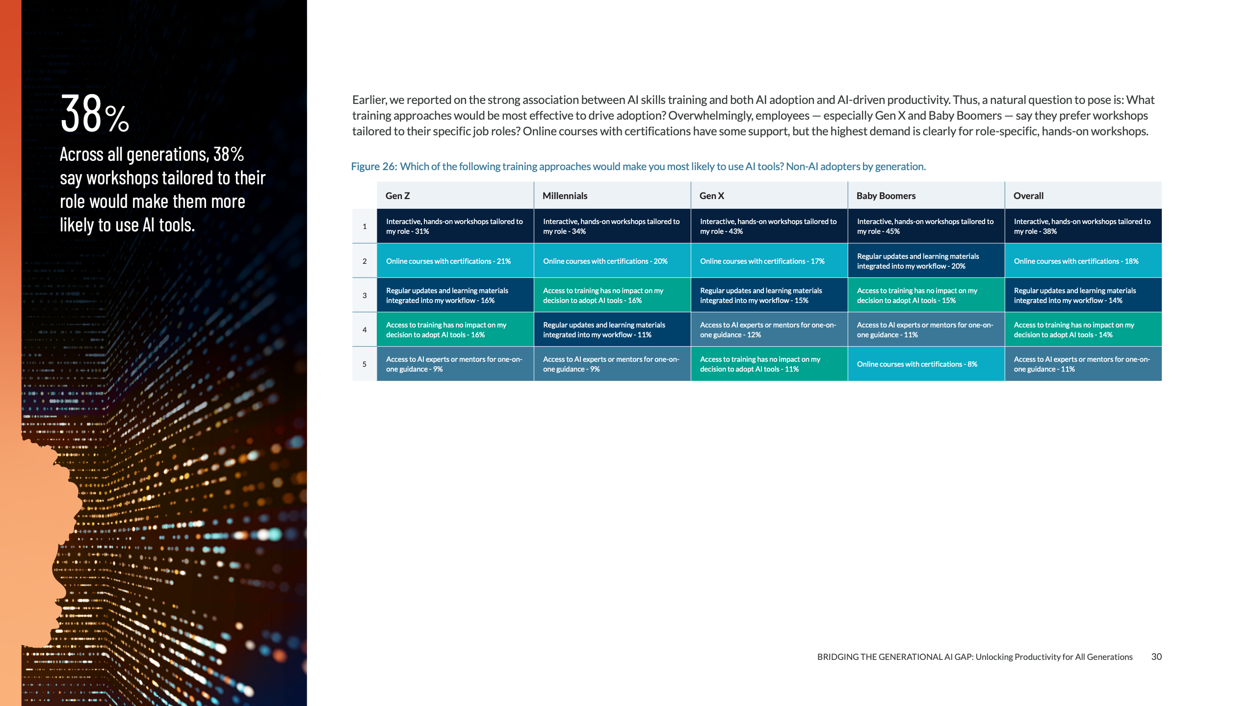 领导者可通过针对性干预推动采用。员工希望AI无缝集成工作流程,28%表示若AI自动嵌入现有软件将更易采用。激励方面,35%青睐与AI采用挂钩的奖金或加薪。培训偏好角色定制工作坊,38%的员工认为这最有效。此外,49%的非AI参与者希望加入项目,并愿投入33%时间。