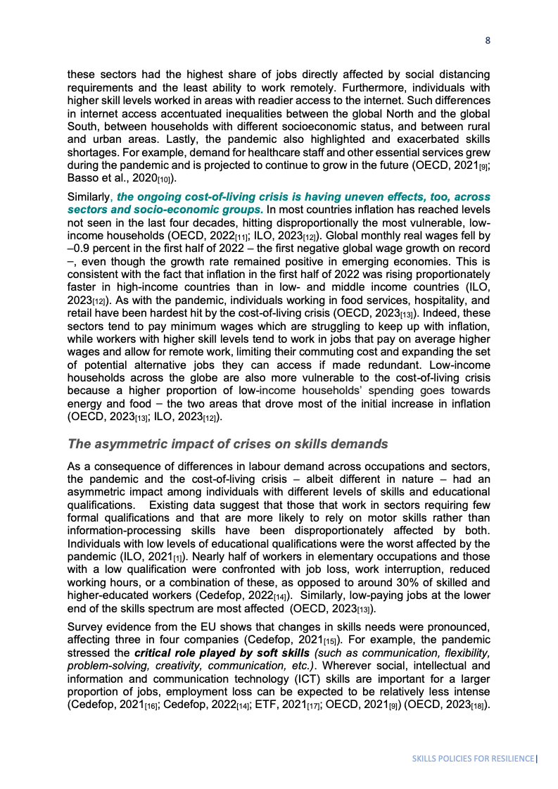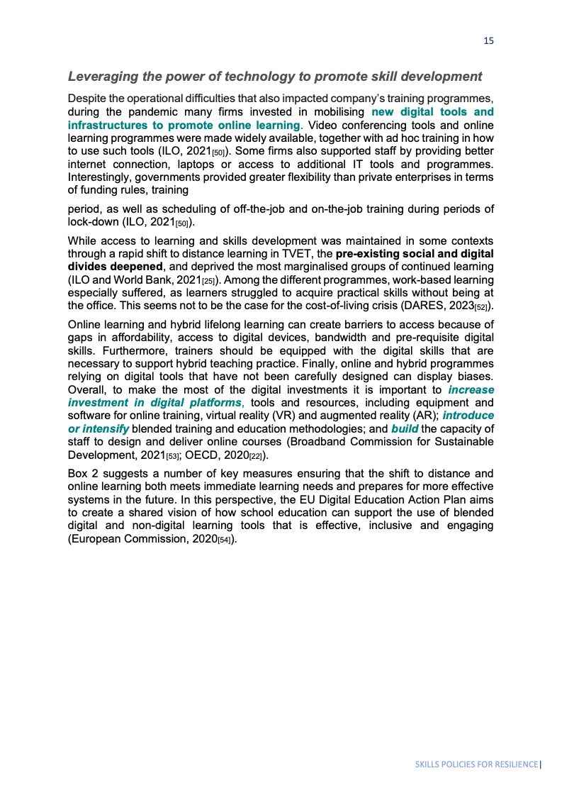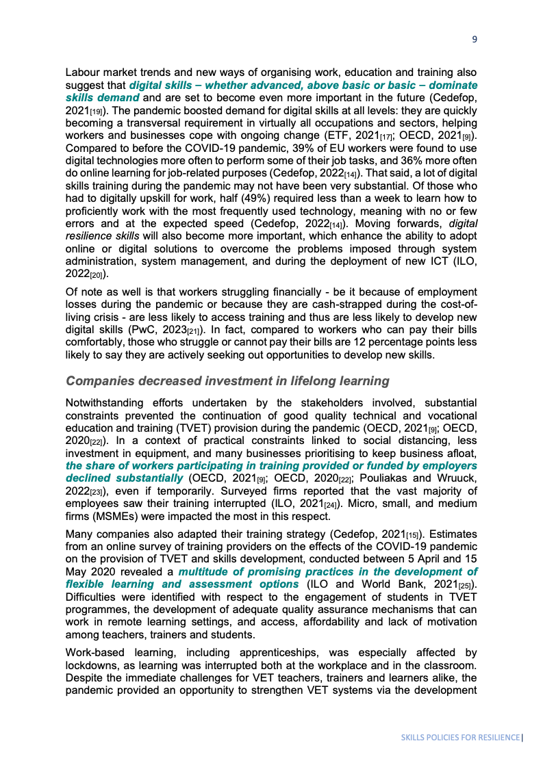 技能需求不对称显现,疫情加速数字化,欧盟75%企业报告技能需求变化。软技能如沟通、灵活性和问题解决需求上升。39%欧盟工人增加数字技术使用,36%更多在线学习。但疫情培训中断严重,企业资助培训减少,尤其中小微企业83%暂停运营。