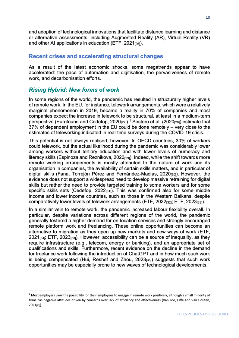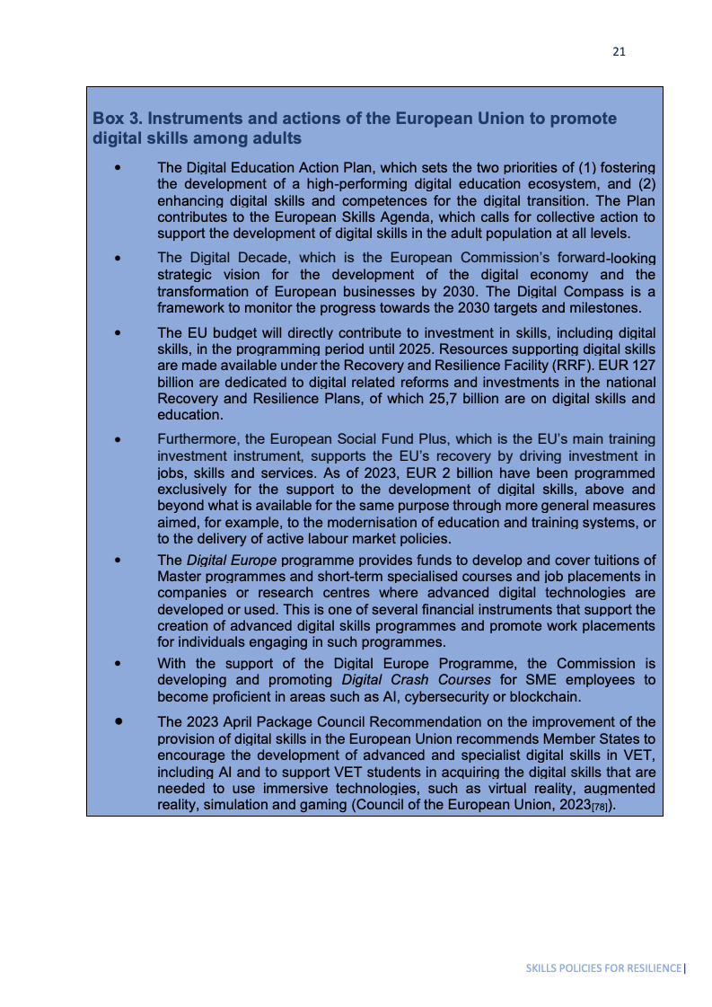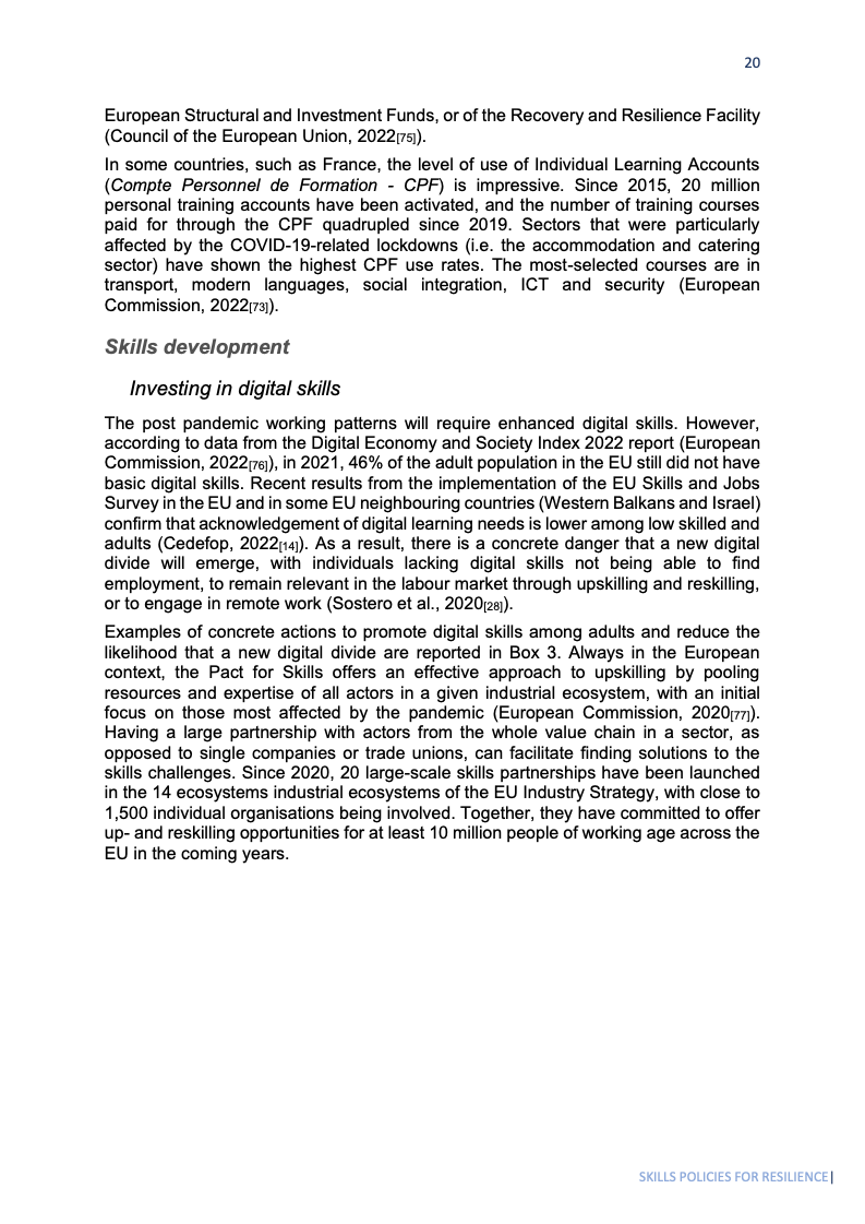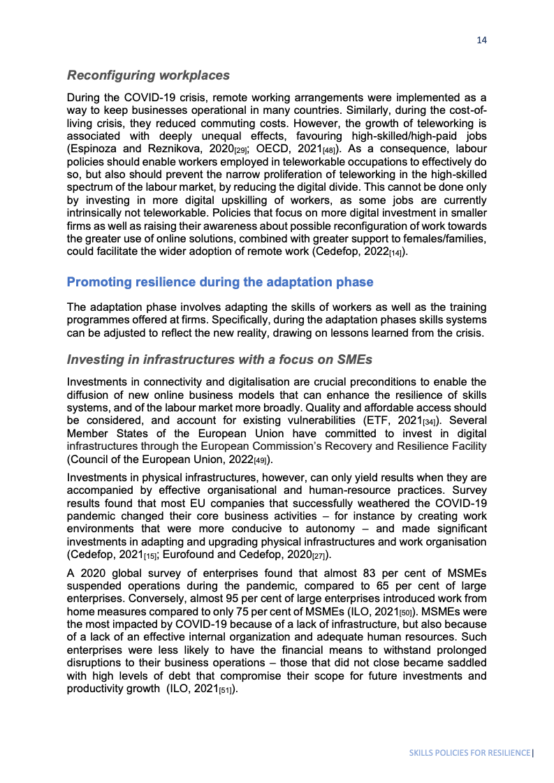 技能需求不对称显现,疫情加速数字化,欧盟75%企业报告技能需求变化。软技能如沟通、灵活性和问题解决需求上升。39%欧盟工人增加数字技术使用,36%更多在线学习。但疫情培训中断严重,企业资助培训减少,尤其中小微企业83%暂停运营。
