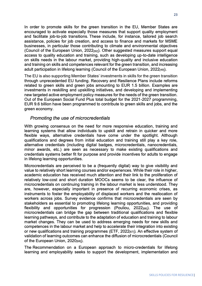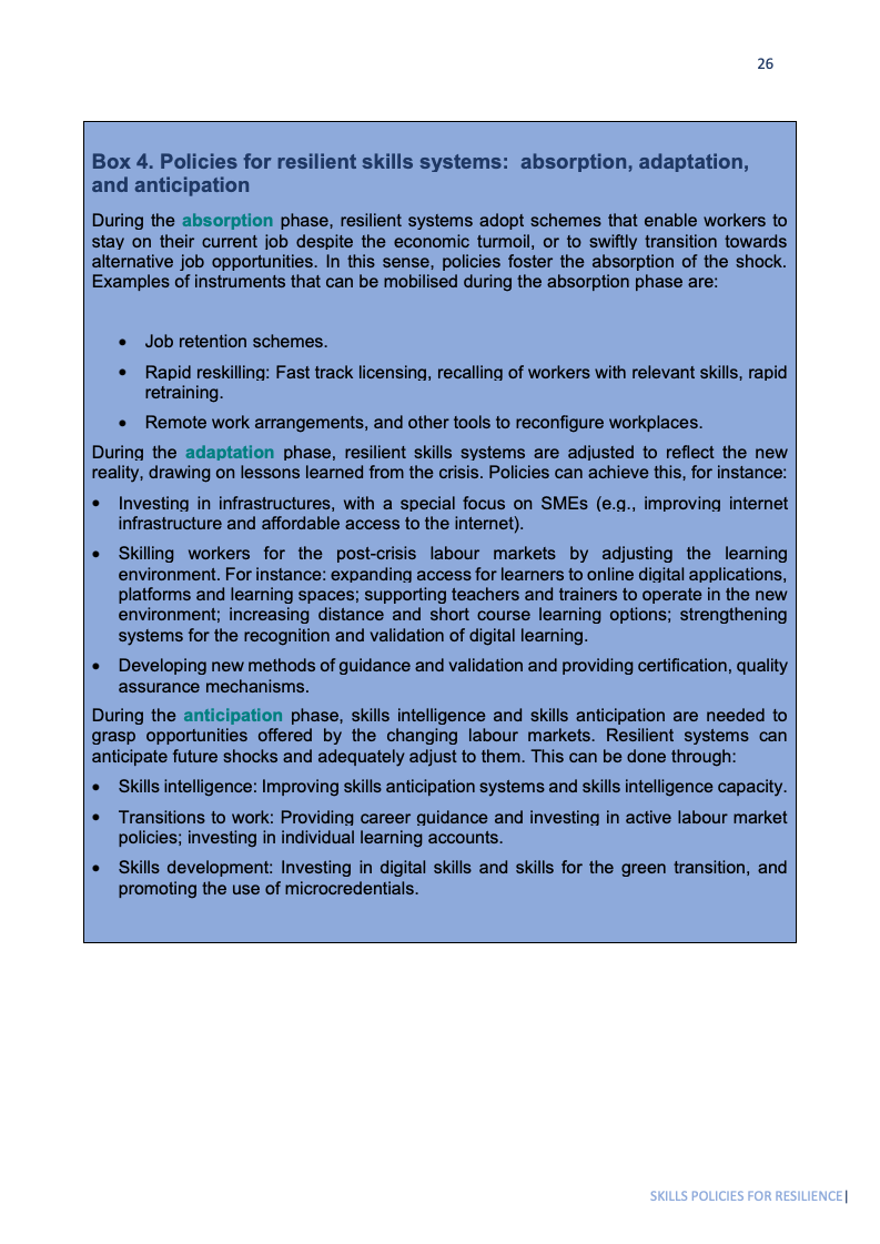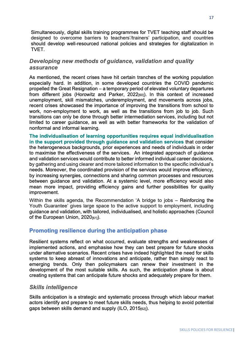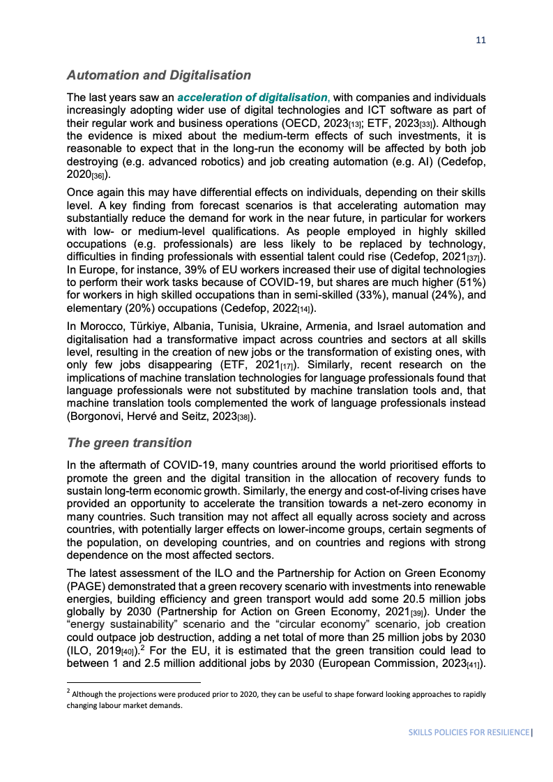 趋势洞察显示,未来技能系统需强化吸收、适应和预期能力。数字化和绿色转型将主导,46%欧盟成人缺乏基本数字技能,绿色职业需求科学、数字和软技能。终身学习和微凭证将成关键,推动包容性恢复,避免新数字鸿沟,确保脆弱群体韧性。