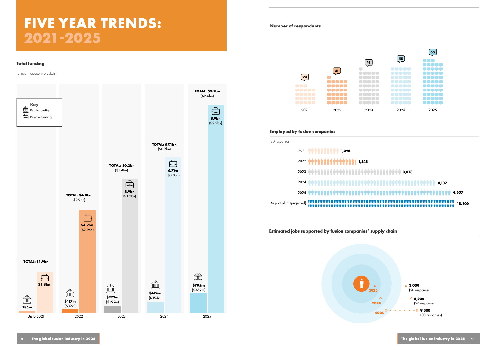 2025年,全球核聚变产业迎来关键转折。融合产业协会的最新调查显示,参与企业达53家,比2021年的23家增长一倍多。累计融资总额突破97亿美元,其中2025年新增26.4亿美元,创历史新高。私有资金占89.7亿美元,公共资金达7.95亿美元,同比增长84%。这一增长反映出投资者对聚变技术的信心日益增强,尽管全球科技投资环境趋紧。