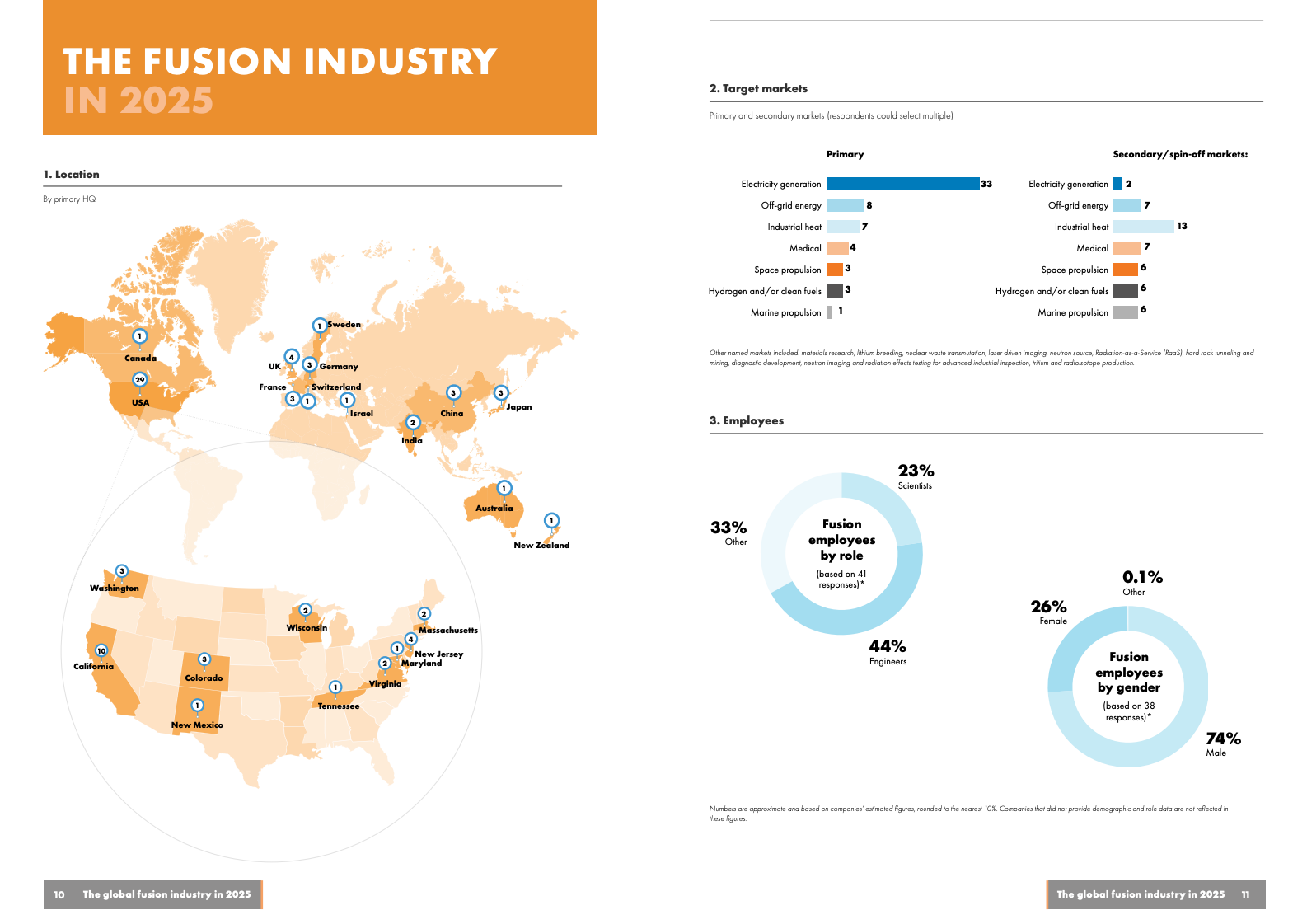技术路径多样化。磁约束方法占主导,25家公司采用,包括7家星形仪和3家球形托卡马克。惯性约束11家,磁惯性6家。燃料以氘-氚为主,36家公司选用。能量捕获多用锂中子毯或液体金属热交换器。市场目标首选发电,其次为离网能源和工业热。次级市场包括医疗、太空推进和氢燃料生产。员工角色数据显示,研发人员占比高,确保多路径并进。