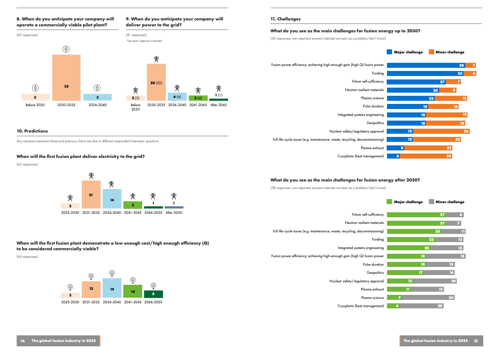 挑战犹存。2030年前,主要障碍为实现高Q值增益、资金获取和氚自给。27家公司视氚供应为重大问题,24家担忧中子耐性材料。工程难题包括脉冲持续和集成系统。2030年后,生命周期管理如废物回收和退役更突出。总体需770亿美元额外投资,中位数公司需7亿美元建首厂。尽管如此,政策支持和供应链成熟正化解瓶颈。