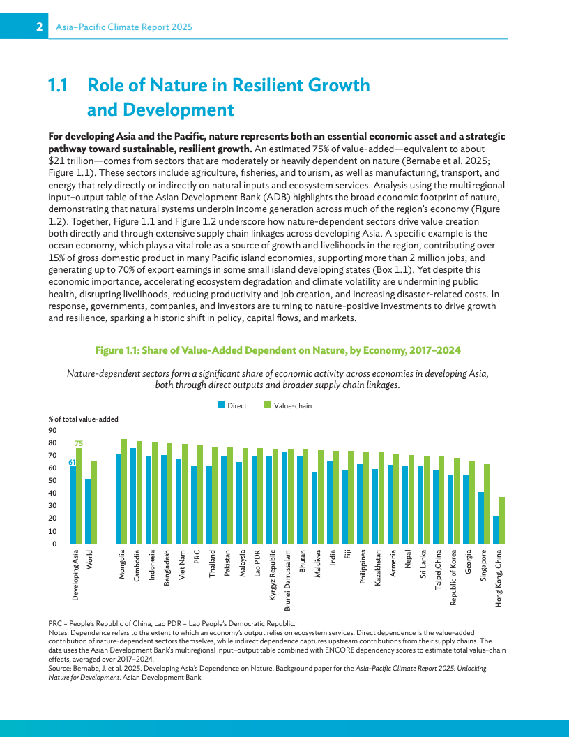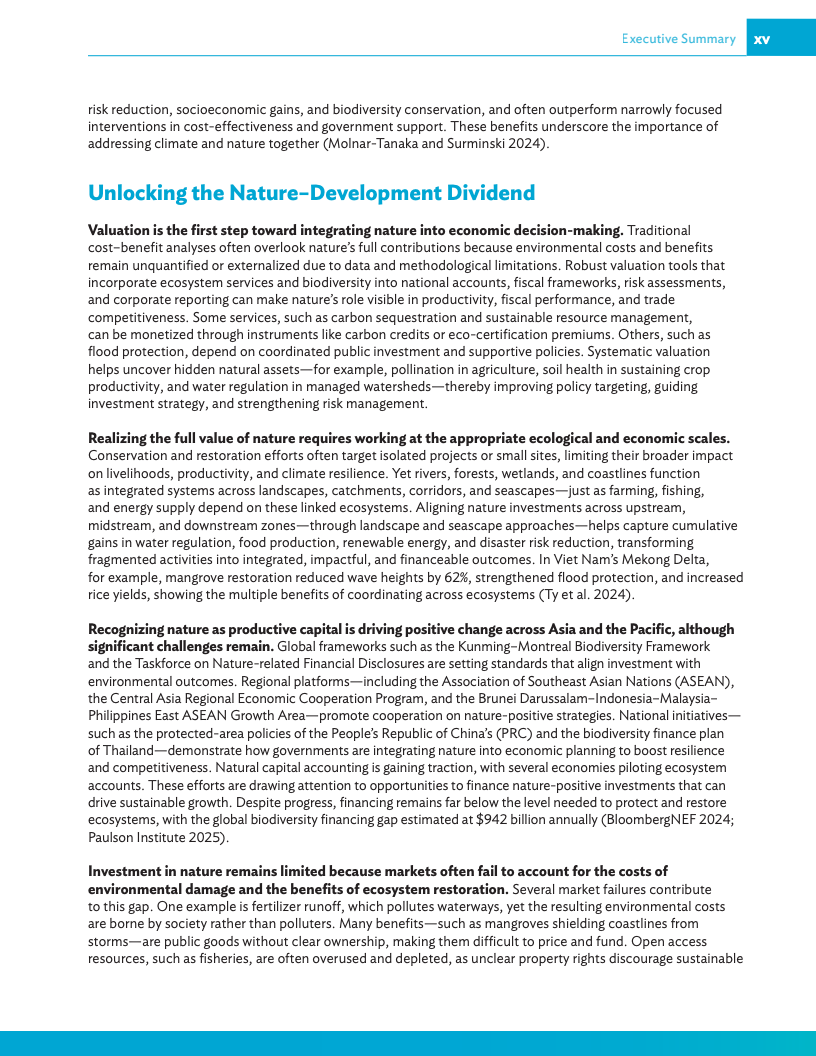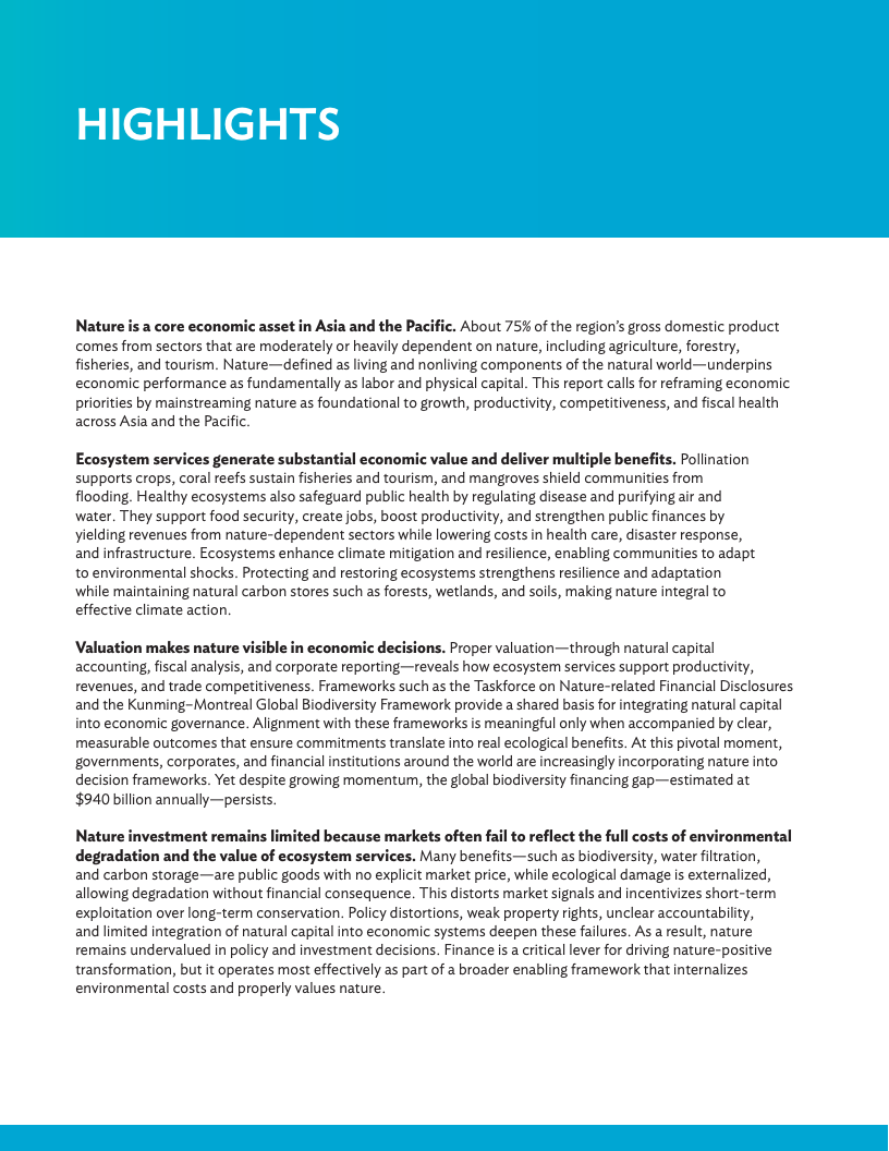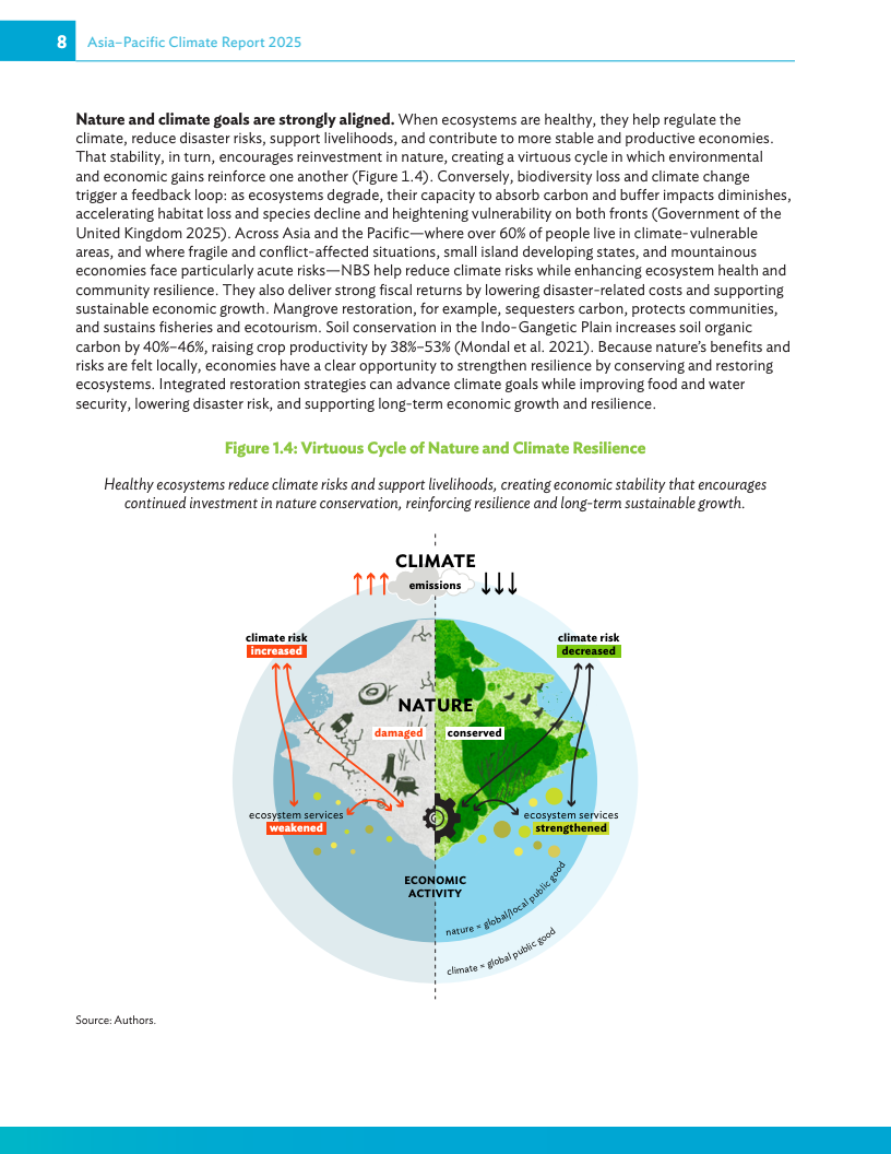 《2025年亚太地区气候报告:释放自然促发展》呼吁各国政府将自然保护纳入经济运行的核心环节,并敦促各国升级经济“运行体系”,即引导投资的治理、政策与数据基础,从而为私人资金流向养护、韧性和创新等领域创造有利条件。
