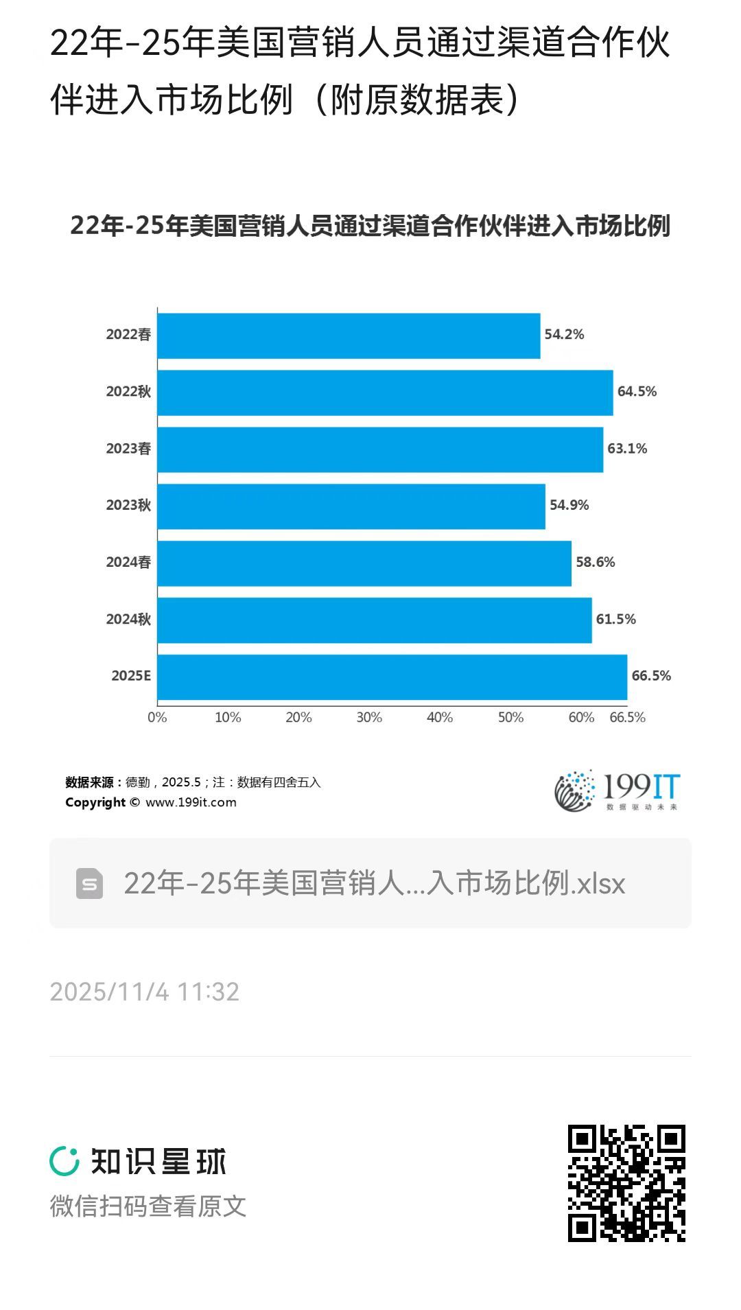22年-25年美国营销人员通过渠道合作伙伴进入市场比例(附原数据表) ​​​