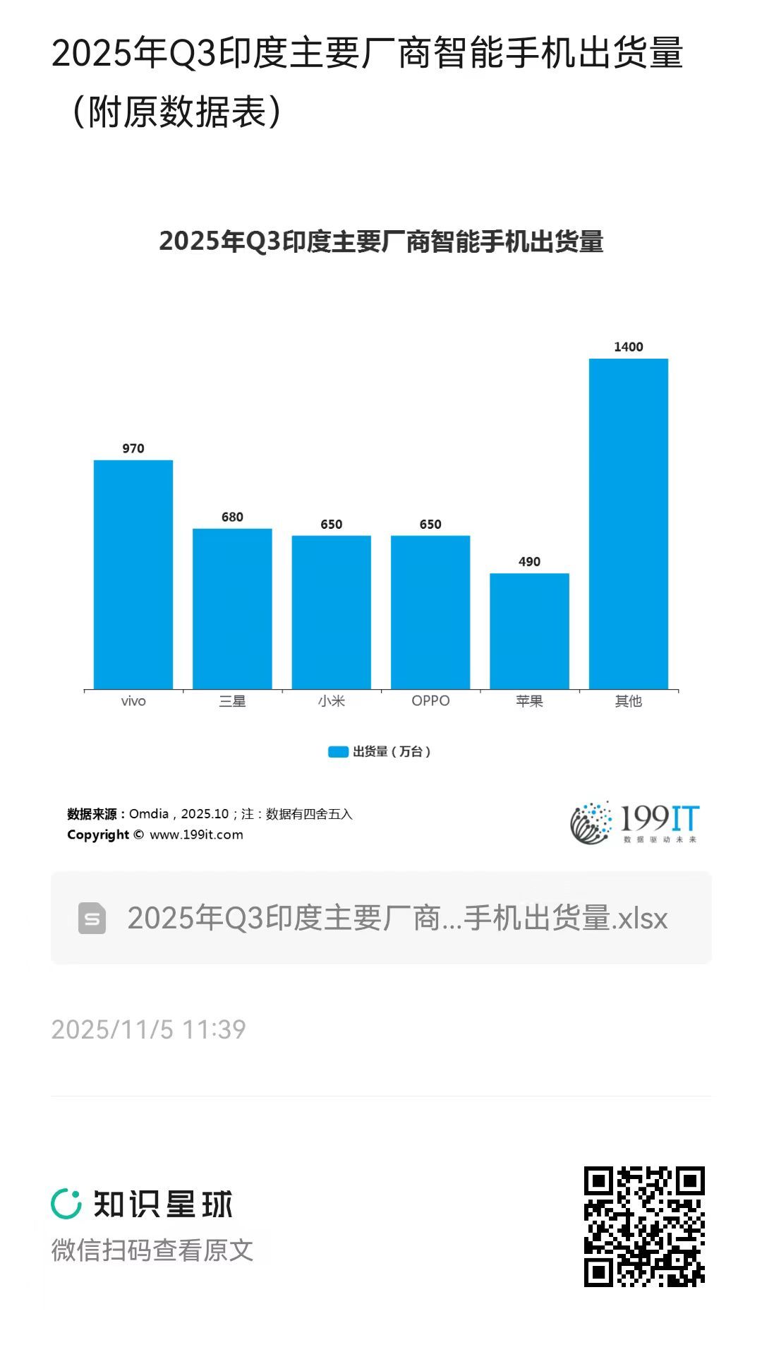 2025年Q3印度主要厂商智能手机出货量(附原数据表) ​​​