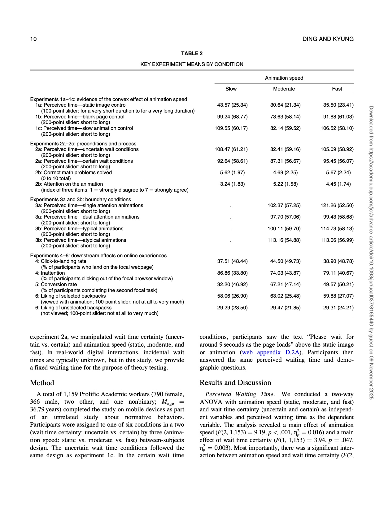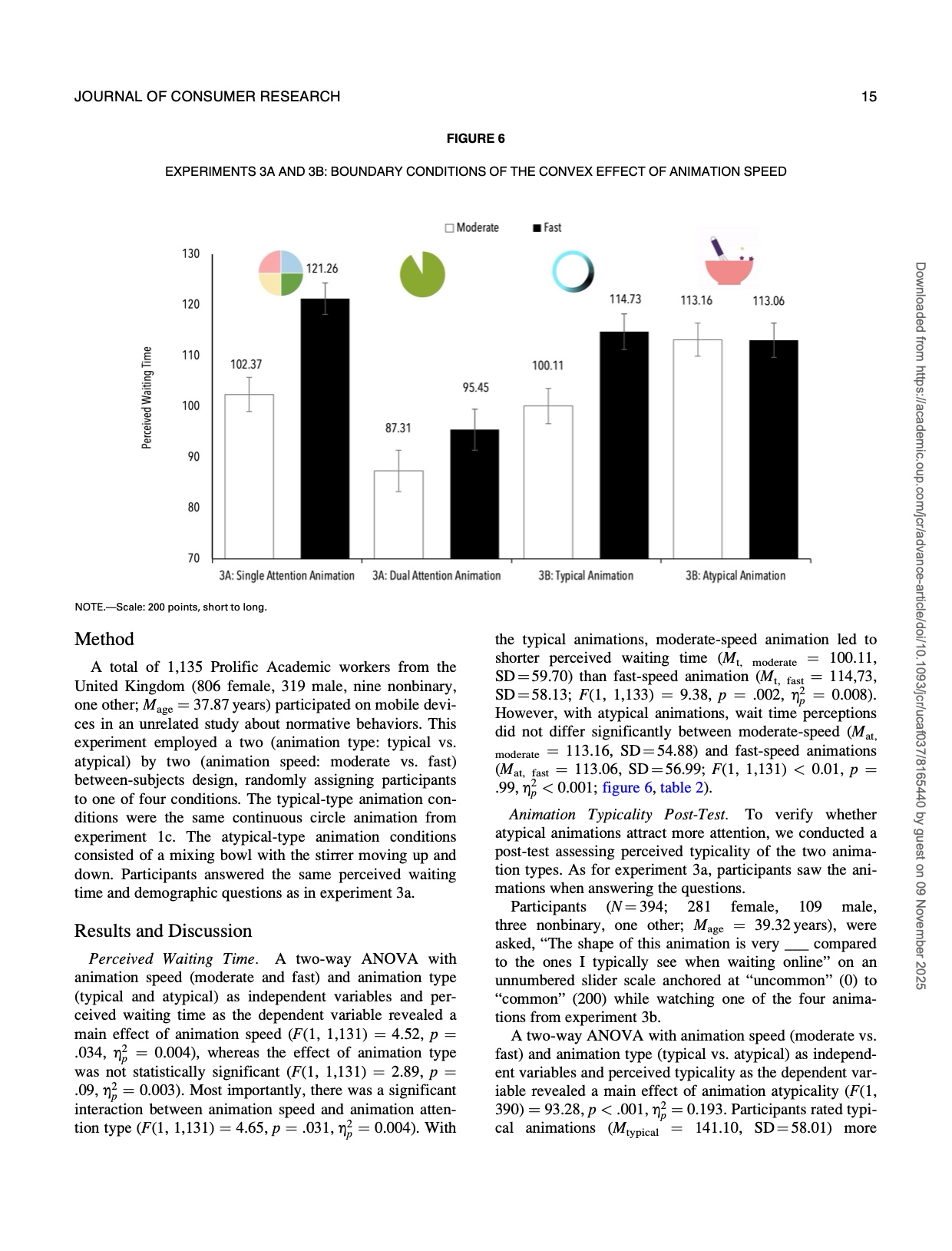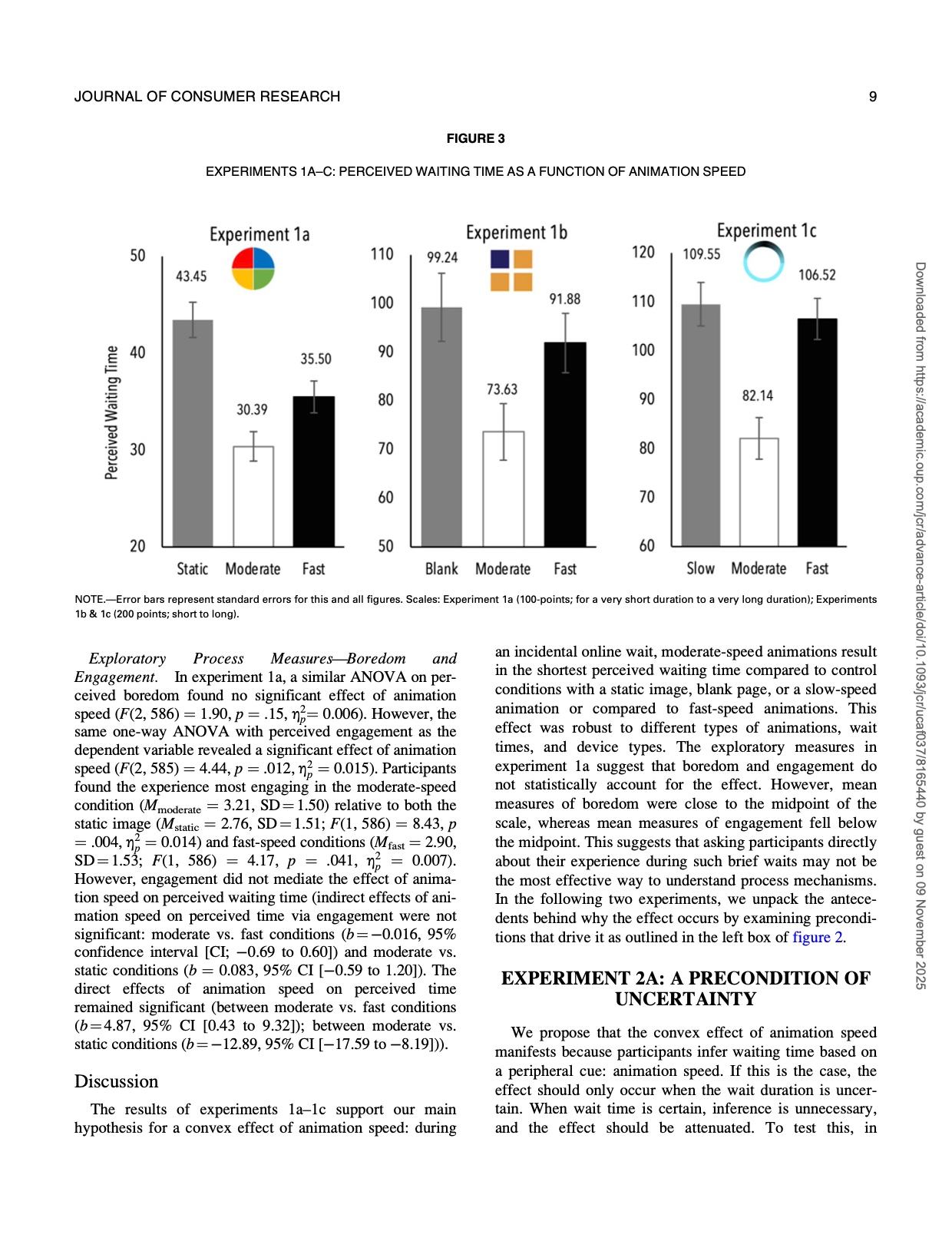 核心发现源于六项实验,揭示动画速度与感知等待时间的凸形关系:中等速度动画使等待感知最短,优于静态图像、空白页、慢速或快速动画。实验1a中,静态图像感知时间为43.57(100分量表),中等速度30.64,快速35.50。实验1b空白页为99.24,中等73.63,快速91.88(200分量表)。实验1c慢速109.55,中等82.14,快速106.52。该效应在7至30秒等待、不同动画类型和设备上稳健,参与者总数达1457人。