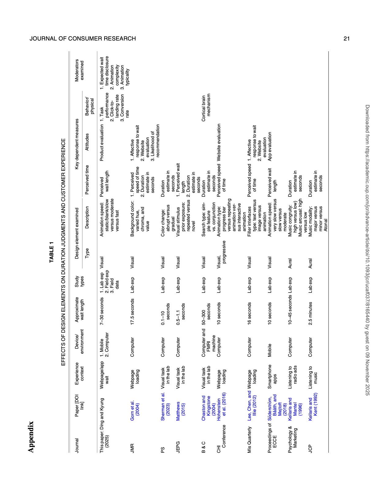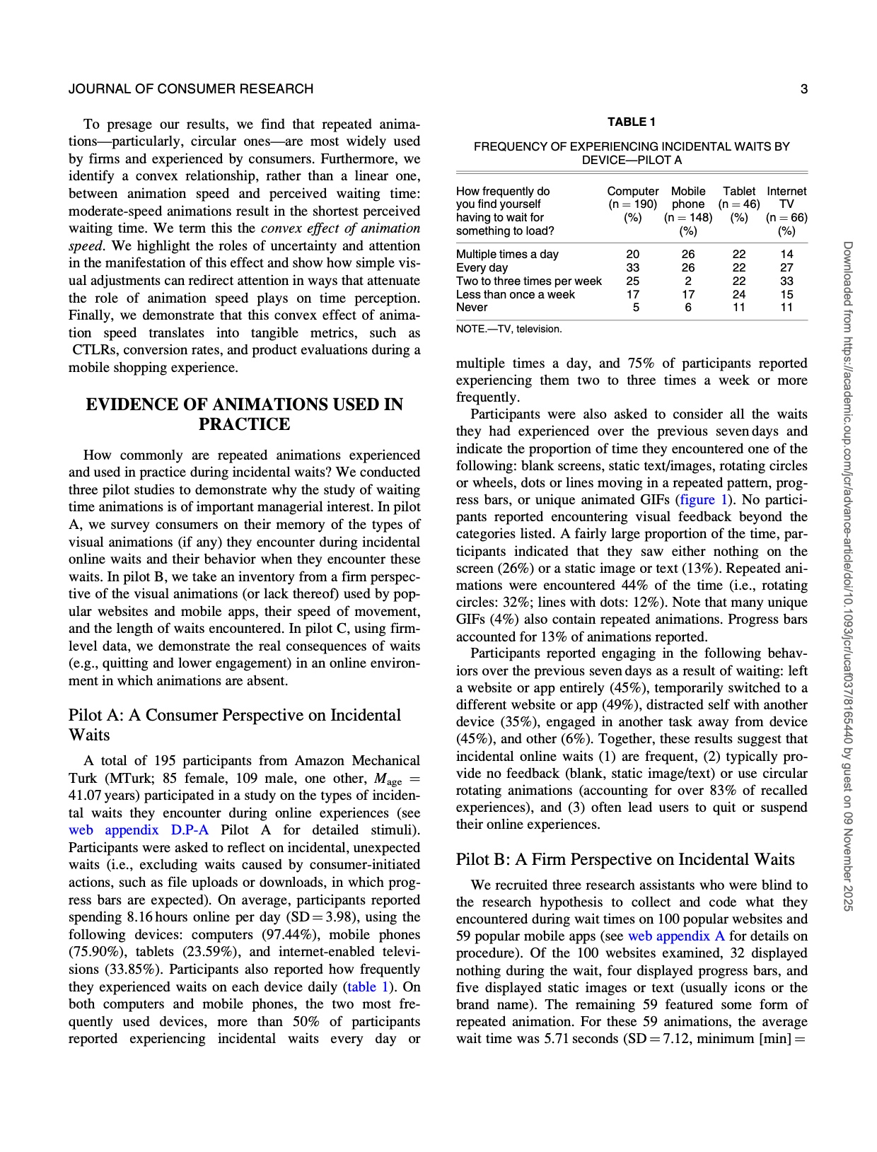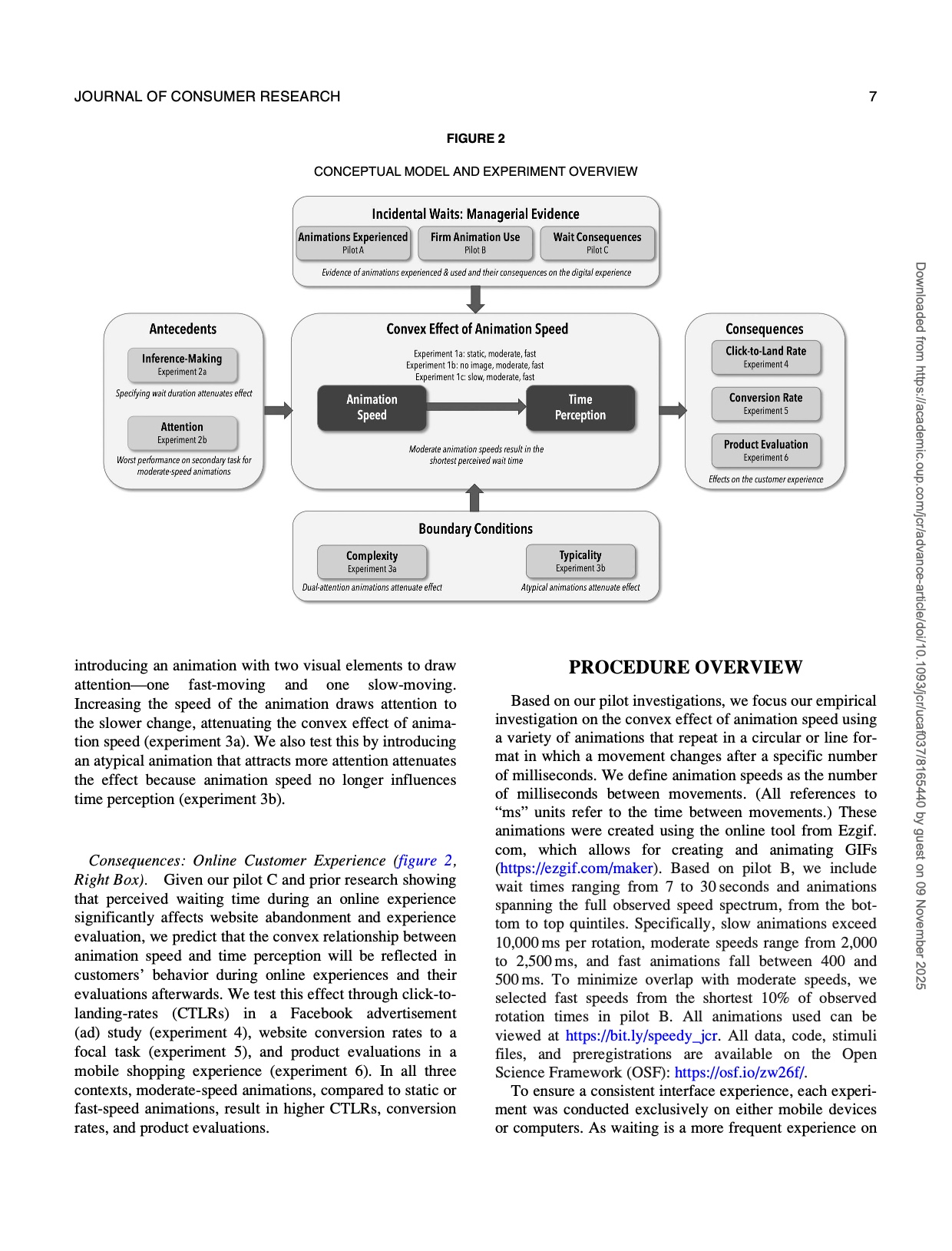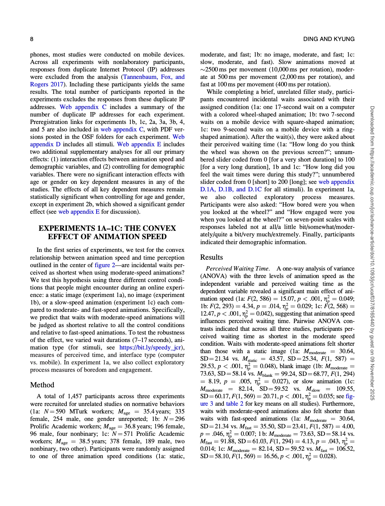 核心发现源于六项实验,揭示动画速度与感知等待时间的凸形关系:中等速度动画使等待感知最短,优于静态图像、空白页、慢速或快速动画。实验1a中,静态图像感知时间为43.57(100分量表),中等速度30.64,快速35.50。实验1b空白页为99.24,中等73.63,快速91.88(200分量表)。实验1c慢速109.55,中等82.14,快速106.52。该效应在7至30秒等待、不同动画类型和设备上稳健,参与者总数达1457人。