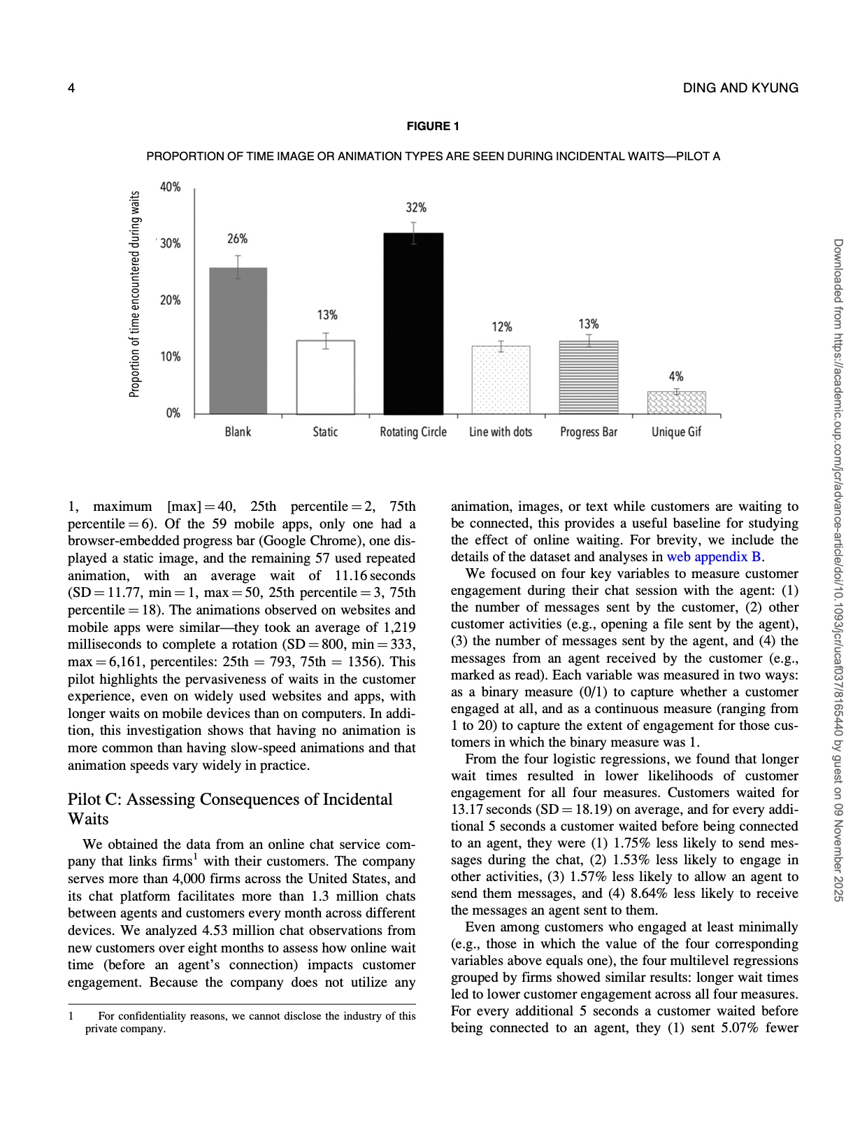 利用一家在线聊天服务公司的453万条聊天数据分析,新客户平均等待13.17秒连接代理。每额外5秒等待,用户发送消息概率降低1.75%,其他活动参与降低1.53%,代理发送消息概率降1.57%,接收消息概率降8.64%。即使在已参与的用户中,每5秒额外等待导致消息发送减少5.07%,其他活动减少0.36%,代理消息发送降5.51%,接收降1.03%。这证实,等待直接削弱客户参与度,增加退出风险。