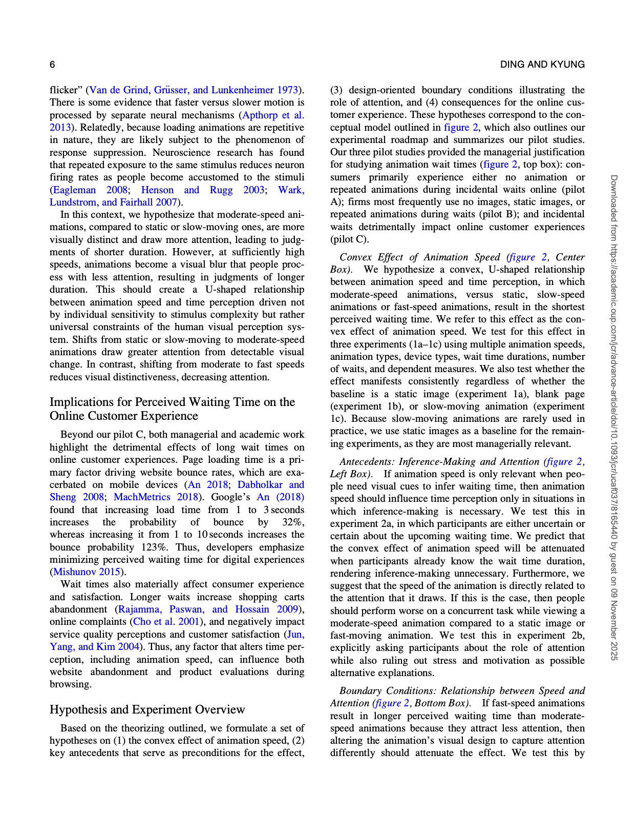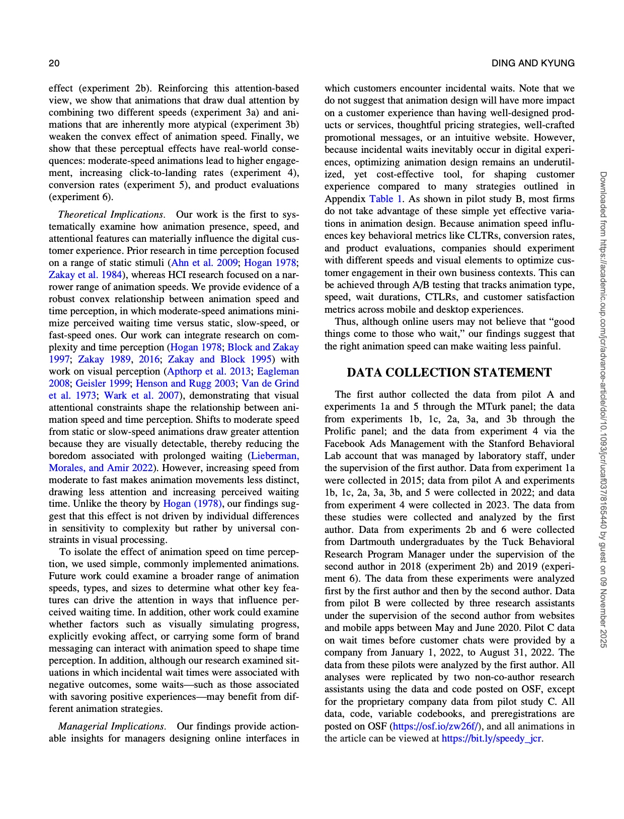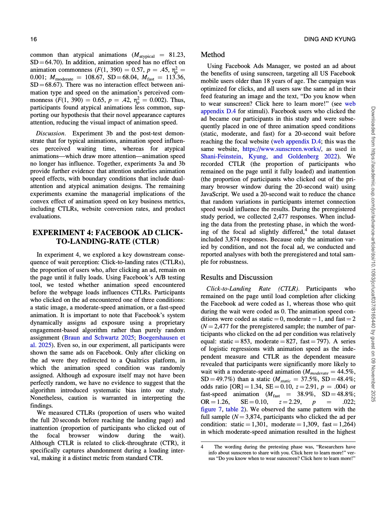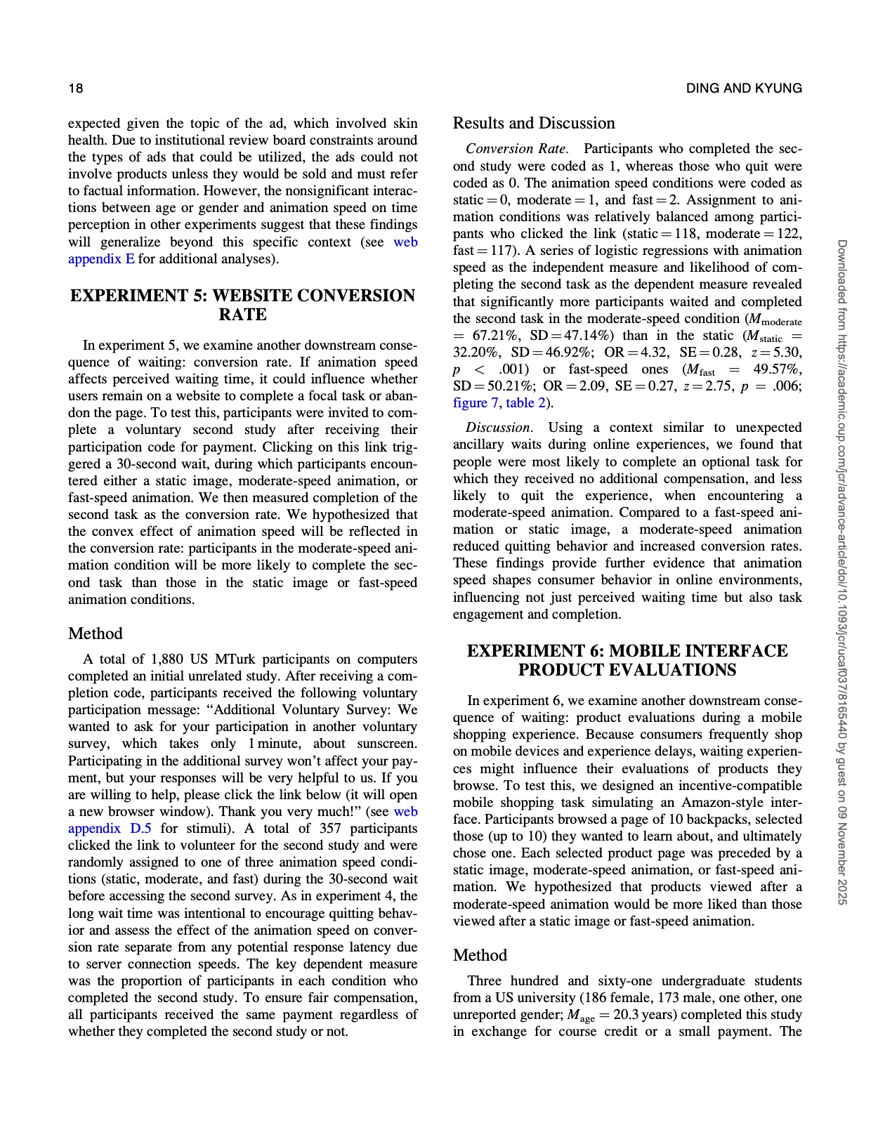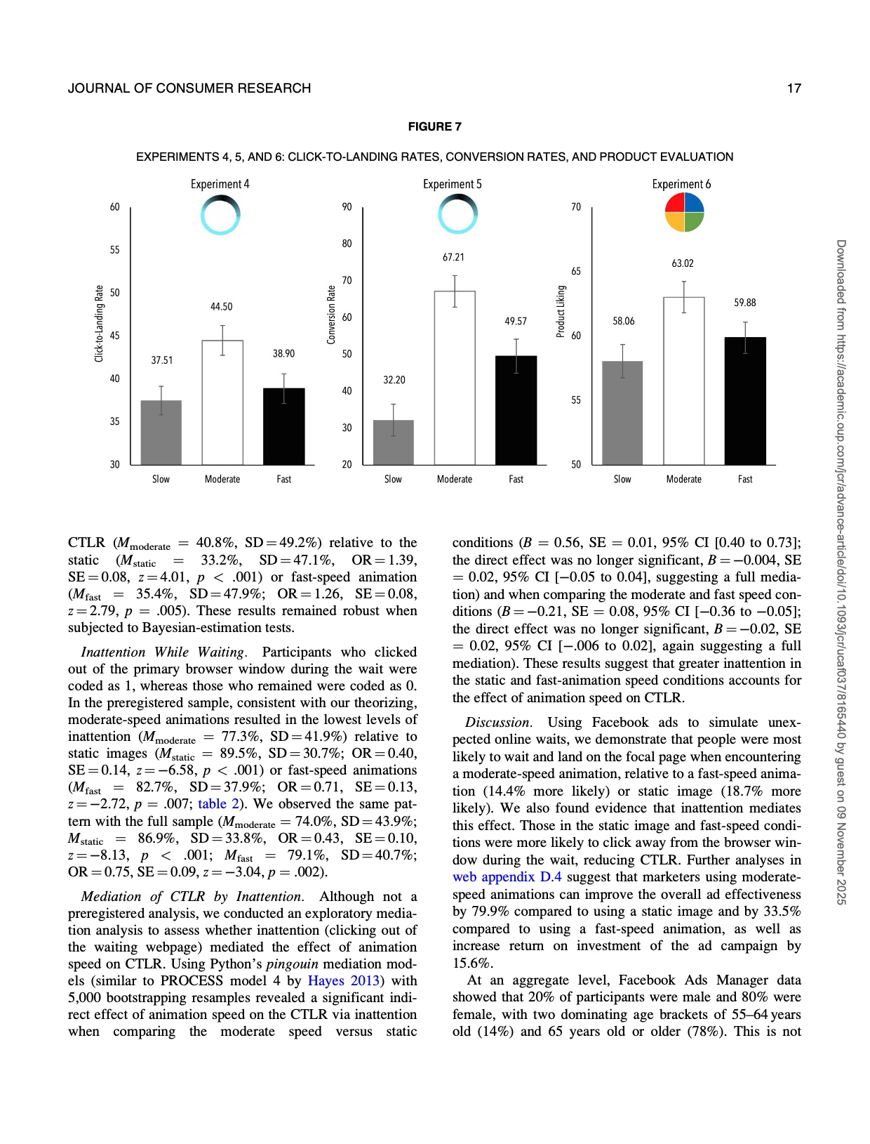 商业影响显著。实验4的Facebook广告中,中等速度点击登陆率44.50%,静态37.51%,快速38.90%;不注意率(点击离开)中等74.03%,静态86.86%,快速79.11%。样本2477人,中等动画提升广告效果79.9%(对静态),投资回报15.6%。实验5网站转换率,中等67.21%,静态32.20%,快速49.57%。实验6移动购物,观看中等动画背包喜好63.02,静态58.06,快速59.88;未观看者均29左右。该效应转化为更高保留和评价。