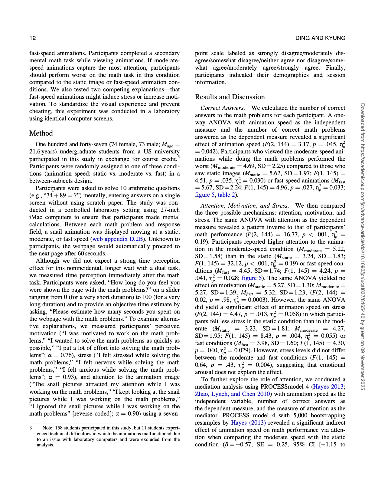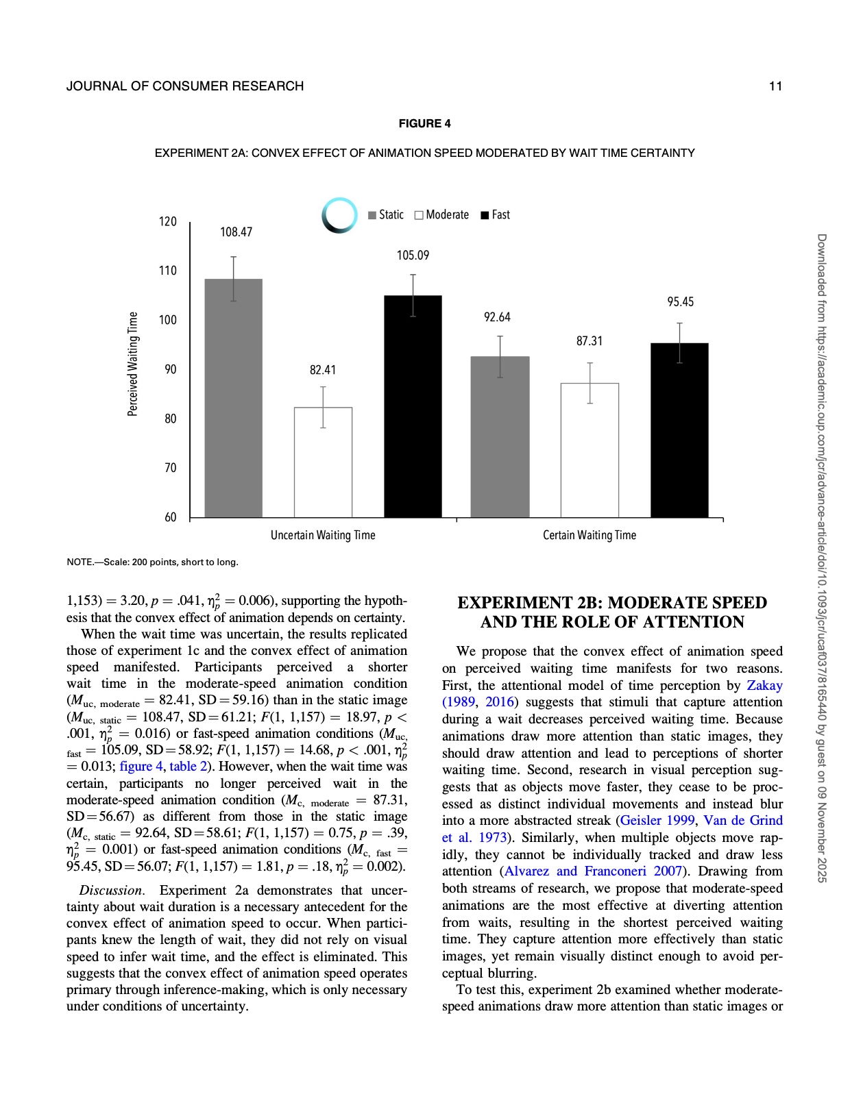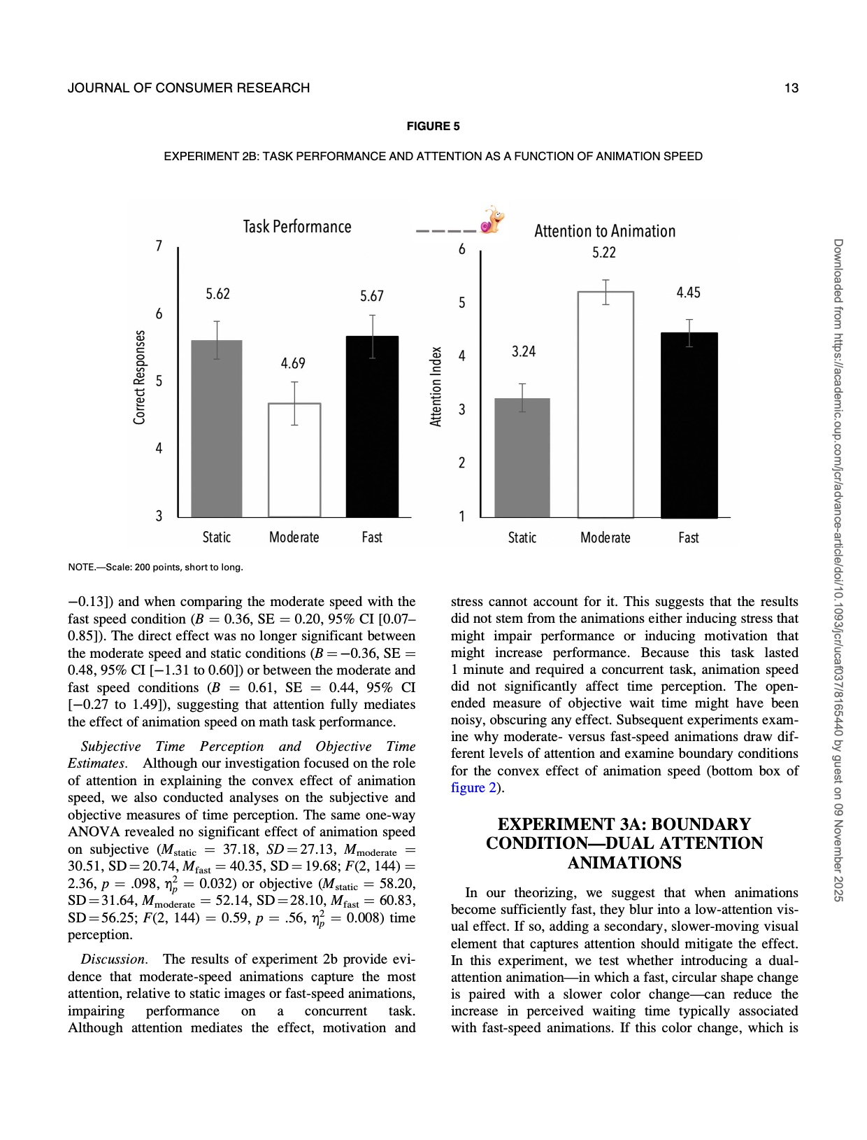 机制上,不确定性是前提。实验2a显示,在不确定等待下,中等速度82.41,静态108.47,快速105.09;但告知等待9秒后,该差异消失,中等87.31,静态92.64,快速95.45。注意力中介作用突出,实验2b中,中等速度动画下数学任务正确率最低(4.69/10),注意力指数最高(5.22/7),证实中等速度最吸引目光,而快速动画因视觉模糊降低注意。