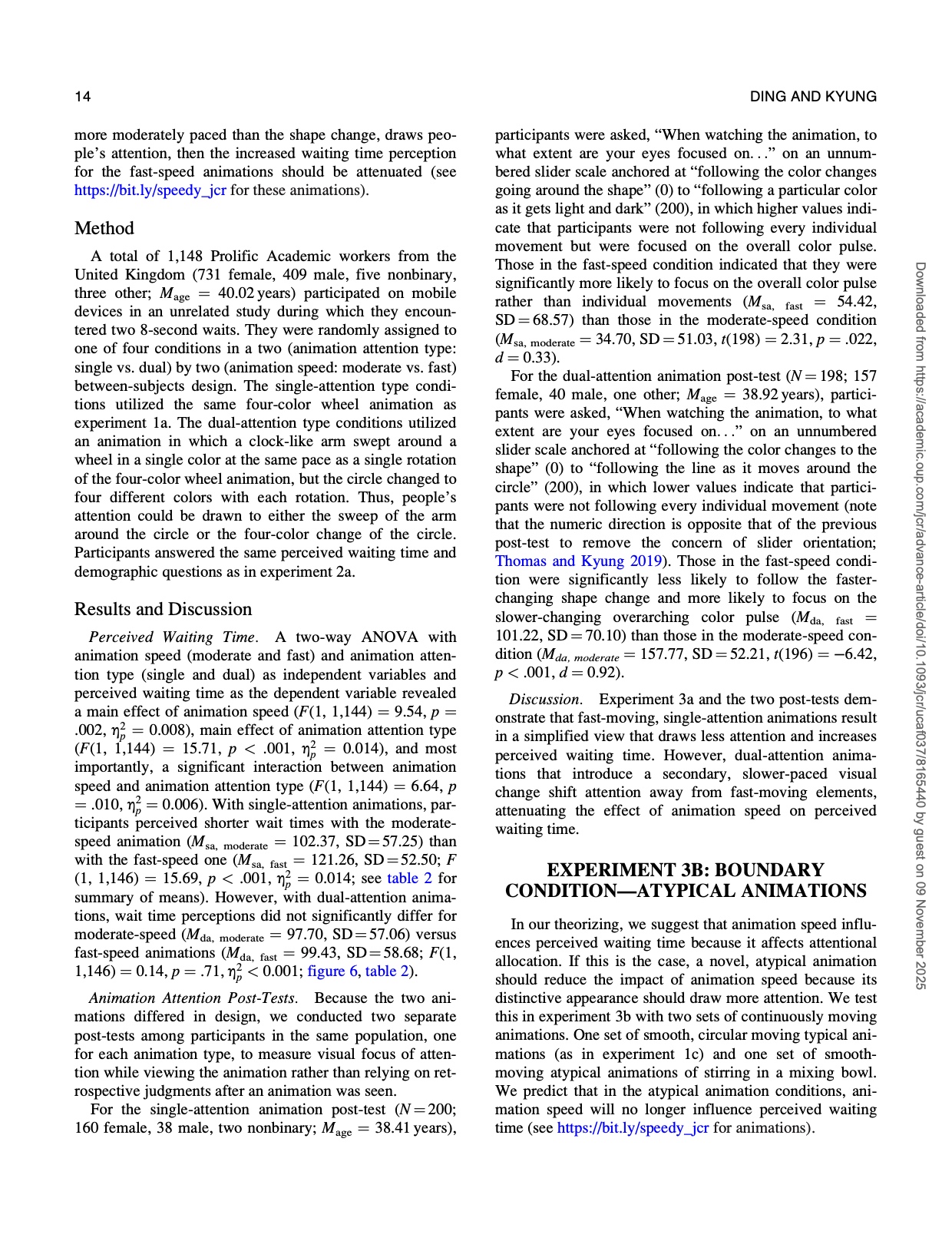 边界条件验证注意力主导。实验3a的双注意力动画(快速形状+慢速颜色变化)中,中等97.70,快速99.43,无差异;单注意力下,中等102.37,快速121.26。实验3b非典型动画(搅拌碗)中,中等113.16,快速113.06,等同;典型圆圈下,中等100.11,快速114.73。参与者总数1135人,这些设计调整可弱化速度效应。