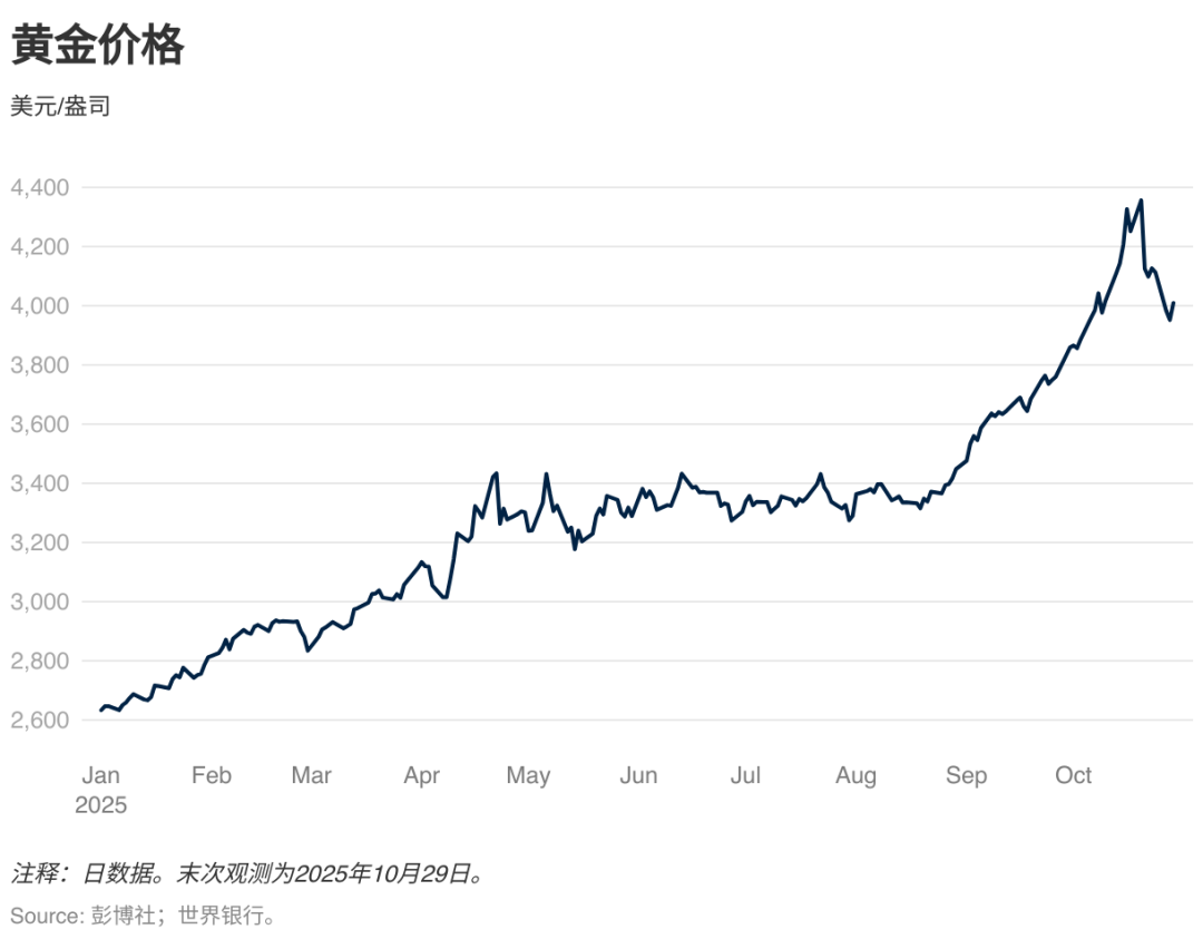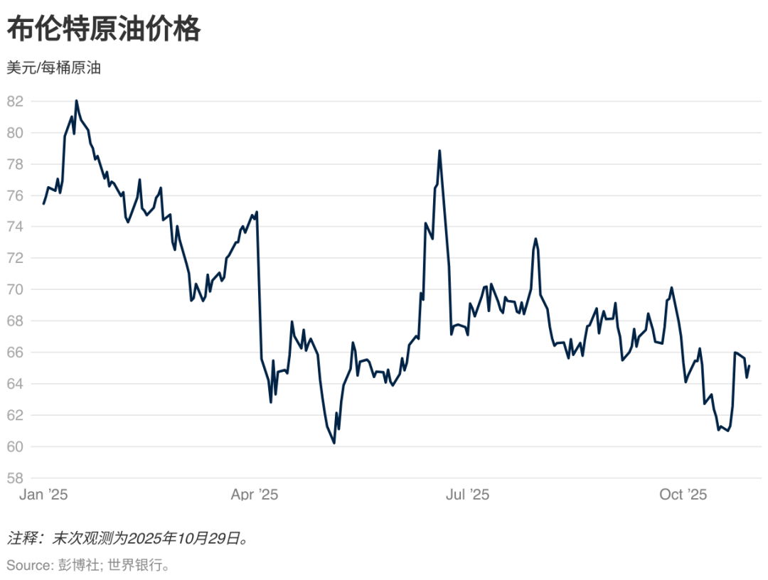 在过去六个月里,大宗商品市场受到经济活动低迷、贸易限制措施、政策不确定性和天气对供应的影响等方面的压力。由于供应过剩和需求疲软,尤其是中国的需求疲软,2025年前九个月布伦特原油价格下跌14%,尽管美国对俄罗斯的石油制裁一度导致短期油价暴涨。受欧洲对液化天然气的强劲需求推动,天然气价格飙升;基本金属价格在2025年三季度出现回升,主要得益于全球需求坚挺、贸易政策变动以及供应中断、尤其是铜矿供应中断。贵金属价格继续上涨,在投资需求旺盛、央行购金和地缘政治不确定性加剧的推动下,黄金和白银价格屡创新高。与此同时,由于粮食供应充足,食品类大宗商品价格连续第三个季度下跌;由于需求强劲、贸易限制措施和产量不足,化肥价格飙升。