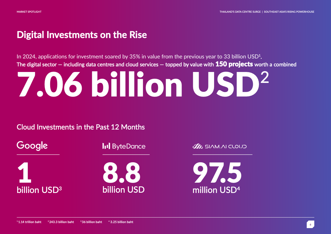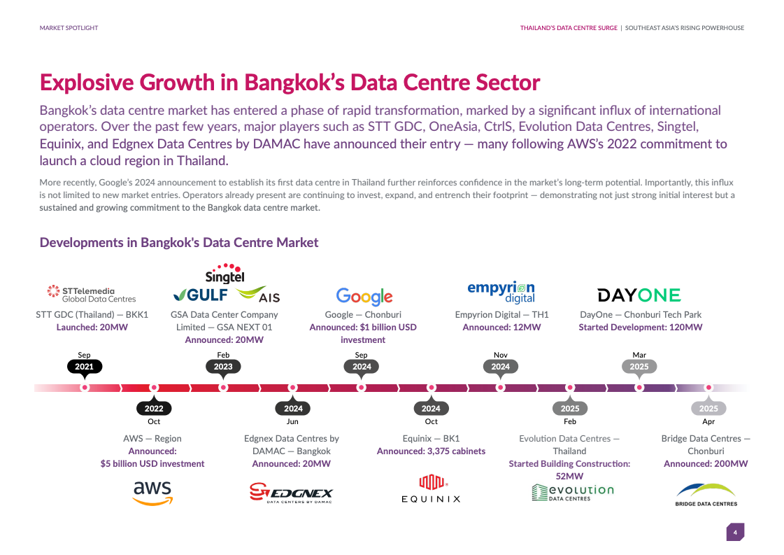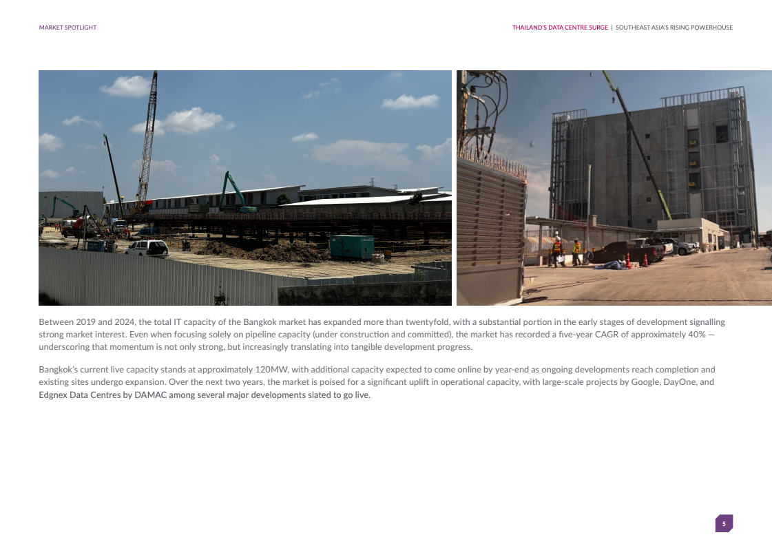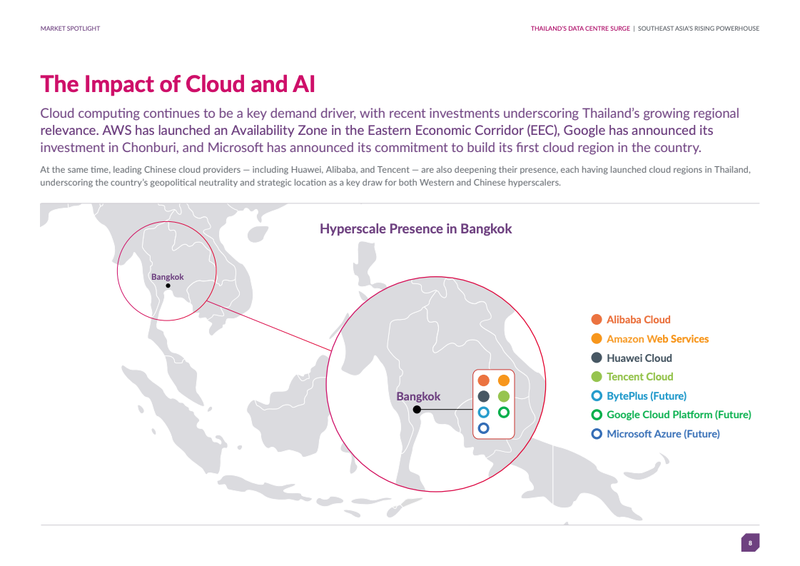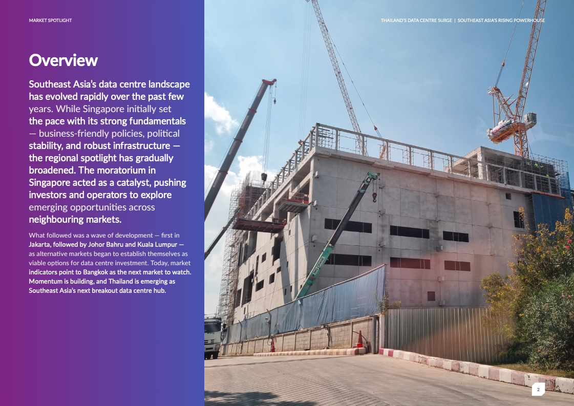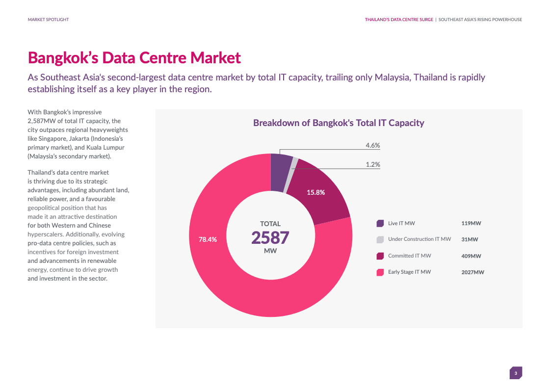 曼谷拥有总计2,587兆瓦IT容量,其中早期阶段项目2,027兆瓦、已承诺409兆瓦、在建31兆瓦、现网119兆瓦。这一规模已超越新加坡、雅加达和吉隆坡,成为区域第二大市场,仅次于马来西亚全国水平。