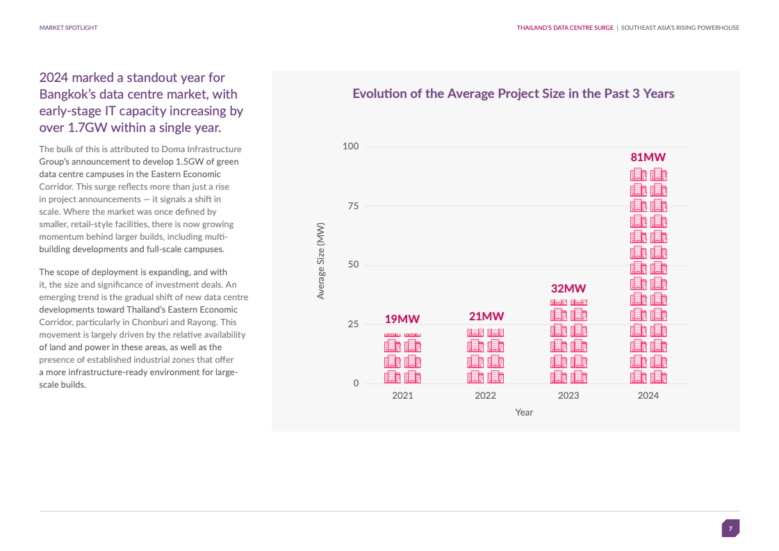 2024年曼谷早期阶段容量同比增1.7GW,主要因Doma Infrastructure Group在东部经济走廊布局1.5GW绿色园区。平均项目规模亦由2021年的19兆瓦增至2024年的81兆瓦,表明从零散小型设施向全规模园区进阶。