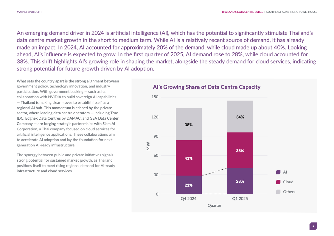 云计算与人工智能成为需求双轮驱动。2024年AI需求占比约20%,云占40%;2025年一季度AI增至28%,云占38%,显示AI正在快速拉动市场容量增长。政府携手英伟达共建主权AI能力,多家运营商与本土AI企业合作,推动AI就绪型基础设施建设。