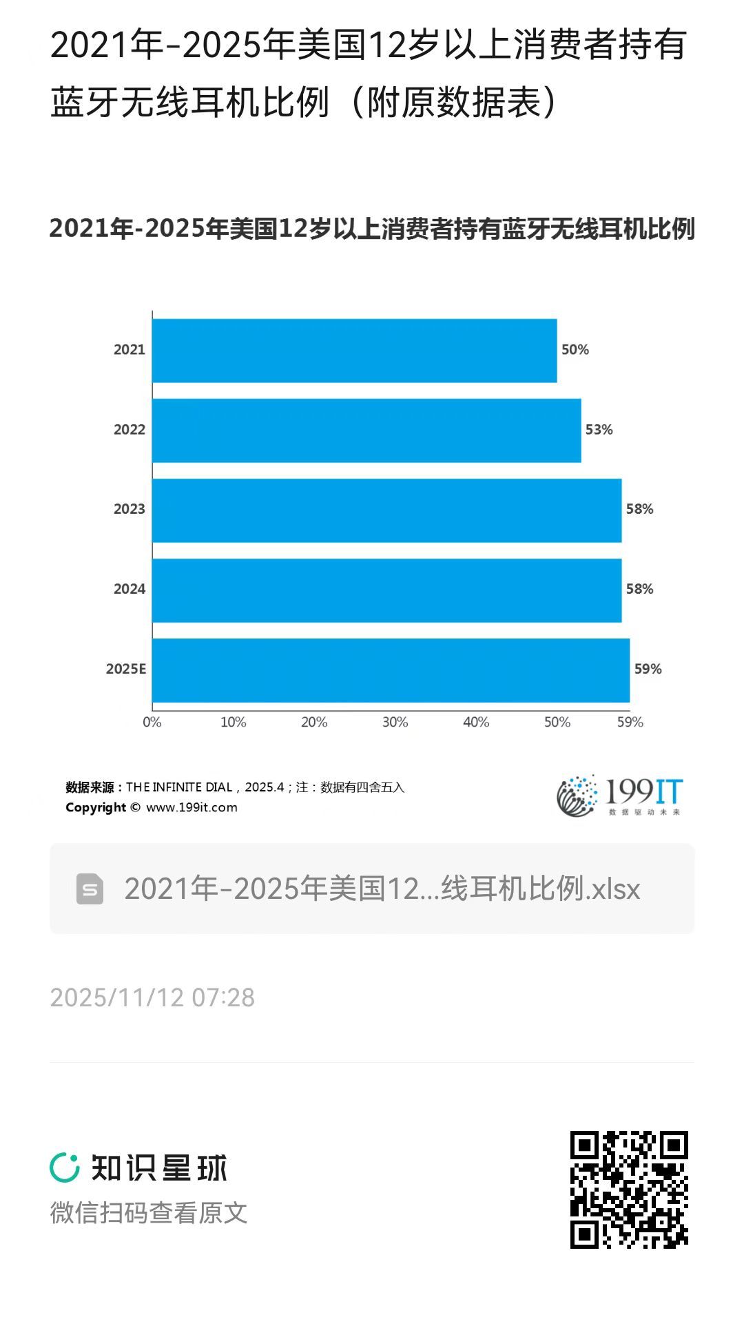 2021年-2025年美国12岁以上消费者持有蓝牙无线耳机比例(附原数据表) ​​​