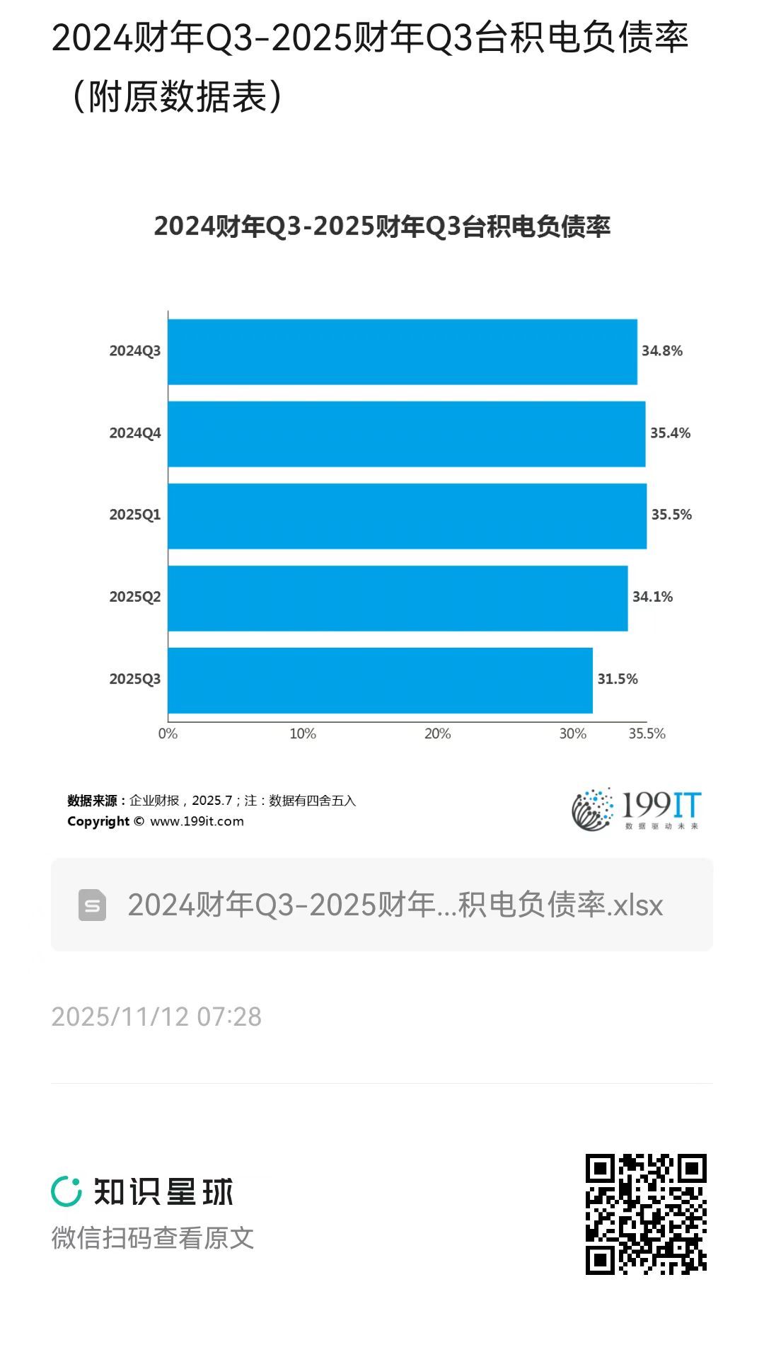 2024财年Q3-2025财年Q3台积电负债率(附原数据表) ​​​
