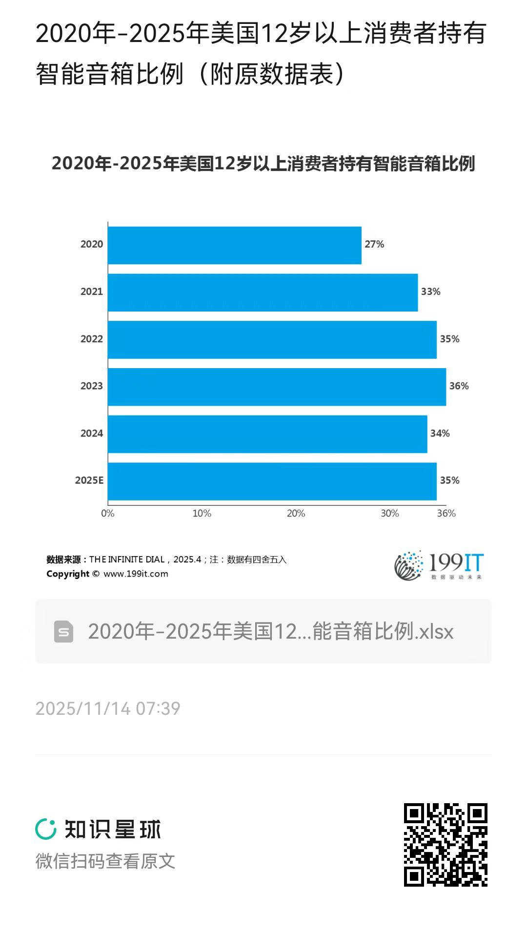 2020年-2025年美国12岁以上消费者持有智能音箱比例(附原数据表) ​​​